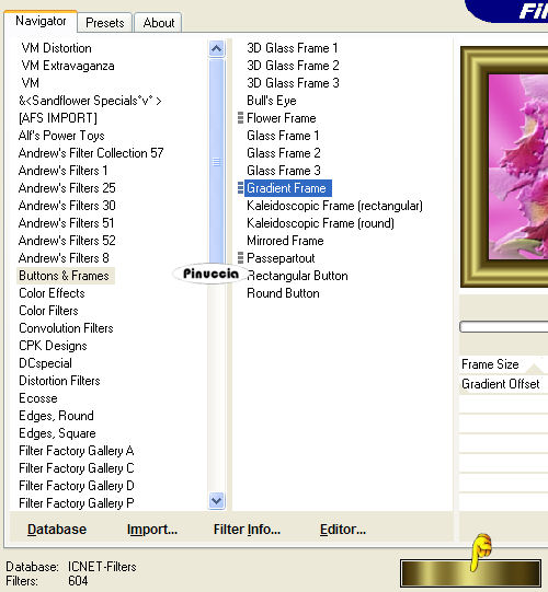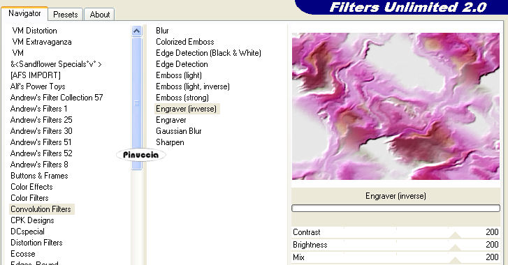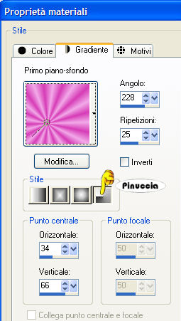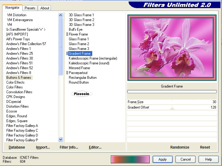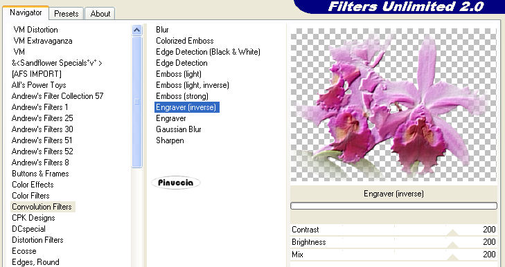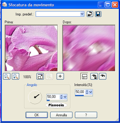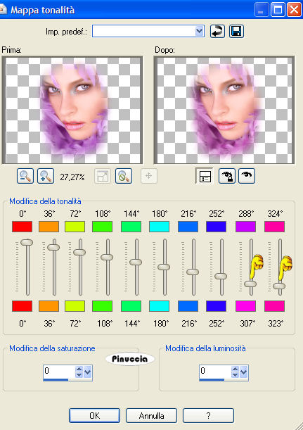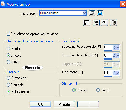 qui puoi trovare qualche risposta ai tuoi dubbi. Se l'argomento che ti interessa non è presente, ti prego di segnalarmelo. Questo tutorial è stato scritto e tradotto con PSP X, ma può essere eseguito anche con le altre versioni di PSP. Occorrente: Materiale qui Filtro: Filters Unlimited 2.0 qui 1. Apri il tube con le Orchidee. 2. Posizionati sul livello del tube e vai a Modifica>Copia e poi Modifica>Incolla come nuova immagine. Chiudi l'originale. Duplica la copia con shift+D, e minimizzala. Lavora sulla prima copia. 3. Scegli dal tube un colore chiaro come colore di primo piano (io ho scelto #f1a9e8), e un colore scuro come colore di sfondo (io ho scelto #d63cb6). Passa il colore di primo piano a Gradiente di primo piano/sfondo, con i seguenti settaggi: ![]() Livelli>Nuovo livello raster. Riempi il livello con questo gradiente.Regola>Sfocatura>Sfocatura gaussiana, raggio 15. ![]() Livelli>Disponi>Sposta giù. Immagine>Ridimensiona, a 350 pixels di larghezza, tutti i livelli selezionato. 4. Attiva il livello con le Orchidee. Effetti>Plugins>Filters Unlimited 2.0 - Convolution Filters - Engraver (inverse), tutto impostato su 200. ![]() Livelli>Unisci>Unisci visibile. 5. Effetti>Plugins>Filters Unlimited 2.0 - Buttons and Frames - Gradient Frame. clicca sull'icona del gradiente sul bordo in basso. ![]() e seleziona il gradiente n. 37, con i seguenti settaggi: ![]() La piccola immagine è finita. Mettila da parte per il momento. ![]() 6. Apri una nuova immagine BIANCA 700 x 500 pixels. Selezione>Seleziona tutto. Apri la seconda copia delle Orchidee che hai minimizzato all'inizio del tutorial e vai a Modifica>Copia. Torna all'immagine bianca e vai a Modifica>Incolla nella selezione. Selezione>Nessuna selezione. 7. Effetti>Effetti di immagine>Motivo unico. ![]() Regola>Sfocatura>Sfocatura da movimento: ![]() 8. Effetti>Plugins>Filters Unlimited 2.0 - Distorsione Filters - Smelter 1, con Intensity impostato su 60. ![]() Effetti>Plugins>Filters Unlimited - Convolution Filters - Engraver (inverse), tutto impostato su 200. ![]() Anche il tuo sfondo è finito. ![]() 9. Attiva la piccola immagine, l'immagine delle orchidee e il tube della donna, e sistemale come nella mia immagine, o secondo il tuo gusto. 10. Attiva il livello con la donna. Regola>Saturazione e tonalità>mappa tonalità. ![]() usando i cursori porta gli ultimi due settaggi a 309 e 324. Io non ci sono riuscita, perchè - come spesso capita - i cursori sono "maledetti", ma non ho notato differenze dall'esempio del tutorial originale. 11. Attiva il livello con le orchidee. Effetti>Plugins>Filters Unlimited 2.0 - Convolution Filters - Engraver (inverse), tutto settato a 200. Livelli>Unisci>Unisci visibile. 12. Effetti>Plugins>Filters Unlimited 2.0 - Button and Frames - Gradient Frame, come al punto 5, seleziona il gradiente n. 37, con i seguenti settaggi: ![]() 13. Attiva lo strumento Testo ,con la prima lettera a 100 pixels, e il rimanente testo a 30 pixels, scrivi il tuo testo. Livelli>Converti in livello raster. Effetti>Effetti 3D>Sfalsa ombra, con i seguenti settaggi, e con un colore scuro preso dall'immagine. ![]() Ripeti l'Effetto Sfalsa ombra. Aggiungi il tuo watermark. Livelli>Unisci>Unisci tutto, e salva in formato jpg. ![]() Se hai problemi o dubbi, o trovi un link non funzionante, scrivimi 14 Giugno 2007 |