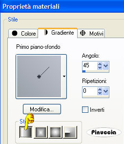 qui puoi trovare qualche risposta ai tuoi dubbi. Se l'argomento che ti interessa non è presente, ti prego di segnalarmelo. Materiale qui Apri i tubes in PSP. Scegli due colori dal tube. io ho scelto #9aa1a9 come colore di primo piano e #bdc1cd come colore di sfondo. Passa il colore di primo piano a Gradiente di primo piano/sfondo, stile lineare, con i seguenti settaggi: ![]() Apri una nuova immagine trasparente 700 x 500 pixels, e riempila con il gradiente.Attiva "overlayOriginal" e vai a Modifica>Copia. Torna al tuo lavoro e vai a Modifica>Incolla>Incolla come nuovo livello. Attiva "You-overlay" e vai a Modifica>Copia. Torna al tuo lavoro e vai a Modifica>Incolla>Incolla come nuovo livello. Attiva il tube "Mtm_Vector64-Tree lines" e vai a Modifica>Copia. Sposta il tube a inistra.Effetti>Effetti 3D>Sfalsa ombra, con i seguenti settaggi, colore nero: ![]() Attiva il tube "Frame Original" e vai a Modifica>Copia. Torna al tuo lavoro e vai a Modifica>Incolla>Incolla come nuovo livello. Sposta la cornice a destra.Attiva il file di sfondo Swanja_BirdOnbeach e vai a Modifica>Copia. Torna al tuo lavoro e vai a Modifica>Incolla>Incolla come nuovo livello. Posiziona il tube nella cornice.Livelli>Disponi>Sposta giù. Attiva il livello superiore. Attiva originalstitch e vai a Modifica>Copia. Torna al tuo lavoro e vai a Modifica>Incolla>Incolla come nuovo livello. Sposta il tube nell'angolo in basso a sinistra della cornice.Effetti>Effetti 3D>Sfalsa ombra, con i settaggi precedenti. Livelli>Duplica. Immagine>Ruota per gradi, 90 gradi a destra. ![]() Sposta il duplicato nell'angolo in alto a destra della cornice.E' tutto a posto? Se necessario, puoi ancora spostare gli elementi della tua tag, per sistemarli meglio. Livelli>Unisci>Unisci tutto. Aggiungi il tuo nome o il tuo watermark e, se vuoi, ridimensiona l'immagine. Per il nome ho usato il font ObetteScriptSSK. ![]() ![]() Se hai problemi o dubbi, o trovi un link non funzionante, o anche soltanto per un saluto, scrivimi. 18 Marzo 2007 |