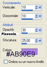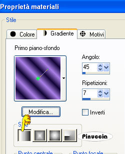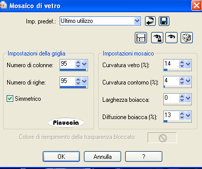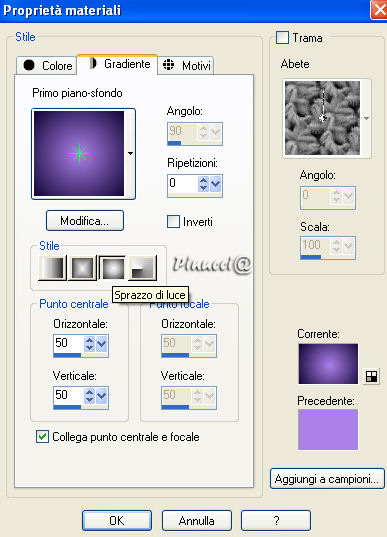 qui puoi trovare qualche risposta ai tuoi dubbi. Se l'argomento che ti interessa non è presente, ti prego di segnalarmelo. Materiale qui I bel tube del fiore è di Alejandra Rosales. Metti la maschera Diamantlijn nella cartella Maschere di PSP. Filtro Screenworks qui Imposta il colore di primo piano con #AB80E9, e il colore di sfondo con #110535 Passa il colore di primo piano a Gradiente di primo piano/sfondo, con i seguenti settaggi: ![]() 1. Apri una nuova immagine trasparente 600 x 450 pixels, e riempila con il gradiente.2. Effetti>Plugins>Screenworks - Pixel Shade. 3. Riporta il colore di primo piano impostato sul colore #ab80e9. ![]() 4. Livelli>Nuovo livello raster. Riempi il nuovo livello con il colore di primo piano.5. Livelli>Carica/Salva maschera>Carica maschera da disco. Cerca e carica la maschera Diamantlijn. ![]() 6. Livelli>Elimina e rispondi sì alla domanda "Unire la maschera nel livello corrente?". ![]() 7. Attiva il livello raster e vai a Regola>Messa a fuoco>Metti a fuoco, e ripeti. 8. Effetti>Effetti 3D>Sfalsa ombra, con i seguenti settaggi. ![]() 9. Immagine>Ridimensiona, a 450 pixels di larghezza, tutti i livelli selezionato. 10. Regola>Messa a fuoco>Metti a fuoco (soltanto il livello Raster 2). 11. Livelli>Unisci>Unisci tutto. Metti da parte l'immagine per il momento. 12. Imposta il colore di primo su Gradiente, con le seguenti impostazioni: ![]() 13. Apri una nuova immagine trasparente 600 x 450 pixels, e riempila con il gradiente.14. Effetti>Effetti di bordo>Aumenta di più, e ripeti una volta. 15. Livelli>Nuovo livello raster. Riempi il nuovo livello con il colore #000000.Abbassa l'opacità di questo livello all'80%. 16. Riprendi l'immagine che hai messo da parte e vai a Modifica>Copia. Torna al tuo lavoro e vai a Modifica>Incolla>Incolla come nuovo livello. Spostala in basso a sinistra.17. Apri il tube con il fiore e vai a Modifica>Copia. Torna al tuo lavoro e vai a Modifica>Incolla>Incolla come nuovo livello. 18. Effetti>Effetti 3D>Sfalsa ombra, con i seguenti settaggi: ![]() 19. Ripeti l'Effetto sfalsa ombra, ma cambiando verticale e orizzontale a -10 e -20. ![]() 20. Livelli>Unisci>Unisci visibile. 21. Imposta il colore di primo piano con il Gradiente iniziale. 22. Attiva lo strumento Selezione , rettangolo,e traccia una piccola striscia come mostrato nella schermata sotto. ![]() 23. Livelli>Nuovo livello raster. Riempi con il gradiente.Selezione>Nessuna selezione. 24. Effetti>Effetti di trama>Mosaico di vetro, con i seguenti settaggi: ![]() 25. Livelli>Duplica. 26. Sposta le strisce, come mostrato nella schermata sotto:![]() 27. Livelli>Unisci>Unisci tutto. 28. Immagine>Aggiungi bordatura, 1 pixel, simmetriche, con il colore di primo piano. Immagine>Aggiungi bordatura, 8 pixels, simmetriche, con il colore di sfondo. 29. Seleziona il bordo con la bacchetta magica ![]() 30. Effetti>Effetti di trama>Veneziana, con i seguenti settaggi: ![]() 31. Regola>Messa a fuoco>Metti a fuoco, due volte. 32. Immagine>Aggiungi bordatura, 1 pixel, simmetriche, con il colore di primo piano. 33. Apri il tube "hoekie" e vai a Modifica>Copia. Torna al tuo lavoro e vai a Modifica>Incolla>Incolla come nuovo livello. Posizionalo nell'angolo in alto a sinistra.Livelli>Duplica. Immagine>Rifletti. Livelli>Duplica. Immagine>Capovolgi. Livelli>Duplica. Immagine>Rifletti. 34. Livelli>Unisci>Unisci tutto. L'immagine è finita. Se vuoi eseguire lo script di Jeannette, hai bisogno anche di un'immagine di sfondo, e dell'immagine della farfalla che hai trovato con il materiale. per l'immagine di sfondo ho aperto una nuova immagine 100x100 pixels, e l'ho riempita , con il gradiente usato al passo 12.Per eseguire lo script Apri lo script vuoto di Jeannette che trovi qui (ho tolto il link, perchè il sito è chiuso, ma mantengo le istruzioni che possono servire per casi simili) e segui i preliminari descritti alla fine di questo tutorial, fino all'inserimento dello sfondo-suono. Dopo aver inserito lo sfondo-suono, dovrai indicare allo script dove trovare le immagini. Clicca su Origine e identifica i punti di inserimento dei vari elementi dello script. Se hai messo tutti i file in una cartella, il percorso del suono ti servirà da guida per l'inserimento degli altri files: ti basterà cambiare l'ultima parte: il nome e l'estensione. Nella schermata sotto è indicato il punto in cui dovrai inserire l'immagine di sfondo. ![]() Nella schermata sotto è indicato il punto in cui dovrai inserire il percorso dell'immagine principale. ![]() Nella schermata sotto è indicato il punto in cui dovrai inserire il percorso della farfalla. (ricorda che l'estensione di questo file è .gif). ![]() Ricorda che, contemporaneamente, puoi controllare il risultato andando su Anteprima. fai molta attenzione alle estensioni dei files e alle maiuscole-minuscole, che devono essere corrette, altrimenti lo script non troverà le immagini da inserire Clicca adesso sulla linguetta Modifica, per aggiungere il testo. clicca due volte all'interno del riquadro. Apparirà la cornice che ti dà il via libera per sostituire il testo esistente e aggiungere il tuo. ![]() Quando hai finito, clicca all'esterno e la cornice sparirà. Il tuo messaggio con lo script è pronto per il tasto Invia. Se non vuoi spedirlo e vuoi soltanto tenerlo per te, vai a File>Salva con nome e mettilo in una cartella a tua scelta. Ricordati, però, che quando vorrai rivedere lo script, i files devono trovarsi nello stesso posto. Se nel frattempo li avrai spostati, vedrai soltanto delle crocette rosse. Avvertimento: non devi preoccuparti se in Modifica non vedrai il messaggio come dovrebbe essere (per fare questo devi andare in Anteprima). Ricorda ancora che per inviare il messaggio ti devi posizionare su Modifica. ![]() Se hai problemi o dubbi, o trovi un link non funzionante, o anche soltanto per un saluto, scrivimi. 19 Aprile 2007 |