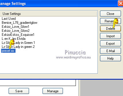 clicca su Manage, seleziona il preset e clicca su Delete (Cancella), e rispondi sì alla domanda se se sei sicuro di volerlo cancellare.