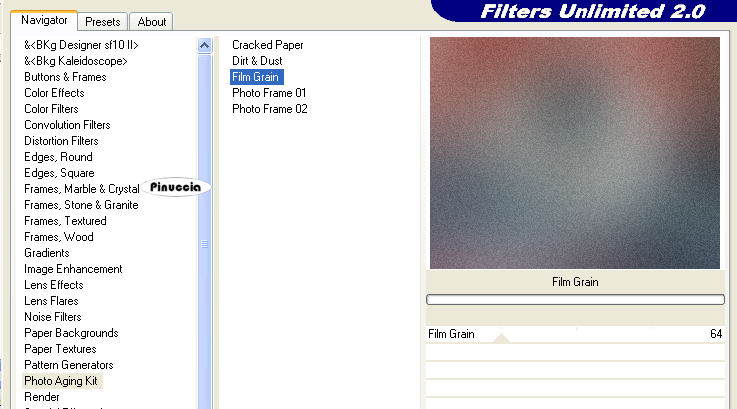 Effetti>Plugins>Filters Unlimited - Photo Aging Kit - Film Grain, con i settaggi standard.
