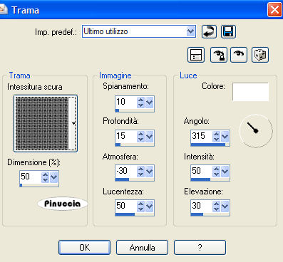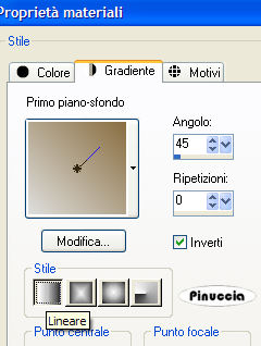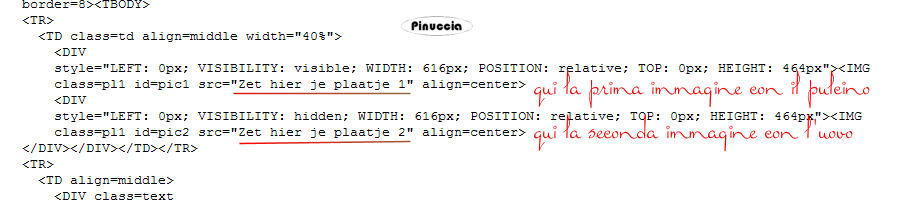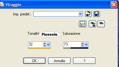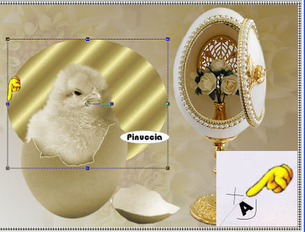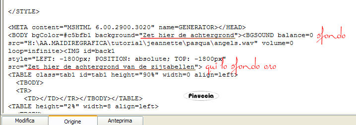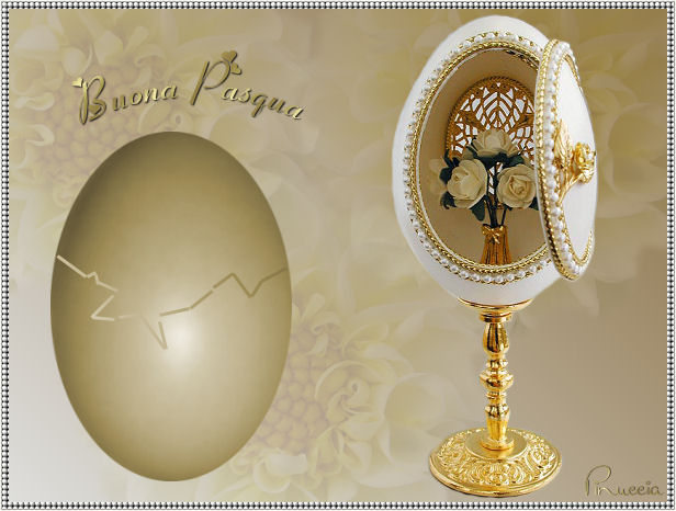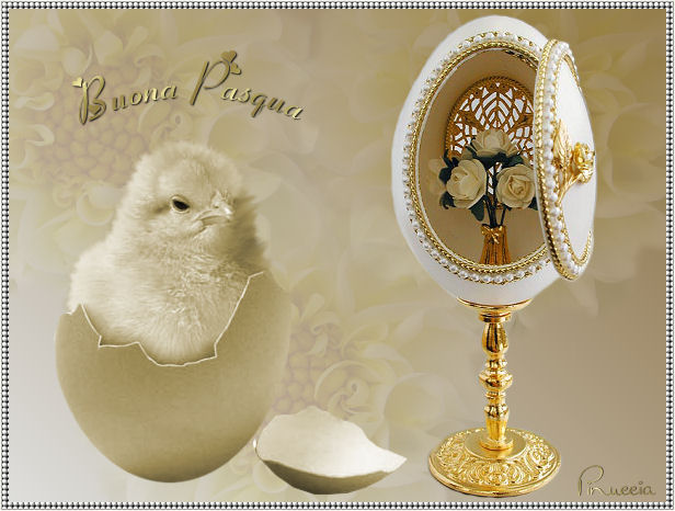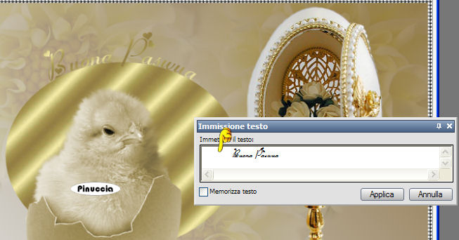 qui puoi trovare qualche risposta ai tuoi dubbi. Se l'argomento che ti interessa non è presente, ti prego di segnalarmelo. Materiale qui I bei tubes sono di Fredo, Kaedee e di Jeannette Imposta il colore di primo piano con #896e41, e il colore di sfondo con #dededc. Passa il colore di primo piano a gradiente di primo piano/sfondo, con i seguenti settaggi: ![]() 1. Apri una nuova immagine trasparente 600 x 450 pixels, e riempila con il gradiente.2. Apri il tube del fiore Kaedee_FlowersDahlia3 e vai a Modifica>Copia. Torna al tuo lavoro e vai a Modifica>Incolla>Incolla come nuovo livello. Abbassa l'opacità di questo livello al 22%. 4. Livelli>Duplica e ripeti. Disponi i tre fiori sull'immagine piacevolmente,vedi il mio esempio. 5. Livelli>Unisci>Unisci visibile. 6. Apri il tube Fabergè_ei. Immagine>Ridimensiona, a 450 pixels di altezza, mantieni proporzioni selezionato. 7. Modifica>Copia. Torna al tuo lavoro e vai a Modifica>Incolla>Incolla come nuovo livello. Sposta l'uovo a destra.8. Effetti>effetti 3D>Sfalsa ombra, con i seguenti settaggi: ![]() 9. Livelli>Unisci>Unisci visibile. 10. Immagine>Aggiungi bordatura, 7 pixels, simmetriche, con il colore nero. 11. Seleziona il bordo con la bacchetta magica ,e riempilo con il colore di sfondo.12. Effetti>Effetti di trama>Trama: apri il menu delle trame cliccando sulla freccia a fianco del box, cerca e seleziona Intessitura scura, con i seguenti settaggi: ![]() 13. Regola>Messa a fuoco>Metti a fuoco. Selezione>Nessuna selezione. 14. Immagine>Aggiungi bordatura, 1 pixel, simmetriche, con il colore nero. Seleziona il bordo con la bacchetta magica ![]() Imposta il colore di primo piano su Motivi e seleziona un motivo oro. Riempi il bordo con il motivo oro.15. Selezione>Nessuna selezione. 16. Apri il tube di Fredo con il pulcino. Elimina i livelli del watermark e dello sfondo. 17. Regola>Saturazione e tonalità>Viraggio: ![]() 18. Modifica>Copia. Torna al tuo lavoro e vai a Modifica>Incolla>Incolla come nuovo livello. Sposta il pulcino a sinistra.19. Chiudi il colore di primo piano e imposta il colore di sfondo sul motivo oro. 20. Nella paletta dei livelli attiva il livello inferiore. 21. Attiva lo strumento Forme predefinite ![]() e seleziona l'ellisse. Traccia un ovale, più o meno come nel mio esempio: ![]() 22. Attiva lo strumento Testo e scegli un font.Io ho usato Fiolex Girls, dimensione 48. 23. Posiziona il mouse sul bordo dell'ovale e quando vedrai una A con sotto un mezzo cerchio, clicca con il tasto sinistro del mouse. 24. Scrivi il testo e, per centrarlo nell'ovale, posizionati davanti alla scritta e premi la barra spaziatrice, finchè non sarai soddisfatto della posizione del testo. Applica. ![]() Nella paletta dei livelli chiudi il livello dell'ellisse. ![]() Livelli>Converti in livello raster. 25. Effetti>Effetti 3D>Sfalsa ombra: ![]() 26. Posiziona il testo come preferisci.Questo è il momento, se vuoi, per aggiungere il tuo nome o il tuo watermark. 27. Duplica l'immagine con shift D. Chiameremo il duplicato immagine 2. 28. Torna all'immagine 1. Livelli>Unisci>Unisci tutto. 29. Passa all'immagine 2. All'immagine 2 dovrai sostituire il tube del pulcino con il tube dell'uovo (ei), posizionando l'uovo esattamente nella medesima posizione dell'uovo con il pulcino, che dovrà essere poi eliminato. Per fare questa operazione nel modo migliore, fai come segue: Abbassa l'opacità del livello del tube con il pulcino. Apri il tube dell'uovo (ei) e vai a Modifica>Copia. Torna all'immagine 2 e vai a Modifica>Incolla>Incolla come nuovo livello. Posiziona l'uovo.Per controllare la precisione del posizionamento dell'uovo, clicca sull'occhio di uno dei due livelli ripetutamente, (come un accendere-spegnere-accendere-spegnere....) se vedi che l'uovo ha degli spostamenti, anche minimi, vuol dire che la posizione non è corretta. Prova finchè, aprendo e chiudendo la visibilità del livello, vedrai l'uovo immobile. A questo punto elimina il livello con il pulcino. Livelli>Unisci>Unisci tutto. A questo punto hai le due immagini per creare lo script. ![]() ![]() Per lo script, avrai anche bisogno di due immagini di sfondo. Uno sfondo immagine e uno sfondo oro per le strisce laterali dello script. Se vuoi fare come ho fatto io: Apri una nuova immagine trasparente 100 x 100 pixels e riempila con un motivo oro. Questo sfondo servirà per le tabelle laterali dello script. Salva in formato jpg. Per il secondo sfondo: Apri una nuova immagine trasparente 200 x 200 pixels, e riempila con il gradiente. Apri il tube del fiore e vai a Modifica>Copia. Torna all'immagine e vai a Modifica>Incolla>Incolla come nuovo livello. Livelli>Unisci>Unisci tutto. Effetti>Effetti di immagine>Motivo unico, con i settaggi standard. Effetti>Plugins>FM Tile Tools>Blend Emboss, settaggi standard. Salva in formato jpg. Apri lo script di Jeannette che trovi qui (ho tolto il link, perchè il sito è chiuso, ma mantengo le istruzioni che possono servire per casi simili) e segui i preliminari descritti alla fine di questo tutorial, fino all'inserimento dello sfondo-suono. Dopo aver inserito lo sfondo-suono, dovrai indicare allo script dove trovare le immagini. Clicca su Origine e identifica i punti di inserimento dei vari elementi dello script. Nella schermata sotto, sono indicati i punti di inserimento dei files dello script. Devi cancellare la scritta tra le virgolette e inserire il tuo percorso: Se hai messo tutti i file in una cartella, il percorso del suono ti servirà da guida per l'inserimento degli altri files: ti basterà cambiare l'ultima parte: il nome e l'estensione. Nella schermata sotto sono indicati i punti di inserimento delle due immagini di sfondo. ![]() Nella schermata sotto sono indicati i due punti di inserimento delle immagini principali. ![]() Ricorda che, contemporaneamente, puoi controllare il risultato andando su Anteprima. fai molta attenzione alle estensioni dei files e alle maiuscole-minuscole, che devono essere corrette, altrimenti lo script non troverà le