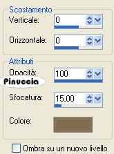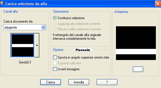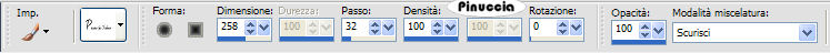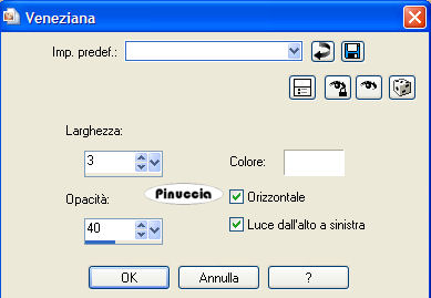 qui puoi trovare qualche risposta ai tuoi dubbi. Se l'argomento che ti interessa non è presente, ti prego di segnalarmelo. Questo tutorial è stato scritto con PSP 9, ma può essere eseguito anche con le altre versioni di PSP. Materiale qui Metti il pennello nella cartella dei pennelli. se hai problemi con i pennelli, vedi qui Per usare il pennello di questo tutorial, ho usato l'importazione. 1. Apri l'immagine pfgerda.pspimage. Questa sarà la tua area di lavoro. L'immagine non è vuota, ma contiene le selezione del canale alfa. Riempi l'immagine con il colore bianco.Imposta il colore di primo piano con #c5af97. Livelli>Nuovo livello raster. Selezione>Carica/Salva selezione>Carica selezione da canale alfa. E' già presente la selezione GerdaS1. Clicca ok. ![]() Riempi con il colore di primo piano.Selezione>Nessuna selezione. Abbassa l'opacità di questo livello al 70%. 2. Apri l'immagine Photo278. Immagine>Aggiungi bordatura, 1 pixel, simmetriche, con il colore #c5af97. Immagine>Aggiungi bordatura, 1 pixel, simmetriche, con il colore bianco. Immagine>Aggiungi bordatura, 1 pixel, simmetriche, con il colore #c5af97. Modifica>Copia, e minimizza l'immagine perchè ti servirà ancora. Torna al tuo lavoro e vai a Modifica>Incolla>Incolla come nuovo livello. Immagine>Ruota>Ruota per gradi, 15 gradi a sinistra, tutti i livelli non selezionato. Sposta l'immagine a sinistra contro il bordo.Effetti>Effetti 3D>Sfalsa ombra, con i seguenti settaggi, colore #836b4e. ![]() Livelli>Nuovo livello raster. Imposta il colore di primo piano con #c5af97. Selezione>Carica/Salva selezione>Carica selezione da canale alfa. Cerca e carica la prima selezione GerdaS3. ![]() Riempi la selezione con il colore di primo piano.Selezione>Nessuna selezione. 3. Livelli>Nuovo livello raster. Il colore di primo piano è sempre impostato con #c5af97. Selezione>Carica/Salva selezione>Carica selezione da canale alfa. Cerca e carica la seconda selezione Gerda S3. ![]() Riempi la selezione con il colore di primo piano.Effetti>effetti di trama>Veneziana, con i seguenti settaggi, colore bianco. ![]() Selezione>Nessuna selezione. 4. Attiva nuovamente l'immagine con la foto e vai a Modifica>Copia. Torna al tuo lavoro e vai a Modifica>Incolla>Incolla come nuovo livello. Spostala a sinistra, vedi il mio esempio.![]() Effetti>Effetti 3D>Sfalsa ombra, con i seguenti settaggi, colore #836b4e. ![]() Livelli>Unisci>Unisci visibile. 5. Apri il tube naamkaartjegerda121 e vai a Modifica>Copia. Torna al tuo lavoro e vai a Modifica>Incolla>Incolla come nuovo livello. Spostalo in alto a destra.Imposta il colore di sfondo con #836b4e. Attiva lo strumento Testo ,seleziona il font Sloopscript One e scrivi il tuo nome sull'etichetta. Livelli>Nuovo livello raster. Imposta il colore di primo piano con #836b4e. Attiva lo strumento Pennello ,cerca e seleziona il pennello gerdawords129, dimensione 258, modalità di miscelatura scurisci: ![]() e applicalo in basso a destra. Effetti>effetti 3D>Sfalsa ombra, con i seguenti settaggi, colore nero: ![]() 6. Apri il tube del fiocco dreamdaisy e vai a Modifica>Copia. Torna al tuo lavoro e vai a Modifica>Incolla>Incolla come nuovo livello. Regola>Saturazione e tonalità>Viraggio: ![]() Immagine>Ridimensiona, 3 volte all'85%, tutti i livelli non selezionato. Immagine>Ruota>Ruota per gradi, 15 gradi a sinistra, tutti i livelli non selezionato. Sposta il fiocco nell'angolo in alto a sinistra.Effetti>Effetti 3D>Sfalsa ombra, con i seguenti settaggi, colore nero: ![]() Finito. Salva in formato jpg. ![]() Se hai problemi o dubbi, o trovi un link non funzionante, o anche soltanto per un saluto, scrivimi 15 Giugno 2007 |