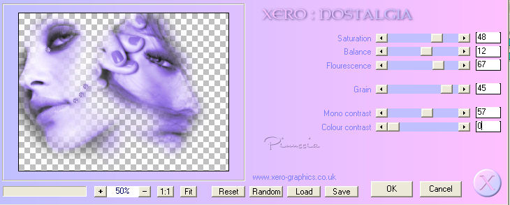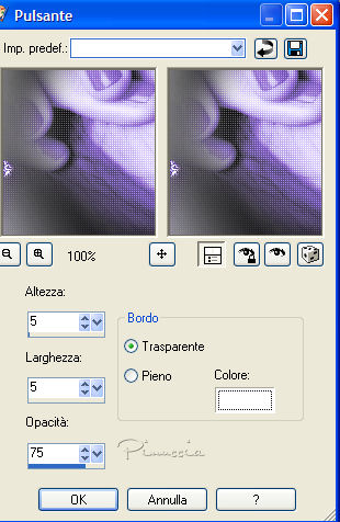 qui puoi trovare qualche risposta ai tuoi dubbi. Se l'argomento che ti interessa non è presente, ti prego di segnalarmelo. Occorrente: Materiale qui Filtri: Penta.com - Color dot color dot Xero - Nostalgia qui Apri le immagini in PSP. Metti il pennello nella cartella Pennelli di Psp. 1. Apri una nuova immagine trasparente 600 x 450. Riempi l'immagine con il colore NERO.2. Apri il primo tube e vai a Modifica>Copia. Torna al tuo lavoro e vai a Modifica>Incolla>Incolla come nuovo livello. Spostalo a sinistra dell'immagine. 3. Apri il secondo tube e vai a Modifica>Copia. Torna al tuo lavoro e vai a Modifica>Incolla>Incolla come nuovo livello. Spostalo a destra dell'immagine. 4. Chiudi il livello di sfondo. Livelli>Unisci>Unisci visibile. 5. Effetti>Plugins>Penta.com - color dot, con i settaggi standard. ![]() Riapri il livello di sfondo e vai a Livelli>Unisci>Unisci tutto. 6. Effetti>Plugins>Xero - nostalgia, con i seguenti settaggi: ![]() 7. Selezione>Seleziona tutto. Selezione>Modifica>Contrai di 7 pixels. Selezione>Inverti. Riempi la selezione con il colore #5f5773.8. Selezione>Inverti. 9. Effetti>Effetti 3d>Pulsante, con i seguenti settaggi: ![]() Selezione>Nessuna selezione. 10. Attiva lo strumento Pennello e cerca