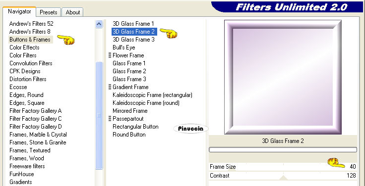 Effetti>Plugins>FIlters Unlimited 2 - Buttons & Frames - 3DGlass Frame 2: