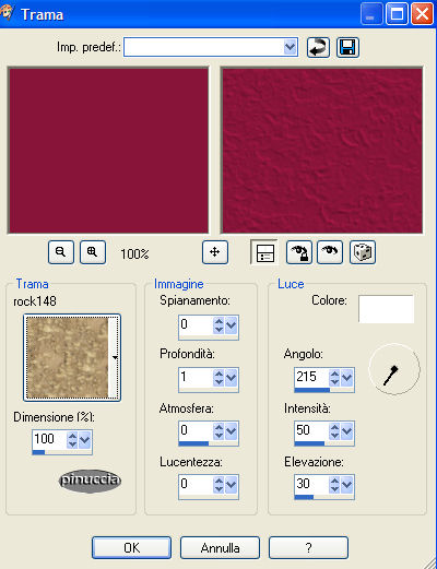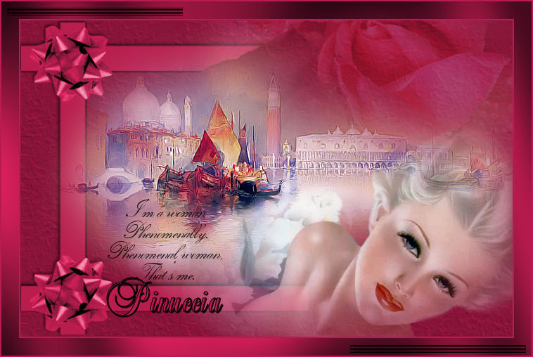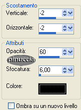 qui puoi trovare qualche risposta ai tuoi dubbi. Se l'argomento che ti interessa non è presente, ti prego di segnalarmelo. Snakelady ha scritto questo tutorial per me, come affettuoso ringraziamento per le mie traduzioni. E' stata una graditissima sorpresa e un bel regalo di Natale. Grazie, Snake. Snakelady heeft geschreven deze tutorial voor ik. It has been a big surprise and a beautiful Christmas' gift. Thank you very much, Snake. Hugs and kiss. Pinuccia. Occorrente: Materiale qui Filtro Greg's Factory Output 2 qui Metti i pennelli nella cartella Pennelli e la trama nella cartella Trame. Apri i tubes in PSP. Apri una nuova immagine trasparente 700 x 450 pixels. Scegli un colore dal tube o dall'immagine di sfondo come colore di primo piano (io ho scelto #89143a) e riempi l'immagine con questo colore.Imposta il colore di sfondo con #b81b51. Effetti>Effetti di trama>Trama: ![]() Apri il tube del nastro (Mariel_2006-12decembre) e vai a Modifica>Copia. Torna al tuo lavoro e vai a Modifica>Incolla>Incolla come nuovo livello. Spostalo in basso a sinistra.Livelli>Duplica. Immagine>Capovolgi. Chiudi il livello di sfondo e attiva uno degli altri livelli. Livelli>Unisci>Unisci visibile. Effetti>Effetti 3D>Sfalsa ombra, con i seguenti settaggi, colore nero: ![]() Apri il misted del paesaggio (Marif_2006_decembre_miste_paysage051) e vai a Modifica>Copia. Torna al tuo lavoro e vai a Modifica>Incolla>Incolla come nuovo livello. Spostalo a destra, un po' più in alto.Vedi il mio esempio. Apri il tube della donna (MC1173) e vai a Modifica>Copia. Torna al tuo lavoro e vai a Modifica>Incolla>Incolla come nuovo livello. Spostalo in basso a destra.Apri misted della rosa (Marif_2006_novembre_misted_fleurs120) e vai a Modifica>Copia. Torna al tuo lavoro e vai a Modifica>Incolla>Incolla come nuovo livello. Spostalo in alto a destra.Abbassa l'opacità di questo livello al 30%. Attiva il livello uniti (quello del nastro). Attiva lo strumento Gomma ![]() e cancella attentamente in alto e in basso la parte di nastro visibile. ![]() Controlla che tutto sia in ordine. Se necessario, puoi ancora spostare gli elementi della tua tag. Livelli>Unisci>Unisci tutto. Immagine>Aggiungi bordatura, 2 pixels, simmetriche, con il colore #b81b51. Immagine>Aggiungi bordatura, 25 pixels, simmetriche, con il colore #89143a. Seleziona questo bordo con la bacchetta magica , sfumatura 0.Effetti>Plugins>Greg's Factory Output 2 - Poolshadow: ![]() Selezione>Nessuna selezione. Immagine>Aggiungi bordatura, 2 pixels, simmetriche, con il colore #b81b51. Attiva lo strumento Pennello ![]() cerca e seleziona il pennello @cb-prose3. Imposta il colore di primo piano sul nero e applica il pennello sull'immagine. Cerca e seleziona il pennello 9-marijke e applicalo sul bordo in alto a sinistra e in basso a destra. Aggiungi il tuo nome o il tuo watermark. Io ho usato il font LeiScriptSSK. ![]() Se hai problemi o dubbi, o trovi un link non funzionante, o anche soltanto per un saluto, scrivimi. Dicembre 2006 |