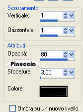 qui puoi trovare qualche risposta ai tuoi dubbi. Se l'argomento che ti interessa non è presente, ti prego di segnalarmelo. Questo tutorial è stato scritto con PSP 9, ma può essere eseguito anche con le altre versioni di PSP. Occorrente: Materiale qui Per questo tutorial ho usato tubes di Alejandra Rosales, e diversi scraptubes* Per favore, rispetta il lavoro degli autori e mantieni i tubes al loro stato originale. Attenzione, i livelli dei tubes sono chiusi. Filtri: Graphics Plus qui Penta.com - VTR 2 qui Bordermania qui *I tubes per lo scrap sono stati acquistati personalmente dall'autrice del tutorial. Puoi utilizzarli soltanto per questo tutorial, e per il tuo uso personale. Non puoi offrirli in vendita, o condividerli, o usarli per i tuoi tutorial, o per altri scopi commerciali. Leggi attentamente le condizioni e i termini d'uso dei disegnatori di scrap. altrimenti l'autrice smetterà di scrivere tutorial di scrap. Grazie per la tua collaborazione. 1. Apri una nuova immagine trasparente 640 x 480 pixels. Selezione>Seleziona tutto. 2. Apri "RH-Achtergrond_01", e vai a Modifica>Copia. Torna al tuo lavoro e vai a Modifica>Incolla>Incolla nella selezione. Selezione>Nessuna selezione. Apri "RH-Achtergrond_02", e vai a Modifica>Copia. Torna al tuo lavoro e vai a Modifica>Incolla>Incolla come nuovo livello. Spostalo a sinistra, vedi l'esempio sotto:![]() 3. Effetti>Effetti 3D>Sfalsa ombra, con i seguenti settaggi: ![]() Ripeti l'Effetto Sfalsa ombra, ma cambiando verticale e orizzontale a -1. 4. Apri il tube "RH-Doodle", e vai a Modifica>Copia. Torna al tuo lavoro e vai a Modifica>Incolla>Incolla come nuovo livello. Sposta il tube in alto a destra.Effetti>Effetti 3D>Sfalsa ombra, con i settaggi precedenti. Cambia la modalità di miscelatura di questo livello in Luce netta, e abbassa l'opacità al 50%. ![]() 5. Apri il tube "RH-Curled_Ribbon", e vai a Modifica>Copia. Torna al tuo lavoro e vai a Modifica>Incolla>Incolla come nuovo livello. Spostalo in basso, sopra il bordo, come nell'esempio.![]() Effetti>Effetti 3D>Sfalsa ombra, con i seguenti settaggi: ![]() Ripeti l'Effetto Sfalsa ombra, ma cambiando verticale e orizzontale a -1. 6. Livelli>Duplica. Immagine>Capovolgi. 7. Apri il tube "RH-Ribbon", e vai a Modifica>Copia. Torna al tuo lavoro e vai a Modifica>Incolla>Incolla come nuovo livello. Spostalo a sinistra, vicino al bordo.![]() Effetti>Effetti 3D>Sfalsa ombra: ![]() 8. Apri il tube "RH-Frame", e vai a Modifica>Copia. Torna al tuo lavoro e vai a Modifica>Incolla>Incolla come nuovo livello. Non occorre spostarlo. E' già correttamente posizionato. Immagine>Ruota>Ruota per gradi, 3 gradi a destra. ![]() 9. Apri il tube "523 beauty red hair 2 ABR". Immagine>Ridimensiona, all'80%, ricampionamento bicubica. Immagine>Rifletti. Modifica>Copia. Torna al tuo lavoro e vai a Modifica>Incolla>Incolla come nuovo livello. Nella paletta dei livelli sposta questo livello sotto il livello della cornice. Immagine>Ruota>Ruota per gradi, 3 gradi a destra. 10. Attiva il livello superiore. Apri il tube "RH-Leaf_01", e vai a Modifica>Copia. Torna al tuo lavoro e vai a Modifica>Incolla>Incolla come nuovo livello. Sposta il tube in basso a destra, come nel mio esempio:![]() Effetti>Effetti 3D>Sfalsa ombra: ![]() Ripeti l'Effetto Sfalsa ombra, ma cambiando verticale e orizzontale a -1. 11. Apri il tube "RH-Leaf_02", e vai a Modifica>Copia. Torna al tuo lavoro e vai a Modifica>Incolla>Incolla come nuovo livello. Sposta il tube in basso sulla cornice.Effetti>Effetti 3D>Sfalsa ombra, con i settaggi precedenti. 12. Apri il tube "RH-Fiber", e vai a Modifica>Copia. Torna al tuo lavoro e vai a Modifica>Incolla>Incolla come nuovo livello. Spostalo in alto, contro il bordo.13. Apri il tube "RH-Ribbontie", e vai a Modifica>Copia. Torna al tuo lavoro e vai a Modifica>Incolla>Incolla come nuovo livello. Spostalo in alto a sinistra.Effetti>Effetti 3D>Sfalsa ombra, con i settaggi precedenti. 14. Controlla che tutto sia al posto giusto. Livelli>Unisci>Unisci tutto. 15. Imposta il colore di primo piano con #af6a4d, e il colore di sfondo con #523d3a. Passa il colore di primo piano a Gradiente di primo piano/sfondo: ![]() Immagine>Aggiungi bordatura, 5 pixels, simmetriche, con il colore scuro di sfondo. Seleziona il bordo con la bacchetta magica ![]() (sfumatura e tolleranza 0, antialias e interno selezionati). Effetti>Plugins>Graphics Plus - Cross Shadow, con i settaggi standard. ![]() 16. Effetti>Effetti 3D>Smusso a incasso: ![]() Selezione>Nessuna selezione. 17. Immagine>Aggiungi bordatura, 35 pixels, simmetriche, con il colore bianco. Seleziona il bordo con la bacchetta magica ,sfumatura e tolleranza 0, antialias e interno selezionati. Riempi la selezione con il gradiente.Effetti>Plugins>Penta.com - VTR2, con i settaggi standard. ![]() 18. Effetti>Plugins>Bordermania - Frame #2: ![]() Attiva lo strumento Testo , scegli un font e scrivi un testo nell'etichetta.Lo scrap è finito. Salva in formato jpg. ![]() Se hai problemi o dubbi, o trovi un link non funzionante, o anche soltanto per un saluto, scrivimi. 15 Giugno 2007 |