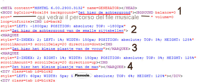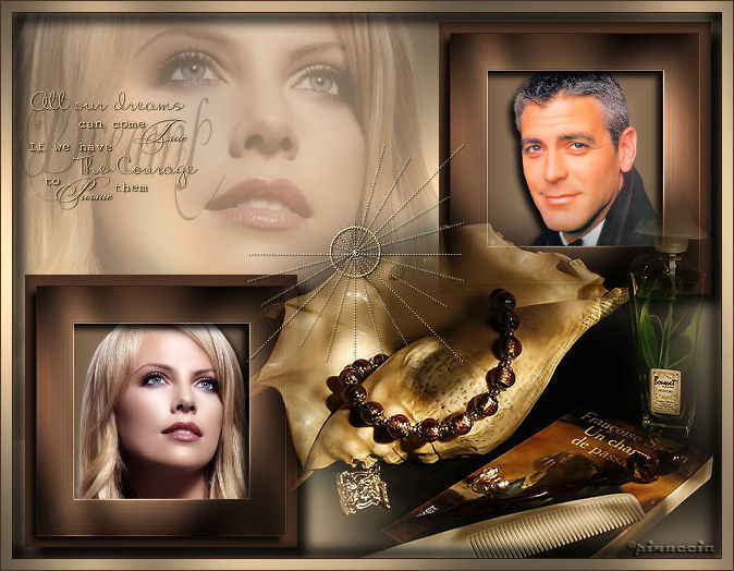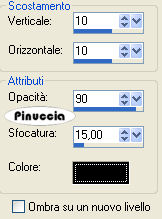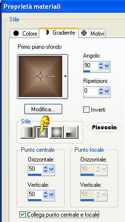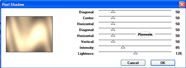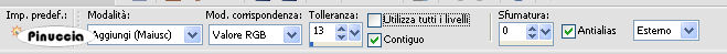 qui puoi trovare qualche risposta ai tuoi dubbi. Se l'argomento che ti interessa non è presente, ti prego di segnalarmelo. Occorrente: Materiale qui I tubes usati sono di Marif, Filly e di Jeannette. Non aprire il file sterretje.gif in PSP, è una gif che serve per lo script. Filtro: Greg's Factory Output II qui Imposta il colore di primo piano con #C2A987, e il colore di sfondo con #4C2F20. Passa il colore di primo piano a Gradiente di primo piano/sfondo, con i seguenti settaggi: ![]() 1. Apri una nuova immagine trasparente 450 x 450 pixels, e riempila con il gradiente.2. Attiva lo strumento Bacchetta magica , con i seguenti settaggi:![]() Clicca sulla parte chiara a circa mezzo centimetro dal bordo superiore sinistro: ![]() 3. Se la selezione ti appare diversa dall'esempio, annulla con Modifica>Annulla aziona Bacchetta magica e riprova. 4. Livelli>Nuovo livello raster. Riempi con il gradiente.5. Effetti>Plugins>Greg's Factory Output - Poolshadow, con i settaggi standard. ![]() 6. Effetti>Effetti 3D>Sfalsa ombra: ![]() 7. Effetti>Effetti di bordo>Aumenta di più. Selezione>Nessuna selezione. 8. Duplica l'immagine con shift+D e metti da parte la copia. 9. Apri il tube "Man" e vai a Modifica>Copia. Torna al tuo lavoro e vai a Modifica>Incolla>Incolla come nuovo livello. Immagine>Rifletti. Regola>Messa a fuoco>Metti a fuoco. 10. Effetti>Effetti 3D>Sfalsa ombra, con i settaggi usati al punto 6. 11. Nella paletta dei livelli sposta questo livello giù, in posizione centrale, in modo che l'uomo rimanga all'interno della cornice. 12. Livelli>Unisci>Unisci tutto. 13. Immagine>Aggiungi bordatura, 1 pixel, simmetriche, con il colore di sfondo. 14. Immagine>Ridimensiona, a 250x250 pixels. Regola>Messa a fuoco>Metti a fuoco. 15. Apri il tube di Filly "Charlize Teron". Immagine>Rifletti. Duplica con shift+D e metti da parte la copia. 16. Immagine>Ridimensiona, a 350 pixels di altezza. 17. Modifica>Copia. Attiva la seconda cornice che hai messo da parte al punto 8 e vai a Modifica>Incolla>Incolla come nuovo livello. Regola>Messa a fuoco>Metti a fuoco. 18. Effetti>Effetti 3D>Sfalsa ombra: ![]() 19. Ripeti i passaggi da 11 a 14. Duplica le due immagini dell'uomo e della donna con shift+D, e ridimensionale a 150x150 pixels. Ti serviranno, se vorrai realizzare lo script di Jeannette. 20. Apri una nuova immagine con il colore di primo piano 650 x 500 pixels, 21. Effetti>Plugins>Greg's Factory Output - Poolshadow, con i seguenti settaggi: ![]() 22. Attiva la copia del tube della donna che hai messo da parte al punto 15 e vai a Modifica>Copia. Torna all'immagine 650x500 e vai a Modifica>Incolla>Incolla come nuovo livello. Spostala nell'angolo in alto a sinistra.Nella paletta dei livelli abbassa l'opacità di questo livello intorno al 35%. 23. Attiva la cornice con l'uomo e vai a Modifica>Copia. Torna al tuo lavoro e vai a Modifica>Incolla>Incolla come nuovo livello. Spostala nell'angolo in alto a destra.24. Effetti>Effetti 3D>Sfalsa ombra: ![]() 25. Attiva la cornice con la donna e vai a Modifica>Copia. Torna al tuo lavoro e vai a Modifica>Incolla>Incolla come nuovo livello. Spostala nell'angolo in basso a sinistra.26. Effetti>Effetti 3D>Sfalsa ombra: ![]() 27. Apri il tube di Marif "Marif_2007_03Mars_misted" e vai a Modifica>Copia. Torna al tuo lavoro e vai a Modifica>Incolla>Incolla cmoe nuovo livello. Sposta il tube in basso a destra.Regola>Messa a fuoco>Metti a fuoco, 1 o 2 volte. 28. Apri una nuova immagine con il colore di primo piano 318x225 pixels. 29. Modifica>Copia. Torna al tuo lavoro (650x500) e vai a Modifica>Incolla>Incolla come nuovo livello. Sposta il quadrato esattamente nell'angolo in alto a sinistra, contro il bordo,e abbassa l'opacità al 50% (questo livello poi sarà eliminato, ti serve soltanto da guida per il passo successivo). 30. Apri il tube "Cirkel Jeannette" e vai a Modifica>Copia. Torna al tuo lavoro e vai a Modifica>Incolla>Incolla come nuovo livello. Posiziona il tube al centro del cerchio,esattamente sull'angolo in basso a destra, vedi la schermata sotto: ![]() 31. Nella paletta dei livelli clicca con il tasto destro del mouse sul livello del quadrato creato al punto 28 ed Elimina. 32. Apri il tube "tekst" e vai a Modifica>Copia. Torna al tuo lavoro e vai a Modifica>Incolla>Incolla come nuovo livello. Sposta il testo a sinistra.33. Controlla che tutto sia al posto giusto. Livelli>Unisci>Unisci tutto. 34. Immagine>Aggiungi bordatura, 1 pixel, simmetriche, con il colore di sfondo. Immagine>Aggiungi bordatura, 10 pixels, simmetriche, con il colore di primo piano. Seleziona il bordo con la bacchetta magica ![]() ![]() 35. Effetti>Plugins>Greg's Factory Output - Poolshadow: ![]() 36. Effetti>Effetti 3D>Sfalsa ombra: ![]() Ripeti l'Effetto Sfalsa ombra, ma cambiando verticale e orizzontale a -10. Selezione>Nessuna selezione. Immagine>Aggiungi bordatura, 1 pixel, simmetriche, con il colore di sfondo. L'immagine è finita. Se vuoi realizzare lo script di Jeannette, ti servono anche 2 immagini di sfondo, le due piccole immagini 150x150 dell'uomo e della donna, e la gif fornita con il materiale (flikkerster.gif) . Indicazioni per gli sfondi: Questo è quello che ho fatto io. Naturalmente, puoi scegliere di creare altri sfondi, o cambiare le impostazioni come preferisci. per il primo sfondo apri un'immagine 100x100 con il colore di primo piano e applica un effetto trama a tua scelta. Salva in formato jpg come sfondo1. Per il secondo sfondo apri un'immagine trasparente 100x100 e riempila con un gradiente creato con i due colori del tutorial. Applica un effetto a tua scelta e salva in formato jpg come sfondo2. Per eseguire lo script Apri lo script di Jeannette che trovi qui, e segui i preliminari descritti alla fine di questo tutorial, fino all'inserimento dello sfondo-suono. Dopo aver inserito lo sfondo-suono, dovrai indicare allo script dove trovare le immagini. Clicca su Origine e identifica i punti di inserimento dei vari elementi dello script. Se hai messo tutti i file in una cartel