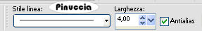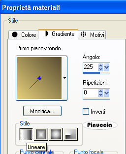 qui puoi trovare qualche risposta ai tuoi dubbi. Se l'argomento che ti interessa non è presente, ti prego di segnalarmelo. Occorrente: Materiale qui Metti la Maschera nella cartella Maschere. Apri il font e minimizzalo nella tua area di lavoro. Lo troverai nella lista dei font disponibili quando ti servirà. Imposta il colore di primo piano con #584c32, e il colore di sfondo con #e5cf79, o scegli due colori dal tuo tube. Passa il colore di primo piano a Gradiente di primo piano/sfondo, con i seguenti settaggi: ![]() Apri una nuova immagine trasparente 700 x 500 pixels, e riempila con il gradiente.Apri il tube e vai a Modifica>Copia. Torna al tuo lavoro e vai a Modifica>Incolla>Incolla come nuovo livello. Lascia il tube come sta, al centro, soltanto spostalo un po' in basso,in modo che sia visibile la testa: ![]() Riporta il colore di primo piano da Gradiente a Colore. Attiva lo strumento Penna , con i seguenti settaggi:
