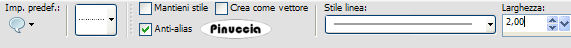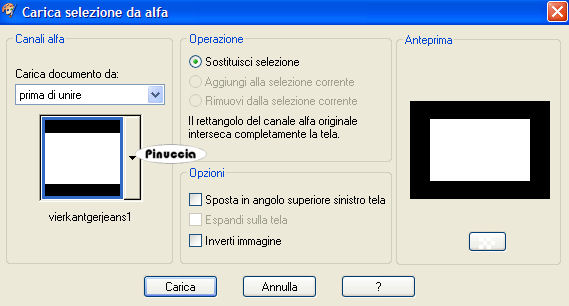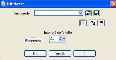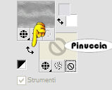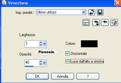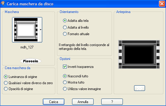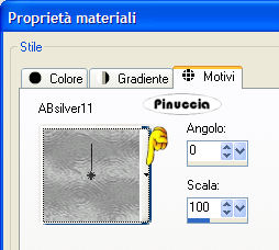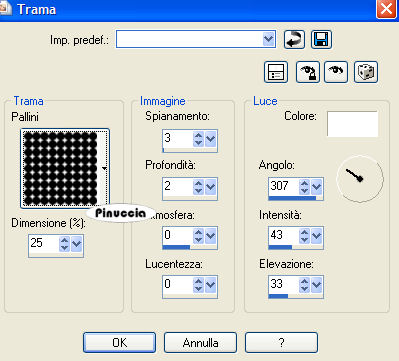 qui puoi trovare qualche risposta ai tuoi dubbi. Se l'argomento che ti interessa non è presente, ti prego di segnalarmelo. Questo tutorial è stato scritto con PSP 9, ma può essere eseguito anche con le altre versioni di PSP. Materiale qui Metti la maschera mdh_127 nella cartella maschere di PSP. Metti le forme "gerdablok" e "L&K -L&k bolletjeslijn4" nella cartella Forme predefinite di PSP. Apri i Motivi Spijkerstof e Abzilver11 e minimizzali nella tua area di lavoro. Li troverai nella lista dei motivi disponibili, quando ti serviranno. Apri il font e minimizzalo nella tua area di lavoro. Lo troverai nella lista dei font disponibili, quando ti servirà. 1. Apri Ritchgerda1.pspimage. Questa sarà la base del tuo lavoro. L'immagine non è vuota, ma contiene una selezione del canale alfa. Imposta il colore di primo piano su Motivi. apri il menu cliccando sulla freccia a fianco del box e seleziona il motivo Spijkerstof. ![]() Riempi l'immagine con questo motivo.Effetti>Effetti di trama>Veneziana, con i seguenti settaggi, colore nero. ![]() Livelli>Nuovo livello raster. Riempi il nuovo livello con il motivo Spijkerestof.Livelli>Carica/Salva maschera>Carica maschera da disco. Cerca e carica la maschera mdh_127, inverti trasparenza selezionato: ![]() Livelli>Elimina, e rispondi sì alla finestra con la domanda "Unire la maschera nel livello corrente?"> ![]() Livelli>Unisci>Unisci gruppo. Effetti>Effetti 3D>Sfalsa ombra: ![]() Ripeti l'Effetto Sfalsa ombra, ma cambiando verticale e orizzontale a -1. Livelli>Unisci>Unisci visibile. 2. Livelli>Nuovo livello raster. Chiudi il colore di primo piano. Imposta il colore di sfondo su Motivi. Apri il menu cliccando sulla freccia a fianco del box e seleziona il motivo Absilver11: ![]() Attiva lo strumento Forme predefinite. Seleziona la forma L&k bolletjeslijn4, soltanto antialias selezionato, dimensione linea 2: ![]() Traccia una linea sul bordo superiore dell'immagine, come mostrato nell'esempio. ![]() Effetti>Effetti di trama>Trama: seleziona la trama Pallini, con i seguenti settaggi: ![]() Effetti>Effetti 3D>Sfalsa ombra: ![]() Ripeti l'Effetto Sfalsa ombra, ma cambiando verticale e orizzontale a -1. Livelli>Duplica. Immagine>Capovolgi. Livelli>Unisci>Unisci visibile. Livelli>Nuovo livello raster. Inverti i colori nella paletta dei materiali, cliccando sulla freccia tra le due palette, e chiudi il colore di sfondo. In questo modo avrai il motivo argento impostato come colore di primo piano. ![]() Attiva lo strumento Forme predefinite ,e seleziona la forma Gerdablok, soltanto antialias selezionato, dimensione, 1 pixel. Disegna un piccolo quadrato nel secondo quadretto dall'alto, come nell'esempio. ![]() Effetti>Effetti 3D>Sfalsa ombra: ![]() Ripeti l'Effetto Sfalsa ombra, ma cambiando verticale e orizzontale a -1. Livelli>Duplica. Immagine>Rifletti. Chiudi il livello inferiore e attiva uno degli altri livelli. Livelli>Unisci>Unisci visibile. Livelli>Duplica, 3 volte. Rendi nuovamente visibile il livello inferiore. Posiziona i tre livelli duplicati nei quadrati inferiori.Livelli>Unisci>Unisci visibile. 4. Livelli>Nuovo livello raster. Selezione>Carica/Salva selezione>Carica selezione da canale alfa. Nella finestra che si aprirà la selezione è già caricata, devi soltanto cliccare carica. ![]() Apri il tube M-man-4 e vai a Modifica>Copia. Torna al tuo lavoro e vai a Modifica>Incolla>Incolla nella selezione. Fotoritocco>Nitidezza, e imposta l'intensità a 2. ![]() ![]() Effetti>Effetti di trama>Veneziana, colore nero: ![]() Selezione>Nessuna selezione. Livelli>Unisci>Unisci visibile. 5. Imposta il colore di sfondo con il bianco, lascia il motivo argento impostato come colore di primo piano. Livelli>Nuovo livello raster. Attiva lo strumento Testo ,seleziona il font 8pinmatrix, mobile, dimensione 16, pennellata 1, e, sopra l'immagine di Ritch, scrivi il testo "I wanna wake up with this man", o quello che preferisci. Se stai usando PSP X, dovrai regolare il settaggio della dimensione, perchè i pixels delle due versioni non corrispondono. Su queste differenze, vedi in fondo a questa pagina Effetti>Effetti 3D>Sfalsa ombra: ![]() Selezione>Nessuna selezione. Livelli>Nuovo livello raster. Scrivi un altro testo nella striscia in basso. Effetti>Effetti 3D>Sfalsa ombra: ![]() Selezione>Nessuna selezione. Livelli>Unisci>Unisci tutto. Immagine>Aggiungi bordatura, 1 pixel, simmetriche, con il colore #2c3743. ![]() Se hai problemi o dubbi, o trovi un link non funzionante, o anche soltanto per un saluto, scrivimi 19 Giugno 2007 |