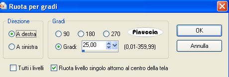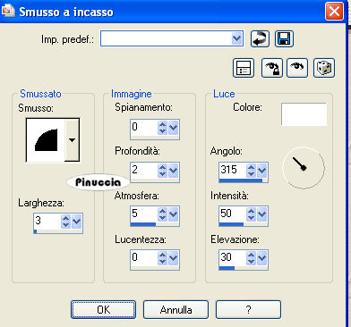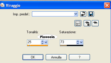 qui puoi trovare qualche risposta ai tuoi dubbi. Se l'argomento che ti interessa non è presente, ti prego di segnalarmelo. Occorrente: Materiale qui I tubes usati per questo tutorial sono di Hanne, Brigitte, SDH. La foto è di Jeannette. Filtro: Greg's Factory Output II qui Imposta il colore di primo piano con #C5AD92. 1. Apri una nuova immagine trasparente 600 x 450 pixels, e riempila con il colore di primo piano.Effetti>Plugins>Greg's Factory Output - Poolshadow, con i seguenti settaggi. ![]() 2. Effetti>Effetti di bordo>Aumenta di più, 2 volte. 3. Apri la foto "Rome". Livelli>Carica/Salva maschera>Carica maschera da disco. Cerca e carica la maschera 20-20. ![]() Livelli>Elimina, e rispondi sì alla domanda "Unire la maschera nel livello corrente?. ![]() Livelli>Unisci>Unisci gruppo. 4. Modifica>Copia. Torna al tuo lavoro e vai a Modifica>Incolla>Incolla come nuovo livello. Sposta l'immagine in alto a destra.5. Apri il tube del fiore "PinkTulipsmisted" e vai a Modifica>Copia. Apri il tube con la donna "Hanne_woman30" e vai a Modifica>Incolla>Incolla come nuovo livello. Sposta il fiore completamente in basso.6. Regola>Saturazione e tonalità>Viraggio: ![]() Livelli>Unisci>Unisci visibile. 7. Immagine>Ruota>Ruota per gradi: 90 gradi a destra: ![]() 8. Modifica>Copia. Ritorna al tuo lavoro (600x450 pixesl) e vai a Modifica>Incolla>Incolla come nuovo livello. Sposta l'immagine in basso a sinistra.Effetti>Effetti 3D>Sfalsa ombra: ![]() 9. Apri il tube con gli uccelli. Vedrai che è composto da 5 livelli. Chiudi i livelli 4 e 6 e attiva uno degli altri livelli. Modifica>Copia Unione (non chiudere ancora il tube. Ti potrebbe servire, se vuoi realizzare lo script). Torna al tuo lavoro e vai a Modifica>Incolla>Incolla come nuovo livello. Sposta l'immagine con i tre uccelli in basso a destra.10. Livelli>Unisci>Unisci tutto. 11. Immagine>Aggiungi bordatura, 1pixel, simmetriche, con il colore bianco. Immagine>Agggiungi bordatura, 5 pixels, simmetriche, con il colore nero. Seleziona il bordo nero con la bacchetta magica ,Imposta il colore di primo piano su Motivi, e seleziona un motivo oro. ![]() Riempi il bordo con questo motivo.se non hai a disposizione il motivo oro e non vuoi perdere tempo a cercarlo, prelevalo qui Mantieni selezionato. 12. Effetti>effetti 3D>Smusso a incasso: ![]() 13. Selezione>Nessuna selezione. Immagine>Aggiungi bordatura, 1 pixel, simmetriche, con il colore di primo piano. 14. Eventualmente, ridimensiona l'immagine a 614x464 pixels. L'immagine è finita. Se vuoi realizzare lo script, ti occorrono anche due immagini di sfondo. Indicazioni per gli sfondi: Questo è quello che ho fatto io. Naturalmente, puoi scegliere di creare altri sfondi, o cambiare le impostazioni come preferisci. Per il primo sfondo apri un'immagine 200x200 pixels. Attiva il tube con i tre uccelli del punto 9 e vai a Modifica>Copia unione. Ritorna allo sfondo e vai a Modifica>Incolla>Incolla come nuovo livello. Livelli>Unisci>Unisci tutto. Effetti>Effetti di immagine>Motivo unico, con i settaggi standard. Abbassa l'opacità intorno al 50% e Unisci tutto. Effetti>Plugins>Blend Emboss, con i settaggi standard, 2 volte. Salva in formato jpg come sfondo1. Per il secondo sfondo apri un'immagine 100x100 con un colore chiaro preso dal tuo lavoro, e applica un effetto trama a scelta. Salva in formato jpg come sfondo2. Per eseguire lo script Apri lo script di Jeannette che trovi qui, e segui i preliminari descritti alla fine di questo tutorial, fino all'inserimento dello sfondo-suono. Dopo aver inserito lo sfondo-suono, dovrai indicare allo script dove trovare le immagini. Clicca su Origine e identifica i punti di inserimento dei vari elementi dello script. Se hai messo tutti i file in una cartella, il percorso del suono ti servirà da guida per l'inserimento degli altri files: ti basterà cambiare l'ultima parte: il nome e l'estensione. Nella schermata sotto sono indicati i punti in cui dovrai inserire, tra le virgolette, il percorso delle due immagini di sfondo, e dell'immagine che hai duplicato al punto 21 e ridotto a 300x300 pixels. 1. Qui inserisci il primo sfondo. 2. Qui inserisci il secondo sfondo che servirà per le tabelle. 3. Qui inserisci lo sfondo per la sezione del testo, puoi usare quello che hai usato per le tabelle. ![]() Nella schermata sotto è indicato il punto in cui dovrai inserire il percorso delle due immagini. 1-2. Questi sono i punti in cui inserire il percorso dell'immagine principale. ![]() Ricorda che, contemporaneamente, puoi controllare il risultato andando su Anteprima. fai molta attenzione alle estensioni dei files e alle maiuscole-minuscole, che devono essere corrette, altrimenti lo script non troverà le immagini da inserire Clicca adesso sulla linguetta Modifica, per aggiungere il testo. clicca due volte all'interno del riquadro. Apparirà la cornice che ti dà il via libera per sostituire il testo esistente e aggiungere il tuo. Quando hai finito, clicca all'esterno e la cornice sparirà. Il tuo messaggio con lo script è pronto per il tasto Invia. Se non vuoi spedirlo e vuoi soltanto tenerlo per te, vai a File>Salva con nome e mettilo in una cartella a tua scelta. Ricordati, però, che quando vorrai rivedere lo script, i files devono trovarsi nello stesso posto. Se nel frattempo li avrai spostati, vedrai soltanto delle crocette rosse. Avvertimento: non devi preoccuparti se in Modifica non vedrai il messaggio come dovrebbe essere (per fare questo devi andare in Anteprima). Ricorda ancora che per inviare il messaggio ti devi posizionare su Modifica. ![]() Se hai problemi o dubbi, o trovi un link non funzionante, o anche soltanto per un saluto, scrivimi. 25 Giugno 2007 |