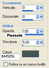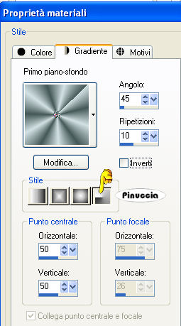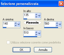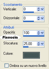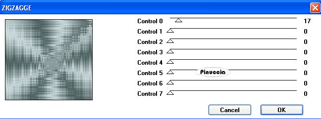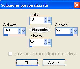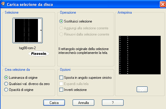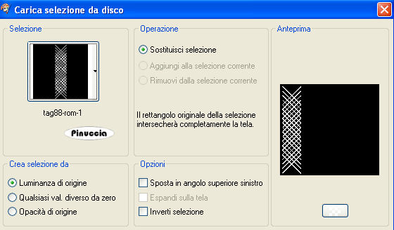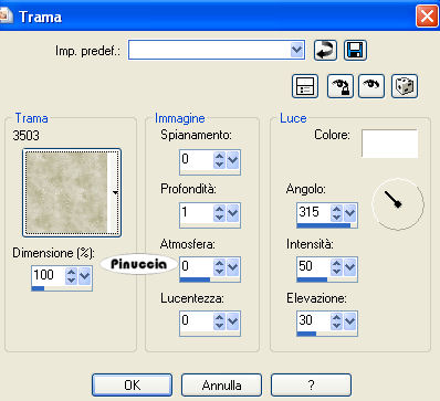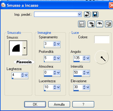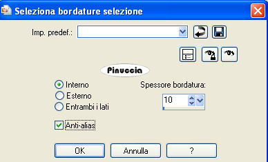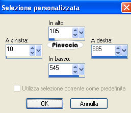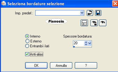 qui puoi trovare qualche risposta ai tuoi dubbi. Se l'argomento che ti interessa non è presente, ti prego di segnalarmelo. Questo tutorial è stato scritto con PSP Corel X2, ma può essere eseguito anche con le precedenti versioni. Per tradurlo, ho usato PSP X. Occorrente: Un tube a scelta. Il resto del materiale qui I tubes che ho usato sono di Outlawbydesign e Dieter und Marion . Filtri: Sybia - Zigazagge (nello zip). Metti le Selezioni nella cartella Selezioni. 1. Apri una nuova immagine trasparente 700 x 650 pixels. Scegli due colori dal tuo tube. Imposta il colore chiaro come colore di primo piano (il mio #D3E1E3), e il colore scuro come colore di sfondo (il mio #445856). Passa il colore di primo piano a Gradiente di primo piano/sfondo, con i seguenti settaggi: ![]() Riempi l'immagine trasparente con il gradiente.2. Regola>Sfocatura>Sfocatura gaussiana, raggio 15. ![]() Effetti>Plugins>Sybia - Zigzagge, con i settaggi standard. ![]() Effetti>Effetti di bordo>Aumenta. 3. Livelli>Nuovo livello raster. Attiva lo strumento Selezione ![]() clicca sull'icona Selezione personalizzata ![]() e imposta i seguenti settaggi: ![]() 4. Selezione>Modifica>Seleziona bordature selezione: ![]() Riempi la selezione con il colore scuro di sfondo.5. Effetti>Effetti 3D>Smusso a incasso: ![]() Selezione>Deseleziona. 6. Attiva lo strumento Bacchetta magica ![]() ![]() clicca l'interno della cornice per selezionarlo. Selezione>Modifica>Espandi - 5 pixels. 7. Livelli>Nuovo livello raster. Riempi con il colore scuro di sfondo.Effetti>Effetti di trama>Veneziana, con i seguenti settaggi, con il colore chiaro di primo piano: ![]() Livelli>Disponi>Sposta giù. Selezione>Deseleziona. 8. Attiva il livello superiore (il livello della cornice). Livelli>Unisci>Unisci giù. Effetti>Effetti 3D>Sfalsa ombra, con i seguenti settaggi: ![]() 9. Livelli>Nuovo livello raster. Selezione personalizzata :![]() 10. Selezione>Modifica>Seleziona bordature selezione: ![]() Riempi la selezione con il colore scuro di sfondo.Effetti>Effetti 3D>Smusso a incasso, come al punto 5. Selezione>Deseleziona. 11. Seleziona l'interno della cornice con la bacchetta magica ![]() Selezione>Modifica>Espandi - 5 pixels. 12. Livelli>Nuovo livello raster. Riempi con il colore chiaro di primo piano.Effetti>Effetti di trama>Trama - seleziona la trama (nello zip) 3503, con i seguenti settaggi: ![]() Selezione>Deseleziona. Livelli>Disponi>Sposta giù. 13. Attiva il livello superiore (il livello della cornice). Livelli>Unisci>Unisci giù. Effetti>Effetti 3D>Sfalsa ombra, come al punto 8. 14. Livelli>Nuovo livello raster. Selezione personalizzata :![]() 15. Selezione>Modifica>Seleziona bordature selezione: ![]() Riempi la selezione con il colore scuro di sfondo.Effetti>Effetti 3D>Smusso a incasso, come al punto 5. 16. Selezione>Deseleziona. Seleziona l'interno della cornice con la bacchetta magica ![]() Selezione>Modifica>Contrai - 5 pixels. 17. Livelli>Nuovo livello raster. Riempi con il colore chiaro di primo piano.Effetti>Effetti di trama>Trama, come al punto 12. Selezione>Deseleziona. Livelli>Disponi>Sposta giù. 18. Attiva il livello superiore (il livello della cornice). Livelli>Unisci>Unisci giù. Effetti>Effetti 3D>Sfalsa ombra, come al punto 8. Livelli>Duplica. Immagine>Capovolgi. 19. Livelli>Nuovo livello raster. Selezione>Carica/Salva selezione>Carica selezione da disco. Cerca e carica la selezione "tag88-rom-1": ![]() Riempi la selezione con il colore chiaro di primo piano.Selezione>Deseleziona. Effetti>Effetti 3D>Sfalsa ombra, come al punto 8. Livelli>Duplica. Immagine>Rifletti. 20. Livelli>Nuovo livello raster. Selezione>Carica/Salva selezione>Carica selezione da disco. Cerca e carica la selezione "tag88-rom-2": ![]() Riempi la selezione con il colore scuro di sfondo.Selezione>Modifica>Contrai - 3 pixels. Riempi con il colore chiaro di primo piano.Selezione>Deseleziona. Effetti>Effetti 3D>Sfalsa ombra, come al punto 8. Livelli>Duplica. Immagine>Rifletti. 21. Apri il tuo tube e vai a Modifica>Copia. Torna al tuo lavoro e vai a Modifica>Incolla come nuovo livello. Posizionalo in basso al centro (vedi il mio esempio per orientarti).Effetti>Effetti 3D>sfalsa ombra: ![]() 22. Attiva lo strumento Testo , scegli un font e scrivi il tuo nome o un testo.Se vuoi, aggiungi il tuo watermark. 23. Immagine>Aggiungi bordatura, 2 pixels, simmetriche, con il colore #445856. Immagine>Aggiungi bordatura, 50 pixels, simmetriche, con il colore #D3E1E3. Seleziona questo bordo con la bacchetta magica ![]() ![]() Effetti>Effetti di trama>Trama - come al punto 12. Selezione>Deseleziona. 24. Selezione>Seleziona tutto. Selezione>Modifica>Contrai - 20 pixels. Livelli>Nuovo livello raster. Riempi con il colore scuro di sfondo.Selezione>Modifica>Contrai - 10 pixels. 25. Premi sulla tastiera il tasto CANC ![]() Selezione>Deseleziona. Attiva lo strumento Bacchetta magica e clicca nella cornice interna per selezionarla.Effetti>Effetti 3D>Smusso a incasso, come al punto 5. Selezione>Deseleziona. Immagine>Aggiungi bordatura, 2 pixels, simmetriche, con il colore #445856. Hai finito. Puoi salvare in formato jpg. ![]() Se hai problemi o dubbi, o trovi un link non funzionante, o anche soltanto per un saluto, scrivimi. 9 Novembre 2008 |