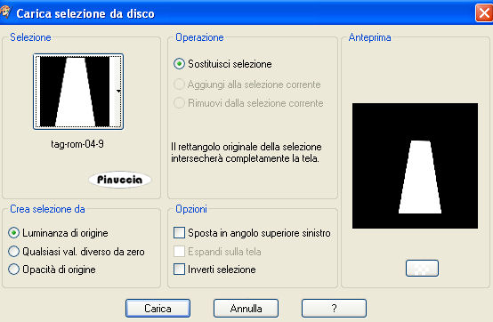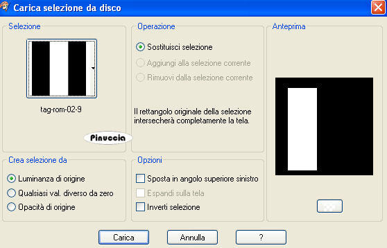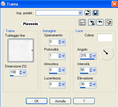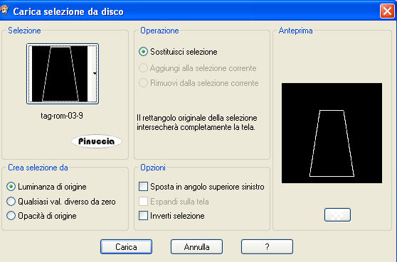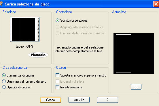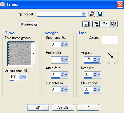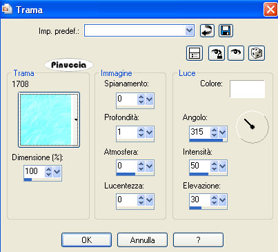 qui puoi trovare qualche risposta ai tuoi dubbi. Se l'argomento che ti interessa non è presente, ti prego di segnalarmelo. Questo tutorial è stato scritto con PSP Corel 11, ma può essere eseguito anche con le precedenti versioni. Per tradurlo, ho usato PSP X. Occorrente: Materiale qui Metti la trama "1708" nella cartella Trame. Metti le selezioni nella cartella Selezioni. 1. Apri una nuova immagine trasparente 600 x 600 pixels. Scegli due colori dal tuo tube. Io ho scelto come colore di primo piano il colore chiaro #C5D1DA, e come colore di sfondo il colore scuro #415667. 2. Selezione>Carica/Salva selezione>Carica selezione da disco. Cerca e carica la selezione "tag-rom-01-9" con i seguenti settaggi: ![]() Riempi la selezione con il colore scuro di sfondo.Selezione>Deseleziona. Effetti>Effetti 3D>Sfalsa ombra, con i seguenti settaggi, con il colore scuro di sfondo: ![]() 3. Livelli>Nuovo livello raster. Selezione>Carica/Salva selezione>Carica selezione da disco. Cerca e carica la selezione "tag-rom-02-9" con i seguenti settaggi: ![]() Riempi la selezione con il colore chiaro di primo piano.Effetti>Effetti di trama>Trama - Tratteggio fine (standard in PSP), con i seguenti settaggi. ![]() Livelli>Disponi>Sposta giù. Selezione>Deseleziona. 4. Attiva il livello superiore. Livelli>Unisci>Unisci giù. Livelli>Duplica. Immagine>Rifletti. 5. Livelli>Nuovo livello raster. Selezione>Carica/Salva selezione>Carica selezione da disco. Cerca e carica la selezione "tag-rom-03-9" con i seguenti settaggi: ![]() Riempi la selezione con il colore scuro di sfondo.Selezione>Deseleziona. Effetti>Effetti 3D>Sfalsa ombra, con i settaggi precedenti (punto 2). Livelli>Disponi>Sposta su. 6. Livelli>Nuovo livello raster. Selezione>Carica/Salva selezione>Carica selezione da disco. Cerca e carica la selezione "tag-rom-04-9" con i seguenti settaggi: ![]() Riempi la selezione con il colore chiaro di primo piano.Effetti>Effetti di trama>Trama - Tela trama grossa (standard in PSP), con i seguenti settaggi: ![]() Selezione>Deseleziona. Sistema la forma nell'angolo in basso a destra.Livelli>Disponi>Sposta giù. Attiva il livello superiore. Livelli>Unisci>Unisci giù. 7. Se tutto è andato bene dovresti avere questo. ![]() 8. Livelli>Nuovo livello raster. Riempi questo livello con #ECF2F6.Effetti>Effetti di trama>Trama - seleziona la trama "1708", con i seguenti settaggi. ![]() Livelli>Disponi>Porta sotto. 9. Apri il tube "herzen", e vai a Modifica>Copia. Torna al tuo lavoro e vai a Modifica>Incolla come nuovo livello. Spostalo a sinistra, come nel mio esempio.10. Apri il tube "Nik_CherylAustin_Skye", e vai a Modifica>Copia. Torna al tuo lavoro e vai a Modifica>Incolla come nuovo livello. Immagine>Ridimensiona, al 70%, tutti i livelli non selezionato. Spostalo a destra.Effetti>Effetti 3D>Sfalsa ombra, con i settaggi precedenti (punto 2). 11. Attiva lo strumento Testo ,e scrivi il tuo nome o un testo sull'immagine. Se vuoi, aggiungi il tuo watermark. 12. Immagine>Aggiungi bordatura, 1 pixel, simmetriche, con il colore #415667. Immagine>Aggiungi bordatura, 5 pixels, simmetriche, con il colore #C5D1DA. Immagine>Aggiungi bordatura, 1 pixel, simmetriche, con il colore #415667. ![]() 13. Modifica>Copia. Apri Animation Shop. Clicca con il tasto destro del mouse sullo spazio vuoto e Incolla come nuova animazione. ![]() Modifica>Duplica, e ripeti: avrai così tre fotogrammi. Clicca sul primo fotogramma per selezionarlo e vai a Modifica>Seleziona tutto. Apri "spens-bling-16th-august07". Il primo fotogramma di questa animazione è nero. Clicca sul fotogramma e vai a Modifica>Elimina. Adesso anche questa animazione ha tre fotogrammi. Clicca sul primo fotogramma per selezionarlo e vai a Modifica>Seleziona tutto, (oppure premi sulla tastiera la combinazione di tasti Ctrl+A), quindi Modifica>Copia (ctrl+C). Torna al tuo lavoro e vai a Modifica>Incolla>Incolla nel fotogramma selezionato (Ctrl+E). Controlla il risultato cliccando su Visualizza e salva in formato gif.![]() Se hai problemi o dubbi, o trovi un link non funzionante, o anche soltanto per un saluto, scrivimi. 7 Giugno 2008 |