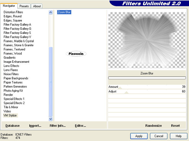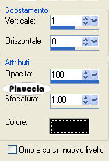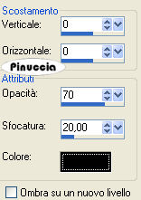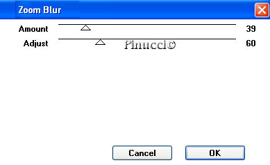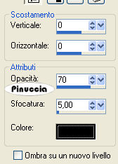 qui puoi trovare qualche risposta ai tuoi dubbi. Se l'argomento che ti interessa non è presente, ti prego di segnalarmelo. Questo tutorial è stato scritto con PSP Corel X2, ma può essere eseguito anche con le precedenti versioni. Per tradurlo, ho usato PSP X. Occorrente: Un tube a scelta. Il resto del materiale qui Il tube che ho usato è di Azyzam. Filtri: Filters Unlimited qui VM Toolbox - Zoom blur qui I filtri Toolbox si possono usare importati in Filters Unlimited, ma possono funzionare anche da soli Il filtro Zoom blur, una volta importato in Filters Unlimited, prende il nome VM Stylize. 1. Apri una nuova immagine trasparente 750 x 550 pixels. Selezione>Seleziona tutto. Apri lo Scrapkit. Posizionati sul livello "Paper1" e vai a Modifica>Copia. Torna al tuo lavoro e vai a Modifica>Incolla nella selezione. Selezione>Deseleziona. 2. Dallo scrapkit attiva il livello "paper2" e vai a Modifica>Copia. Torna al tuo lavoro e vai a Modifica>Incolla come nuovo livello. Immagine>Ridimensiona, all'85%, tutti i livelli non selezionato. Immagine>Capovolgi. Effetti>Plugins>Filters Unlimited - VM Stylize - Zoom Blur, con i seguenti settaggi: ![]() se vuoi usare il filtro da solo: Effetti>Plugins>VM Toolbox - Zoom Blur: ![]() 3. Dallo Scrapkit attiva il livello "Paper3" e vai a Modifica>Copia. Torna al tuo lavoro e vai a Modifica>Incolla come nuovo livello. Immagine>Ridimensiona, al 65%, tutti i livelli non selezionato. Immagine>ruota per gradi - 30 gradi a sinistra. ![]() Sposta la carta nell'angolo in basso a destra.Abbassa l'opacità di questo livello al 70%. 4. Effetti>Effetti 3D>sfalsa ombra, con i seguenti settaggi: ![]() 5. Dallo scrapkit attiva il livello "stitches" e vai a Modifica>Copia. Torna al tuo lavoro e vai a Modifica>Incolla come nuovo livello. Immagine>Ruota per gradi - 30 gradi a destra, 2 volte. ![]() Attiva lo strumento Gomma e cancella i tre punti superiori:![]() Livelli>Duplica, e sposta le cuciture come nell'esempio.![]() 6. Apri il tuo tube e vai a Modifica>Copia. Torna al tuo lavoro e vai a Modifica>Incolla come nuovo livello. Spostalo a sinistra, lasciando un po' di spazio dal bordo (vedi il mio esempio, per orientarti).Effetti>Effetti 3D>Sfalsa ombra, con i seguenti settaggi: ![]() 7. Dallo scrapkit attiva il livello "bead frame" e vai a Modifica>Copia. Torna al tuo lavoro e vai a Modifica>Incolla come nuovo livello. Immagine>Ridimensiona, all'85%, tutti i livelli non selezionato. Sposta la cornice nell'angolo in alto a destra, come nel mio esempio.8. Dallo scraptkit attiva il livello "flourisch Black" e vai a Modifica>Copia. Torna al tuo lavoro e vai a Modifica>Incolla come nuovo livello. Spostalo nella cornice di perle come nel mio esempio.![]() 9. Dallo scrapkit attiva il livello "button Flower" e vai a Modifica>Copia. Torna al tuo lavoro e vai a Modifica>Incolla come nuovo livello. Spostalo come nel mio esempio.![]() 10. Dallo scrapkit attiva il livello "chain border" e vai a Modifica>Copia. Torna al tuo lavoro e vai a Modifica>Incolla come nuovo livello. Immagine>Ruota per gradi - 30 gradi a sinistra. ![]() Sposta il fiore nell'angolo in basso a sinistra.11. Dallo scrapkit attiva il livello "ring chain", e vai a Modifica>Copia. Torna al tuo lavoro e vai a Modifica>Incolla come nuovo livello. Immagine>Ruota per gradi - 30 gradi a sinistra. ![]() Spostalo nell'angolo in basso a destra.![]() 12. Dallo scrapkit attiva il livello "Flower" e vai a Modifica>Copia. Torna al tuo lavoro e vai a Modifica>Incolla come nuovo livello. Sposta il fiore nell'angolo in alto a sinistra, come nel mio esempio.13. Dallo scrapkit attiva il livello "cross stitch" e vai a Modifica>copia. Torna al tuo lavoro e vai a Modifica>Incolla come nuovo livello. Spostalo sotto il fiore, come nel mio esempio.14. Dallo scrapkit attiva il livello "flower pin" e vai a Modifica>Copia. Torna al tuo lavoro e vai a Modifica>Incolla come nuovo livello. Immagine>Ruota per gradi - 30 gradi a destra. ![]() Sposta il fiore nell'angolo in alto a destra della cornice rotonda.Cancella la parte inferiore dello spillo, per dare l'idea che sia infilato nella cornice.![]() puoi anche selezionare e premere il tasto CANC 15. Dallo scrapkit attiva il livello "pin". Attiva lo strumento Selezione , rettangolo,e seleziona lo spillo nero: ![]() Modifica>Copia. Torna al tuo lavoro e vai a Modifica>Incolla come nuovo livello. Immagine>Ruota per gradi - 30 gradi a sinistra. ![]() Attiva lo strumento Gomma e cancella la parte centrale dello spillo,per dare l'impressione che sia infilato: ![]() Effetti>Effetti 3D>Sfalsa ombra: ![]() Ripeti l'Effetto Sfalsa ombra, cambiando verticale con -1. 16. Dallo scrap attiva il livello "bow" e vai a Modifica>Copia. Torna al tuo lavoro e vai a Modifica>Incolla come nuovo livello. Immagine>Ruota per gradi - 30 gradi a sinistra: ![]() Spostalo sulla cornice, come nel mio esempio.17. Dallo scrap, attiva il livello "pins" e, come hai fatto per lo spillo nero, seleziona lo spillo bianco.Modifica>Copia. Torna al tuo lavoro e vai a Modifica>Incolla come nuovo livello. Immagine>Ruota per gradi - 30 gradi a sinistra. ![]() Sposta lo spillo nella maschera.Cancella la parte dello spillo che non deve essere visibile.![]() 18. Attiva lo strumento Testo , scegli un font e scrivi il tuo testo o il tuo nome.Se vuoi, aggiungi il tuo watermark. Effetti>Effetti 3D>Sfalsa ombra, con i seguenti settaggi: ![]() 19. Immagine>Aggiungi bordatura, 1 pixel, con il colore nero. Immagine>Aggiungi bordatura, 1 pixel, con il colore bianco. Immagine>Aggiungi bordatura, 10 pixels, con il colore nero. Immagine>Aggiungi bordatura, 1 pixel, con il colore bianco. Immagine>Aggiungi bordatura, 10 pixels, con il colore nero. Immagine>Aggiungi bordatura, 1 pixel, con il colore bianco. Immagine>Aggiungi bordatura, 1 pixel, con il colore nero. Immagine>Aggiungi bordatura, 1 pixel, con il colore bianco. Hai finito. Puoi salvare in formato jpg. Se hai problemi o dubbi, o trovi un link non funzionante, o anche soltanto per un saluto, scri