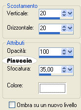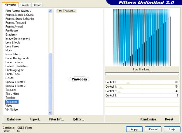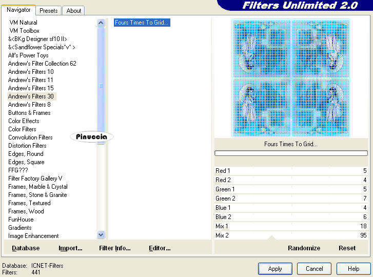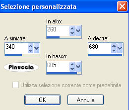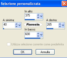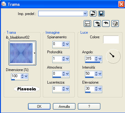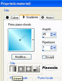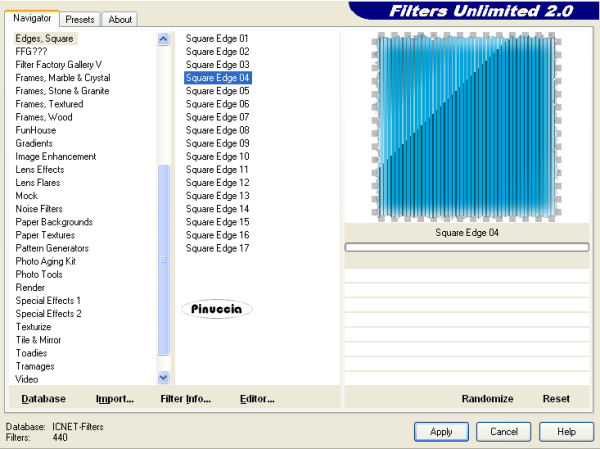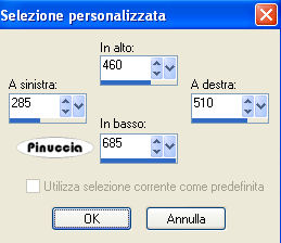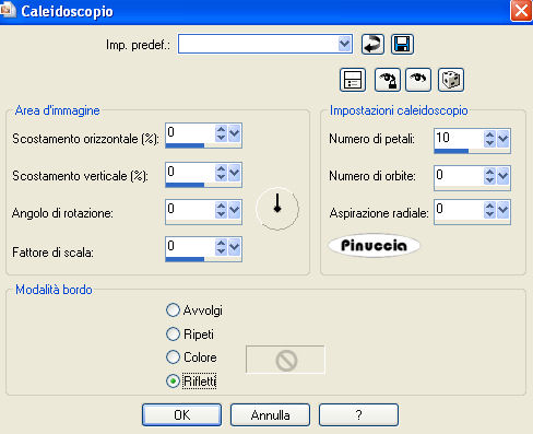 qui puoi trovare qualche risposta ai tuoi dubbi. Se l'argomento che ti interessa non è presente, ti prego di segnalarmelo. Questo tutorial è stato scritto con PSP Corel X2, ma può essere eseguito anche con le precedenti versioni. Per tradurlo, ho usato PSP X. Occorrente: Un tube e un paesaggio a scelta. I tubes che ho usato sono di Lori Rhae e Guismo qui Filtri: Filters Unlimited qui Tramages qui Andrews Filters 30 - Fours Times to Grid qui Per usare i filtri Andrews, bisogna prima convertirli. Come fare vedi qui Si usano importati in Filters Unlimited. Come fare vedi qui Anche i filtri Tramages si possono usare importati in Filters Unlimited. Ma - come gli Andrews - possono funzionare anche da soli 1. Apri una nuova immagine trasparente 700 x 700 pixels. Scegli due colori dal tuo tube. Per seguire il mio esempio, imposta il colore di primo piano con il colore scuro #01A1D9, e il colore di sfondo con il colore chiaro #D1FDFF. Passa il colore di primo piano a Gradiente di primo piano/sfondo, con i seguenti settaggi: ![]() 2. Riempi l'immagine trasparente con il gradiente.Effetti>Effetti di riflesso>Caleidoscopio. ![]() 3. Effetti>Effetti di trama>Trama - seleziona una trama a tua scelta con i seguenti settaggi: ![]() 4. Livelli>Nuovo livello raster. Attiva lo strumento Selezione ![]() clicca sull'icona Selezione personalizzata ![]() e imposta i seguenti settaggi: ![]() Riempi la selezione con il colore scuro di primo piano.5. Selezione>Inverti. Effetti>Effetti 3D>Sfalsa ombra, con i seguenti settaggi. ![]() Ripeti l'Effetto Sfalsa ombra, cambiando verticale e orizzontale con -20. Selezione>inverti. 6. Effetti>Plugins>Filters Unlimited 2.0 - Tramages - Two the line, con i settaggi standard. ![]() 7. Effetti>Plugins>Filters Unlimited 2.0 - Edges Squares - Square Edge 04. ![]() Selezione>Deseleziona. 8. Livelli>Nuovo livello raster. Selezione personalizza ![]() ![]() Riempi la selezione con il colore scuro di primo piano.Ripeti i passaggi 5 - 6 - 7. 9. Livelli>Nuovo livello raster. Selezione personalizzata ![]() ![]() Riempi la selezione con il colore scuro di primo piano.Ripeti i passaggi 5 - 6 - 7. 10. Livelli>Nuovo livello raster. Selezione personalizzata ![]() ![]() Riempi la selezione con il colore scuro di primo piano.Ripeti i passaggi 5 - 6 - 7. 11. Livelli>Nuovo livello raster. Selezione personalizzata ![]() ![]() Riempi la selezione con il colore scuro di primo piano.Ripeti i passaggi 5 - 6 - 7. 12. Chiudi il livello inferiore di sfondo e dovresti avere questo: ![]() Livelli>Unisci>Unisci visibile. 13. Selezione>Seleziona tutto. Selezione>Mobile. Selezione>Immobilizza. Livelli>Nuovo livello raster. Apri il tube del paesaggio e vai a Modifica>Copia. Torna al tuo lavoro e vai a Modifica>Incolla nella selezione. Cambia la modalità di miscelatura di questo livello in Luminanza (esistente) e abbassa l'opacità al 40%. Selezione>Deseleziona. Livelli>Unisci>Unisci giù. 14. Effetti>Effetti 3D>Sfalsa ombra, con i seguenti settaggi. ![]() 15. Attiva il tube della donna e vai a Modifica>Copia. Torna al tuo lavoro e vai a Modifica>Incolla come nuovo livello. se stai usando il mio tube: Immagine>Rifletti. Immagine>Ridimensiona, 2 volte all'80%, tutti i livelli non selezionato Posiziona il tube a destra.Effetti>Effetti 3D>Sfalsa ombra, con i seguenti settaggi: ![]() 16. Rendi nuovamente visibile il livello di sfondo. 17. Attiva lo strumento Testo e scrivi il tuo nome o un testo.Se vuoi, aggiungi il tuo watermark. 18. Immagine>Aggiungi bordatura, 2 pixels, simmetriche, con il colore #01A1D9. Immagine>Aggiungi bordatura, 2 pixels, simmetriche, con il colore #D1FDFF. Immagine>Aggiungi bordatura, 2 pixels, simmetriche, con il colore ##01A1D9. 19. Immagine>Aggiungi bordatura, 20 pixels, simmetriche, con il colore #D1FDFF. Seleziona questo bordo con la bacchetta magica ![]() ![]() Effetti>Plugins>Filters Unlimited 2.0 - Andrews Filter 30 - Fours Times To Grid, con i settaggi standard. ![]() Selezione>Deseleziona. 20. Immagine>Aggiungi bordatura, 2 pixels, simmetriche, con il colore #01A1D9. Immagine>Aggiungi bordatura, 2 pixels, simmetriche, con il colore #D1FDFF. Immagine>Aggiungi bordatura, 2 pixels, simmetriche, con il colore ##01A1D9. Hai finito. Puoi salvare in formato jpg. ![]() Se hai problemi o dubbi, o trovi un link non funzionante, o anche soltanto per un saluto, scrivimi. 18 Ottobre 2008 |
