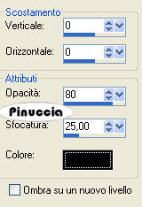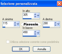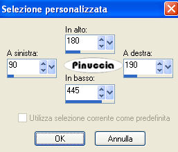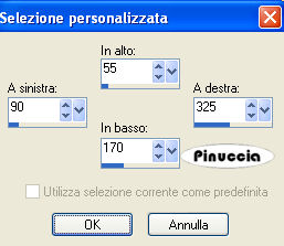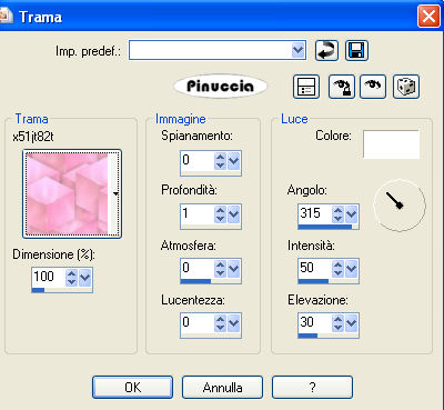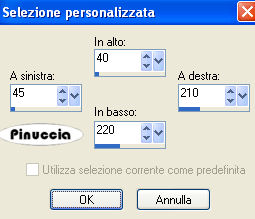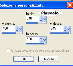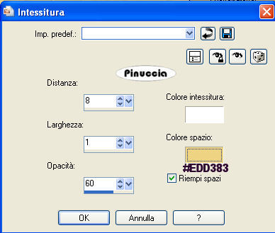 qui puoi trovare qualche risposta ai tuoi dubbi. Se l'argomento che ti interessa non è presente, ti prego di segnalarmelo. Questo tutorial è stato scritto con PSP Corel X2, ma può essere eseguito anche con le precedenti versioni. Per tradurlo, ho usato PSP X. Occorrente: Un tube a scelta. Il resto del materiale qui I tubes che ho usato per i miei esempi sono di Angie e Gerry. Metti la trama nella cartella Trame. 1. Apri una nuova immagine trasparente 700 x 600 pixels. Scegli due colori dal tuo tube. Io ho scelto come colore di primo piano il colore scuro #513B20, e come colore di sfondo il colore chiaro #EDD383. 2. Livelli>Nuovo livello raster. Attiva lo strumento Selezione ![]() clicca sull'icona Selezione personalizzata ![]() e imposta i seguenti settaggi: ![]() Riempi la selezione con il colore scuro di primo piano.Selezione>Modifica>Contrai - 2 pixels. Premi sulla tastiera il tasto CANC. Selezione>Deseleziona. 3. Effetti>Effetti 3D>Sfalsa ombra, con i seguenti settaggi: ![]() 4. Livelli>Nuovo livello raster. Selezione personalizzata ![]() ![]() Riempi la selezione con il colore scuro di primo piano.Selezione>Modifica>Contrai - 2 pixels. Premi sulla tastiera il tasto CANC. Selezione>Deseleziona. Effetti>Effetti 3D>Sfalsa ombra, come al punto 3. 5. Livelli>Nuovo livello raster. Selezione personalizzata ![]() ![]() Riempi la selezione con il colore scuro di primo piano.6. Effetti>Effetti di trama>Intessitura, con i seguenti settaggi: ![]() Selezione>Deseleziona. Abbassa l'opacità di questo livello al 70%. Effetti>Effetti 3D>Sfalsa ombra, come al punto 3. 7. Livelli>Nuovo livello raster. Selezione personalizzata ![]() ![]() Riempi la selezione con il colore scuro di primo piano.Effetti>Effetti di trama>Intessitura, come al punto 6. Selezione>Deseleziona. Abbassa l'opacità di questo livello al 70%. Effetti>Effetti 3D>Sfalsa ombra, come al punto 3. 8. Livelli>Nuovo livello raster. Selezione personalizzata ![]() ![]() Riempi la selezione con il colore scuro di primo piano.Selezione>Modifica>Contrai - 2 pixels. Premi sulla tastiera il tasto CANC. Selezione>Deseleziona. Effetti>Effetti 3D>Sfalsa ombra, come al punto 3. 9. Livelli>Duplica. Sposta questo livello un po' più a destra e in basso.Dovresti avere questo: ![]() 10. Attiva il livello Raster 1, e riempilo con il colore di sfondo.Effetti>Effetti di trama>Trama - seleziona la trama che hai trovato con il materiale con i seguenti settaggi: ![]() 11. Apri il tube "Mariel_2008...." e vai a Modifica>Copia. Torna al tuo lavoro e vai a Modifica>Incolla come nuovo livello. Spostalo a sinistra vicino al bordo.Attiva lo strumento Puntatore ![]() e "tira" il tube fino al bordo inferiore, vedi il mio esempio. 12. Apri il tuo tube. Attiva lo strumento Selezione e seleziona la parte superiore del tube.Modifica>Copia. Torna al tuo lavoro e vai a Modifica>Incolla come nuovo livello. Attiva lo strumento Puntatore ![]() o premi sulla tastiera il tasto D, e deforma l'immagine fino ai bordi, come come indicazione i miei esempi. Abbassa l'opacità di questo livello al 50%. 13. Attiva il livello superiore. Attiva nuovamente il tube. Selezione>Deseleziona. Modifica>Copia. Torna al tuo lavoro e vai a Modifica>Incolla come nuovo livello. Posiziona il tube come preferisci.Effetti>Effetti 3D>Sfalsa ombra: ![]() 14. Attiva lo strumento Testo ![]() e scrivi il tuo nome o un testo sull'immagine. Se vuoi, aggiungi il tuo watermark. Effetti>Effetti 3D>Sfalsa ombra, come al punto 3. ![]() 15. Immagine>Aggiungi bordatura, 2 pixels, simmetriche, con il colore scuro #513B20. Immagine>Aggiungi bordatura, 2 pixels, simmetriche, con il colore chiaro #EDD383, Immagine>Aggiungi bordatura, 2 pixels, simmetriche, con il colore scuro #513B20. Immagine>Aggiungi bordatura, 10 pixels, simmetriche, con il colore chiaro #EDD383, Immagine>Aggiungi bordatura, 2 pixels, simmetriche, con il colore scuro #513B20. Immagine>Aggiungi bordatura, 2 pixels, simmetriche, con il colore chiaro #EDD383, Immagine>Aggiungi bordatura, 2 pixels, simmetriche, con il colore scuro #513B20. Hai finito. Salva in formato jpg. ![]() ![]() ![]() Se hai problemi o dubbi, o trovi un link non funzionante, o anche soltanto per un saluto, scrivimi. 21 Giugno 2008 |