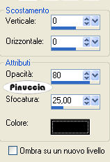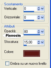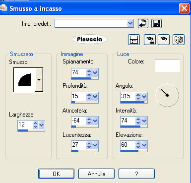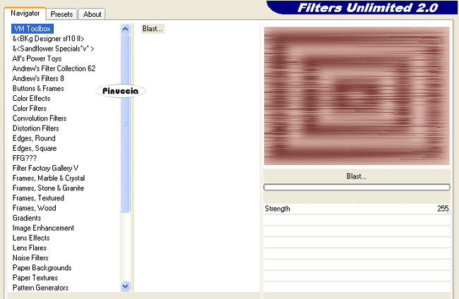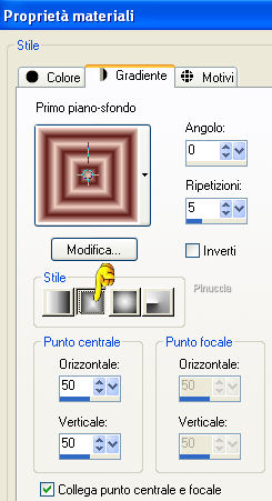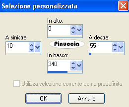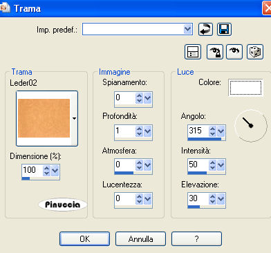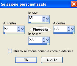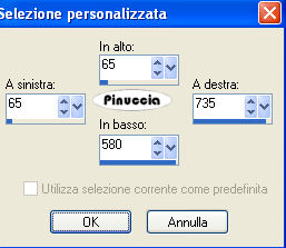 qui puoi trovare qualche risposta ai tuoi dubbi. Se l'argomento che ti interessa non è presente, ti prego di segnalarmelo. Questo tutorial è stato scritto con PSP Corel X2, ma può essere eseguito anche con le precedenti versioni. Per tradurlo, ho usato PSP X. Occorrente: Il tube di un personaggio e di un fiore a scelta. Il resto del materiale qui Per il mio esempio ho usato tubes di MTM(Brigitte) e Alejandra Rosales. Filtri: Filters Unlimited qui VM Toolbox - Blast qui i filtri Toolbox si usano importati in Filters Unlimited, ma possono funzionare anche da soli. Metti la selezione nella cartella Selezioni. Metti la trama Leder02 nella cartella Trame. 1. Apri una nuova immagine trasparente 800 x 650 pixels. Scegli due colori dal tuo tube. Per il mio esempio ho usato come colore di primo piano il colore chiaro #F2D2C5, e come colore di sfondo il colore scuro #5F1814. 2. Livelli>Nuovo livello raster. Attiva lo strumento Selezione ![]() clicca sull'icona Selezione personalizzata ![]() e imposta i seguenti settaggi. ![]() accertandomi che, con questa impostazione, non rimaneva la stessa distanza dai bordi superiori e inferiori, ho cambiato le impostazioni come nell'esempio; decidi se vuoi seguire il mio esempio. ![]() Riempi la selezione con il colore scuro di sfondo.3. Effetti>Effetti di trama>Trama - seleziona la trama Leder02, con i seguenti settaggi: ![]() Selezione>Deseleziona. 4. Effetti>Effetti 3D>sfalsa ombra, con i seguenti settaggi: ![]() 5. Livelli>Nuovo livello raster. Selezione>Carica/Salva selezione>Carica selezione da disco. Cerca e carica la selezione "tag66-rom-1": ![]() Riempi la selezione con il colore chiaro di primo piano.6. Effetti>Effetti di trama>Veneziana: ![]() Selezione>Deseleziona. 7. Effetti>Effetti 3D>sfalsa ombra, con i seguenti settaggi, con il colore chiaro di primo piano. ![]() 8. Livelli>Duplica. Immagine>Capovolgi. Se tutto è a posto dovresti avere questo: ![]() 9. Livelli>Nuovo livello raster. Selezione personalizzata ![]() ![]() Riempi la selezione con il colore chiaro di primo piano.10. Effetti>Effetti di trama>Veneziana: ![]() Selezione>Deseleziona. 11. Effetti>Effetti 3D>Sfalsa ombra, con i seguenti settaggi, con il colore scuro di sfondo. ![]() 12. Livelli>Duplica. Immagine>Rifletti. Immagine>Capovolgi. Di nuovo: Livelli>Duplica. Immagine>ruota per gradi - 90 gradi a destra: ![]() Sposta la striscia in basso a sinistra.Livelli>Duplica. Immagine>Rifletti. Immagine>Capovolgi. Se tutto è andato bene dovresti avere questo. ![]() 14. Passa il colore di primo piano a Gradiente di primo piano/sfondo, con i seguenti settaggi: ![]() Attiva il livello Raster 1 e riempilo con il gradiente.Regola>Sfocatura>Sfocatura gaussiana: ![]() 15. Effetti>Plugins>VM Toolbox - Blast, con i seguenti settaggi: ![]() (nel mio esempio ho usato il filtro importandolo in Filters Unlimited). 16. Attiva il livello superiore. Apri il tube del tuo fiore e vai a Modifica>Copia. Torna al tuo lavoro e vai a Modifica>Incolla come nuovo livello. Sposta il tube a sinistra.Livelli>Duplica. Immagine>Rifletti. Livelli>Unisci>Unisci giù. 17. Effetti>Effetti 3D>sfalsa ombra, con i seguenti settaggi: ![]() 18. Apri il tuo tube e vai a Modifica>Copia. Torna al tuo lavoro e vai a Modifica>Incolla come nuovo livello. Posizionalo come ti sembra meglio.Effetti>Effetti 3D>Sfalsa ombra, come al punto 17. 19. Attiva lo strumento Testo e scrivi il tuo nome o un testo.Se vuoi, aggiungi il tuo watermark. 20. Immagine>Aggiungi bordatura, 5 pixels, simmetriche, con il colore #5F1814. Immagine>Aggiungi bordatura, 5 pixels, simmetriche, con il colore #F2D2C5. Immagine>Aggiungi bordatura, 5 pixels, simmetriche, con il colore #5F1814. 21. Selezione>Seleziona tutto. Selezione>Modifica>Contrai - 15 pixels. Selezione>Inverti. 22. Effetti>Effetti 3D>Smusso a incasso, con i seguenti settaggi: ![]() Selezione>Deseleziona. Hai finito. Puoi salvare in formato jpg. ![]() Se hai problemi o dubbi, o trovi un link non funzionante, o anche soltanto per un saluto, scrivimi. 14 Settembre 2008 |
