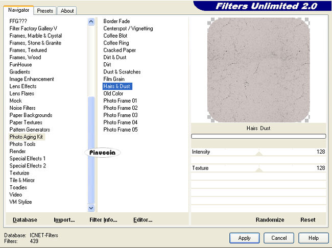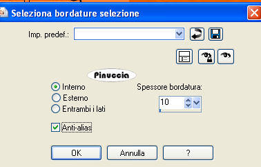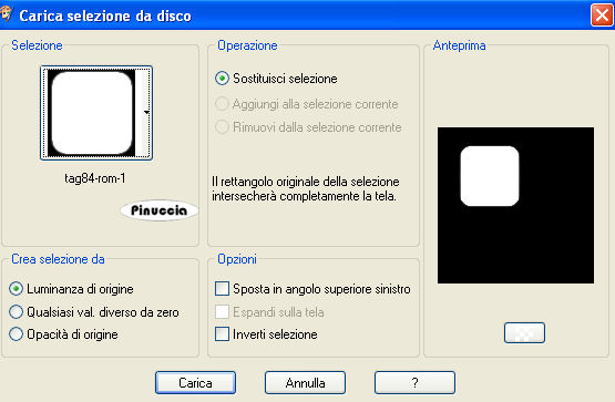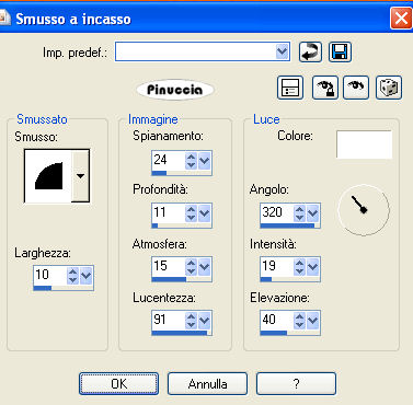 qui puoi trovare qualche risposta ai tuoi dubbi. Se l'argomento che ti interessa non è presente, ti prego di segnalarmelo. Questo tutorial è stato scritto con PSP Corel X2, ma può essere eseguito anche con le precedenti versioni. Per tradurlo, ho usato PSP X. Occorrente: Un tube e un ornamento a scelta. Il resto del materiale qui Filtri: Graphics Plus qui Filters Unlimited qui Photo Aging Kit qui I filtri Photo Aging Kit si usano importati in Filters Unlimited. Come fare vedi qui Metti la Selezione nella cartella Selezioni. Apri in PSP il resto del materiale, compresa la maschera. 1. Apri una nuova immagine trasparente 700 x 700 pixels. Scegli due colori dal tuo tube. Per seguire il mio esempio, imposta il colore di primo piano con il colore chiaro #E76302, e il colore di sfondo con il nero #000000. 2. Riempi l'immagine trasparente con il colore scuro di sfondo.Livelli>Nuovo livello raster. Riempi il livello con il colore chiaro di primo piano.Livelli>Nuovo livello maschera>Da immagine. Apri il menu sotto la finestra di origine e vedrai la lista dei files aperti. Seleziona la maschera Bug's Eye2, con i seguenti settaggi. ![]() Livelli>Elimina e rispondi sì alla domanda Unire la maschera nel livello corrente. ![]() Livelli>Unisci>Unisci gruppo. ![]() 3. Livelli>Nuovo livello raster. Selezione>Carica/Salva selezione>Carica selezione da disco. Cerca e carica la selezione "tag84-rom-1": ![]() 4. Selezione>Modifica>Seleziona bordature selezione: ![]() Riempi la selezione con il colore scuro di sfondo.5. Effetti>Effetti 3D>Smusso a incasso, con i seguenti settaggi: ![]() Selezione>Deseleziona. 6. Attiva lo strumento Bacchetta magica ![]() ![]() e clicca all'interno della cornice per selezionarla. Selezione>Modifica>Espandi - 3 pixels. 7. Livelli>Nuovo livello raster. Riempi con il colore #D0C6C4.Effetti>Plugins>Filters Unlimited - Photo Aging Kit - Haris and Dust, con i settaggi standard. ![]() Selezione>Deseleziona. Livelli>Disponi>Sposta giù. 8. Attiva il livello superiore. Livelli>Unisci>Unisci giù. Livelli>Duplica. Immagine>Rifletti. Immagine>Capovolgi. 9. Livelli>Unisci>Unisci giù. Effetti>Effetti 3D>Sfalsa ombra, con i seguenti settaggi. ![]() 10. Se tutto è andato bene, dovresti avere questo. ![]() 11. Attiva il tube "Doodle-art" e vai a Modifica>Copia. Torna al tuo lavoro e vai a Modifica>Incolla come nuovo livello. Immagine>Ridimensiona, al 90%, tutti i livelli non selezionato. Spostalo ![]() 12. Livelli>Duplica. Immagine>Rifletti. Immagine>Capovolgi. Livelli>Unisci>Unisci giù. Effetti>Effetti 3D>Sfalsa ombra, con i settaggi precedenti. Dovresti avere questo: ![]() 13. Attiva il tube "Streifen". Attiva lo strumento Selezione , rettangolo,e seleziona la striscia più piccola a sinistra. Modifica>Copia. Torna al tuo lavoro e vai a Modifica>Incolla come nuovo livello. 14. Livelli>Duplica. Immagine>Ruota per gradi - 900 gradi a destra. ![]() Posiziona le due strisce come nell'esempio.![]() Assicurati di essere posizionato sul livello superiore. Livelli>Unisci>Unisci giù. 15. Livelli>Duplica. Immagine>Ridimensiona, all'80%, tutti i livelli non selezionato. Posiziona le strisce come nell'esempio.![]() 16. Attiva nuovamente il tube "Streifen". Selezione>Deseleziona. Attiva lo strumento Selezione , rettangolo,e seleziona la striscia più grande a destra. Modifica>Copia. Torna al tuo lavoro e vai a Modifica>Incolla come nuovo livello. 17. Livelli>Duplica. Immagine>Ruota per gradi - come al punto 14. Posiziona le due strisce come nell'esempio.![]() Assicurati di essere posizionato sul livello superiore. Livelli>Unisci>Unisci giù, 2 volte. Effetti>Effetti 3D>Sfalsa ombra, come al punto 9. 17. Livelli>Duplica. Immagine>Rifletti. Immagine>Capovolgi. Dovresti avere questo. ![]() 18. Attiva il tube "kurbis" e vai a Modifica>Copia. Torna al tuo lavoro e vai a Modifica>Incolla come nuovo livello. Sposta la zucca in basso a destra nel riquadro.Livelli>Duplica, e sposta la seconda zucca un po' più a sinistra, senza farla uscire dai bordi.19. Livelli>Duplica. Immagine>Ridimensiona, al 70%, tutti i livelli non selezionato. Livelli>Duplica. Immagine>Ridimensiona, all'80%, tutti i livelli non selezionato. Sistema le zucche nel riquadro come nel mio esempio.Assicurati di essere posizionato sul livello superiore. Livelli>Unisci>Unisci giù, 3 volte, e avrai le zucche in un unico livello. Effetti>Effetti 3D>Sfalsa ombra, come al punto 9. 20. Attiva il tuo tube-ornamento (il mio è un gatto), e vai a Modifica>Copia. Torna al tuo lavoro e vai a Modifica>Incolla come nuovo livello. Spostalo nel riquadro in alto a sinistra.Effetti>Effetti 3D>Sfalsa ombra, come al punto 9. 21. Attiva il tuo tube e vai a Modifica>Copia. Torna al tuo lavoro e vai a Modifica>Incolla come nuovo livello. Posiziona il tube sulle zucche.Effetti>Effetti 3D>Sfalsa ombra, con i seguenti settaggi: ![]() 22. Attiva lo strumento Testo , scegli un font e scrivi un testo nel riquadro a sinistra.Immagine>Ruota per gradi - 30 gradi a sinistra: ![]() Effetti>Effetti 3D>Sfalsa ombra, con i seguenti settaggi: ![]() 23. Aggiungi il tuo nome e/o il tuo watermark. 24. Immagine>Aggiungi bordatura, 2 pixels, simmetriche, con il colore #000000. Immagine>Aggiungi bordatura, 2 pixels, simmetriche, con il colore #E76304. Immagine>Aggiungi bordatura, 2 pixels, simmetriche, con il colore #000000. 25. Immagine>Aggiungi bordatura, 25 pixels, simmetriche, con il colore #E76304. Seleziona questo bordo con la bacchetta magica ![]() Effetti>Plugins>Graphics Plus - Cross Shadow, con i settaggi standard. ![]() Selezione>Deseleziona. 26. Immagine>Aggiungi bordatura, 2 pixels, simmetriche, con il colore #000000. Immagine>Aggiungi bordatura, 2 pixels, simmetriche, con il colore #E76304. Immagine>Aggiungi bordatura, 2 pixels, simmetriche, con il colore #000000. Hai finito. Salva in formato jpg. ![]() ![]() Se hai problemi o dubbi, o trovi un link non funzionante, o anche soltanto per un saluto, scrivimi. 10 Ottobre 2008 |