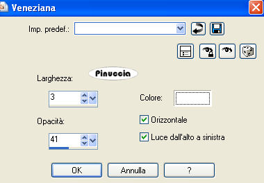 qui puoi trovare qualche risposta ai tuoi dubbi. Se l'argomento che ti interessa non è presente, ti prego di segnalarmelo. Questo tutorial è stato scritto con PSP Corel 11, ma può essere eseguito anche con le precedenti versioni. Per tradurlo, ho usato PSP X. Occorrente: Materiale qui L'autrice del tutorial originale non ha fornito l'animazione usata per il suo esempio. Filtri: Graphics Plus qui Metti le selezioni nella cartella Selezioni. Metti il pennello nella cartella dei Pennelli. Attenzione, il pennello è composto da due files che non devono essere separati. Vedi sui pennelli alcuni appunti qui 1. Apri una nuova immagine trasparente 750 x 600 pixels. Scegli due colori dal tuo tube. Io ho scelto come colore di primo piano il colore chiaro #3B588F, e come colore di sfondo il colore scuro #7CBEF2. 2. Selezione>Carica/Salva selezione>Carica selezione da disco. Cerca e carica la selezione "tag-rom-001-6": ![]() Riempi la selezione con il colore nero.Selezione>Modifica>Contrai, 2 pixels. Riempi la selezione con il colore chiaro di sfondo.Effetti>Effetti di trama>Veneziana, con i seguenti settaggi. ![]() Selezione>Deseleziona. 3. Livelli>Nuovo livello raster. Selezione>Carica/Salva selezione>Carica selezione da disco. Cerca e carica la selezione "tag-rom-01-6". ![]() Riempi la selezione con il colore scuro di primo piano.Selezione>Deseleziona. 4. Livelli>Nuovo livello raster. Selezione>Carica/Salva selezione>Carica selezione da disco. Cerca e carica la selezione "tag-rom-02-6". ![]() Riempi la selezione con il colore scuro di primo piano.Selezione>Deseleziona. 5. Livelli>Nuovo livello raster. Selezione>Carica/Salva selezione>Carica selezione da disco. Cerca e carica la selezione "tag-rom-03-6". ![]() Riempi la selezione con il colore scuro di primo piano.Selezione>Deseleziona. 6. Livelli>Nuovo livello raster. Selezione>Carica/Salva selezione>Carica selezione da disco. Cerca e carica la selezione "tag-rom-04-6". ![]() Riempi la selezione con il colore scuro di primo piano.Selezione>Deseleziona. 7. Livelli>Nuovo livello raster. Selezione>Carica/Salva selezione>Carica selezione da disco. Cerca e carica la selezione "tag-rom-05-6". ![]() Riempi la selezione con il colore scuro di primo piano.Selezione>Deseleziona. 8. Livelli>Nuovo livello raster. Attiva lo strumento Pennello ![]() cerca e seleziona il pennello "dreams01", con i seguenti settaggi: ![]() come puoi vedere dal segno rosso, può capitare che anche il tuo software non ti consenta di superare i 500 pixels. In questo caso, imposta 500 pixels, e poi ingrandisci il pennello, attivando il puntatore ![]() Applica il pennello cliccando una volta con il tasto sinistro del mouse per usare il colore di primo piano. Livelli>Duplica. Immagine>Rifletti. Posiziona i pennelli all'interno del riquadro e dovresti avere questo:![]() 9. Livelli>Unisci>Unisci visibile. Effetti>Effetti 3D>Sfalsa ombra: ![]() Livelli>Duplica. Immagine>Ridimensiona, al 65%, tutti i livelli non selezionato. Livelli>Duplica. Attiva il livello sottostante: Immagine>Ruota per gradi - 15 gradi a sinistra: ![]() Attiva il livello della copia. Immagine>Ruota per gradi - 15 gradi a destra: ![]() Sposta le immagini come nel mio esempio.![]() 10. Livelli>Nuovo livello raster. Riempi la selezione con il colore scuro di primo piano.Effetti>Plugins>Graphics Plus - Cross Shadow, con i settaggi standard. ![]() Livelli>Disponi>Porta sotto. 11. Apri il tube "CD_BeautifulAnime2" e vai a Modifica>Copia. Torna al tuo lavoro e vai a Modifica>Incolla come nuovo livello. Sposta il tube a sinistra, come nel mio esempio.12. Attiva lo strumento Testo ![]() e scrivi il tuo nome o un testo sull'immagine. Se vuoi, aggiungi il tuo watermark. 13. Immagine>Aggiungi bordatura, 1 pixel, simmetriche, con il colore #3B588F. Immagine>Aggiungi bordatura, 1 pixel, simmetriche, con il colore #7CBEF2. Immagine>Aggiungi bordatura, 1 pixel, simmetriche, con il colore #3B588F. 14. Modifica>Copia. Apri Animation Shop. Clicca con il tasto destro del mouse sullo spazio vuoto e Incolla come nuova animazione. ![]() Modifica>Duplica, e avrai due fotogrammi. Clicca sul primo fotogramma e vai a Modifica>Seleziona tutto. Apri "cupidshrtsgold_7463", anche questo composto da due fotogrammi. Clicca sul primo fotogramma per selezionarlo e vai a Modifica>Seleziona tutto, Modifica>Copia. Torna al tuo lavoro e vai a Modifica>Incolla>Incolla nel fotogramma selezionato. Controlla il risultato cliccando su Visualizza e salva in formato gif.se vuoi usare il bling trovato sul sito "nmstutorial", segui lo stesso procedimento, ma duplicando i fotogrammi del tuo lavoro fino ad ottenere 20 fotogrammi. ![]() Se hai problemi o dubbi, o trovi un link non funzionante, o anche soltanto per un saluto, scrivimi. 2 Giugno 2008 |