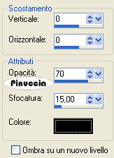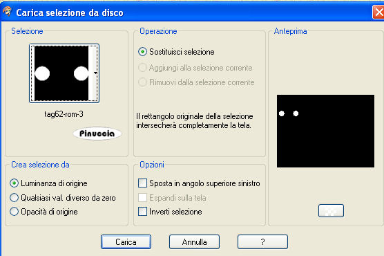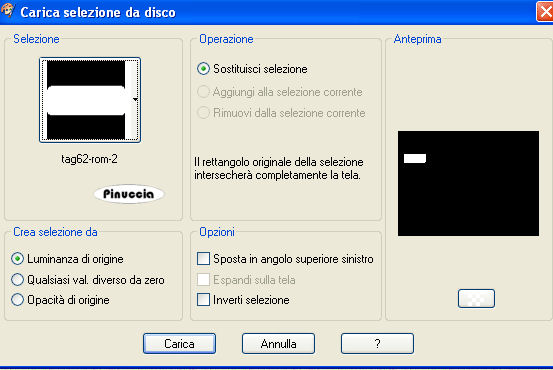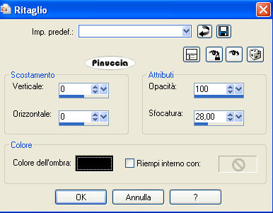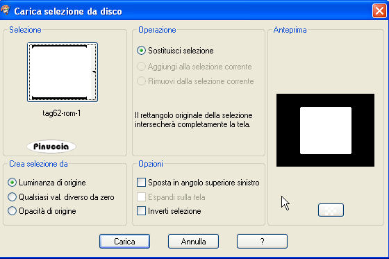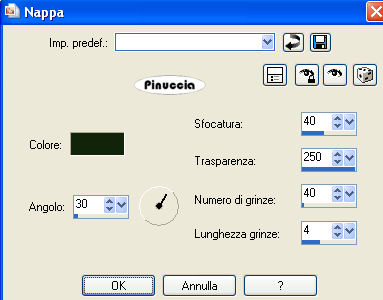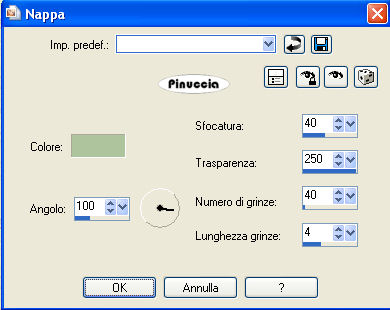 qui puoi trovare qualche risposta ai tuoi dubbi. Se l'argomento che ti interessa non è presente, ti prego di segnalarmelo. Questo tutorial è stato scritto con PSP Corel X2, ma può essere eseguito anche con le precedenti versioni. Per tradurlo, ho usato PSP X. Occorrente: Il tube di una pianta e il tube di un personaggio. Il resto del materiale qui I tubes che ho usato sono di Outlawofdesign Metti le Selezioni nella cartella Selezioni. 1. Apri una nuova immagine trasparente 800 x 600 pixels. Scegli tre colori dal tuo tube. Scegli un colore chiaro (il mio ##E7EEC8) e un colore medio (il mio #AEC49D). Dovrai alternarli come colore di primo piano (il primo che userai sarà il colore medio). Imposta il colore di sfondo con il colore scuro (il mio #13240C). 2. Livelli>Nuovo livello raster. Selezione>Carica/salva selezione>Carica selezione da disco. Cerca e carica la selezione "tag62-rom-1": ![]() Riempi la selezione con il colore scuro di sfondo.3. Selezione>Modifica>Contrai - 3 pixels. Riempi con il colore medio #AEC49D.Selezione>Modifica>Contrai - 7 pixels. Riempi con il colore scuro di sfondo.Selezione>Modifica>Contrai - 3 pixels. Riempi con il colore chiaro #E7EEC8.4. Mantieni selezionato. Effetti>Effetti di trama>Nappa, con i seguenti settaggi: ![]() Selezione>Deseleziona. 5. Effetti>Effetti 3D>Sfalsa ombra: ![]() 6. Livelli>Nuovo livello raster. Selezione>Carica/Salva selezione>Carica selezione da disco. Cerca e carica la selezione "tag62-rom-2": ![]() Riempi la selezione con il colore scuro di sfondo.Selezione>Modifica>Contrai - 3 pixels. Riempi con il colore medio #AEC49D.Selezione>Deseleziona. 7. Livelli>Nuovo livello raster. Selezione>Carica/Salva selezione>Carica selezione da disco. Cerca e carica la selezione "tag62-rom-3": ![]() Riempi con il colore scuro di sfondo.Selezione>Deseleziona. Livelli>Unisci>Unisci giù. 8. Livelli>Duplica, 2 volte e avrai tre livelli. Sposta i tre livelli uno sopra l'altro (vedi l'esempio).Attiva lo strumento Bacchetta magica ![]() e clicca all'interno del rettangolo centrale per selezionarlo. Riempi la selezione con il colore chiaro #E7EEC8.Dovresti avere questo: ![]() 9. Assicurati di essere posizionato sul livello superiore. Livelli>Unisci>Unisci giù, 2 volte. Livelli>Duplica. Immagine>Rifletti. Immagine>Capovolgi. Livelli>Unisci>Unisci giù. Effetti>Effetti 3D>Sfalsa ombra, come al punto 5. Dovresti avere questo: ![]() 10. Livelli>Nuovo livello raster. Selezione>Carica/Salva selezione>Carica selezione da disco. Cerca e carica la selezione "tag62-rom-4": ![]() Riempi la selezione con il colore scuro di sfondo.Selezione>Deseleziona. Effetti>Effetti 3D>Sfalsa ombra, come al punto 5. Dovresti avere questo: ![]() 11. Attiva il livello Raster 1. Selezione>Seleziona tutto. Apri il file di sfondo "gh_texture_13" e vai a Modifica>Copia. Torna al tuo lavoro e vai a Modifica>Incolla nella selezione. Regola>Messa a fuoco>Metti a fuoco. Selezione>Deseleziona. 12. Attiva nuovamente il livello superiore. Apri il tube del fiore e vai a Modifica>Copia. Torna al tuo lavoro e vai a Modifica>Incolla come nuovo livello. Posiziona il tube nel rettangolo grande,in modo che esca un po' dai bordi. Effetti>Effetti 3D>Sfalsa ombra, con i seguenti settaggi. ![]() 13. Apri il tube "jcw_face_Raffi" e vai a Modifica>Copia. Torna al tuo lavoro e vai a Modifica>Incolla come nuovo livello. Immagine>Rifletti. Sposta il tube nell'angolo in alto a destra.Immagine>Ruota per gradi - 10 gradi a sinistra: ![]() Cambia la modalità di miscelatura di questo livello in Luminanza (esistente). 13. Apri il tube della donna e vai a Modifica>Copia. Torna al tuo lavoro e vai a Modifica>Incolla come nuovo livello. Sposta il tube a sinistra (Vedi il mio esempio).Livelli>Duplica, 2 volte. Attiva il livello inferiore del tube (il livello originale). ![]() Effetti>Effetti di distorsione>Vento - da sinistra, intensità 100: ![]() Regola>Sfocatura>Sfocatura gaussiana - raggio 20. ![]() 14. Attiva il livello centrale del tube. Effetti>Effetti di distorsione>Vento - da destra, intensità 100. ![]() Regola>Sfocatura>Sfocatura gaussiana - raggio 20. Attiva il livello superiore del tube. Effetti>Effetti 3D>Sfalsa ombra, con i settaggi precedenti. ![]() 15. Attiva lo strumento Testo , scegli un font e scrivi il tuo nome o un testo.Se vuoi, aggiungi il tuo watermark. 16. Immagine>Aggiungi bordatura, 2 pixels, simmetriche, con il colore #E7EEC8. Seleziona questo bordo con la bacchetta magica ![]() ![]() Selezione>Inverti. Effetti>Effetti 3D>Ritaglio: ![]() Selezione>Deseleziona. 17. Immagine>Aggiungi bordatura, 25 pixels, simmetriche con il colore #13240C. Seleziona questo bordo con la bacchetta magica ![]() Effetti>Effetti di Trama>Nappa, con i seguenti settaggi: ![]() Selezione>Deseleziona. 18. Immagine>Aggiungi bordatura, 2 pixels, simmetriche, con il colore #E7EEC8. Hai finito. Puoi salvare in formato jpg. Il tube usato per questo esempio è di Lori Rhae. ![]() Se hai problemi o dubbi, o trovi un link non funzionante, o anche soltanto per un saluto, scrivimi. 12 Novembre 2008 |