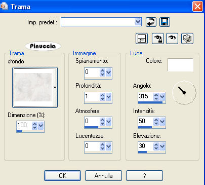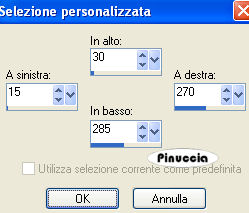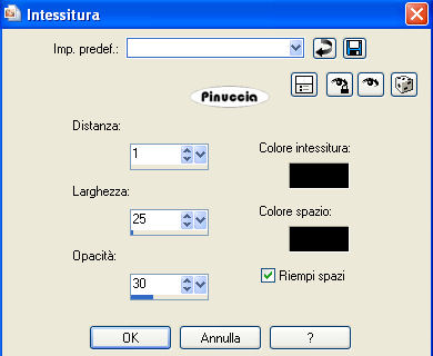 qui puoi trovare qualche risposta ai tuoi dubbi. Se l'argomento che ti interessa non è presente, ti prego di segnalarmelo. Questo tutorial è stato scritto con Corel X2, ma può essere eseguito anche con le altre versioni di PSP. Per tradurlo, ho usato PSP X. Occorrente: Materiale qui Filtri: Xero - Porcelain qui Metti la selezione nella cartella Selezioni. 1. Apri una nuova immagine trasparente 600 x 600 pixels. Scegli due colori dal tube o usa i miei. Imposta il colore di primo piano con il colore scuro #FF6CA6, e il colore di sfondo con il colore chiaro #F9F1FF. 2. Apri il tube "bg1", e vai a Modifica>Copia. Torna al tuo lavoro e vai a Modifica>Incolla come nuovo livello. Immagine>Ridimensiona, all'80%, tutti i livelli non selezionato. 3. Apri il tube "Floral2", e vai a Modifica>Copia. Torna al tuo lavoro e vai a Modifica>Incolla come nuovo livello. Immagine>Ridimensiona, al 60%, tutti i livelli non selezionato. Immagine>Rifletti. Spostalo in alto a destra, come nel mio esempio.Livelli>Duplica. Immagine>Capovolgi. Immagine>Rifletti. Livelli>Unisci>Unisci giù. 4. Effetti>Effetti 3D>Sfalsa ombra, con i seguenti settaggi: ![]() 5. Livelli>Nuovo livello raster. Selezione>Carica/Salva selezione>Carica selezione da disco. Cerca e carica la selezione "pfeile-rom", con i seguenti settaggi: ![]() Riempi con il colore scuro.per riempire la selezione con un solo clic, assicurati che la modalità di corrispondenza sia impostata su Nessuno ![]() Selezione>Deseleziona. 6. Effetti>Effetti 3D>Sfalsa ombra, con i seguenti settaggi. ![]() 7. Livelli>Nuovo livello raster. Attiva lo strumento Selezione ![]() clicca sull'icona Selezione personalizzata ![]() e imposta i seguenti settaggi: ![]() Riempi la selezione con il colore scuro.Effetti>Effetti di trama>Intessitura, con i seguenti settaggi: ![]() Selezione>Deseleziona. 8. Effetti>Effetti 3D>Sfalsa ombra, con i seguenti settaggi: ![]() Ripeti l'Effetto Sfalsa ombra, ma cambiando verticale e orizzontale con -3. ![]() 9. Livelli>Duplica. Immagine>Rifletti. Immagine>Capovolgi. Ancora Livelli>Duplica, e spostalo al centro, come nell'esempio.![]() 10. Attiva il livello Raster 1 - il livello trasparente. Riempi il livello con il colore chiaro di sfondo.Effetti>Effetti di trama>Trama, seleziona una trama a scelta, con i seguenti settaggi. ![]() 11. Attiva il livello superiore. Apri il tube "wordart-love", e vai a Modifica>copia. Torna al tuo lavoro e vai a Modifica>Incolla come nuovo livello. Spostalo nel rettangolo in alto a sinistra,o dove preferisci. 12. Apri il tube Pink_Shirt_na_27.03, e vai a Modifica>Copia. Torna al tuo lavoro e vai a Modifica>Incolla come nuovo livello. Immagine>Ridimensiona, all'80%, tutti i livelli non selezionato. Sposta il tube a destra, o dove preferisci.13. Effetti>Effetti 3D>Sfalsa ombra, con i seguenti settaggi: ![]() 14. Attiva lo strumento Testo e scrivi il tuo nome,o quello che preferisci. Se vuoi, puoi aggiungere il tuo watermark. 15. Immagine>Aggiungi bordatura, 1 pixel, simmetriche, con il colore scuro #FF6CA6. Immagine>Aggiungi bordatura, 35 pixels, simmetriche, con il colore chiaro #F9F1FF. Seleziona questo bordo con la bacchetta magica ![]() ![]() 16. Effetti>Effetti di trama>Intessitura, con i seguenti settaggi: ![]() Selezione>Deseleziona. Immagine>Aggiungi bordatura, 1 pixel, simmetriche, con il colore scuro #FF6CA6. 17. Effetti>Plugins>Xero - Porcelain, con i settaggi standard. ![]() Hai finito. Salva in formato jpg. ![]() Se hai problemi o dubbi, o trovi un link non funzionante, o anche soltanto per un saluto, scrivimi. 15 Maggio 2008 |