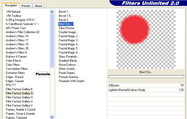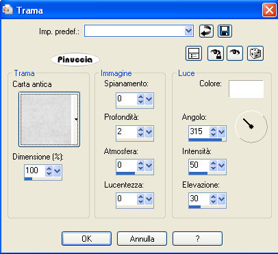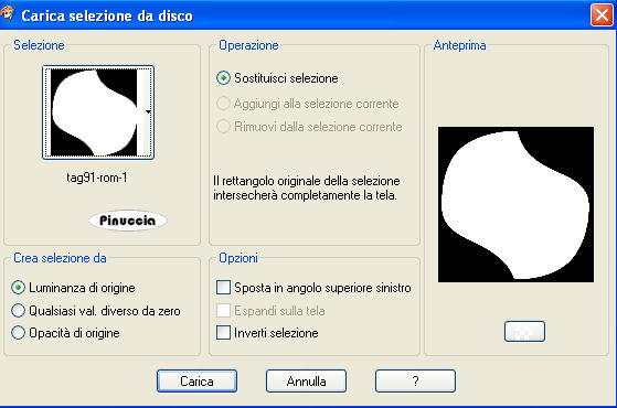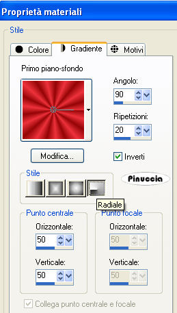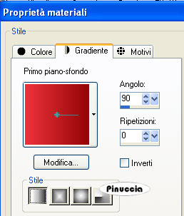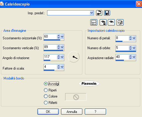 qui puoi trovare qualche risposta ai tuoi dubbi. Se l'argomento che ti interessa non è presente, ti prego di segnalarmelo. Questo tutorial è stato scritto con PSP Corel X2, ma può essere eseguito anche con le precedenti versioni. Per tradurlo, ho usato PSP X. Occorrente: A scelta il tube di un personaggio principale e il tube di un personaggio secondario (per esempio un gatto o un pipistrello). Il resto del materiale qui Il tube usato è di Yvonne. Filtro: Filters Unlimited qui Factory Gallery G (nello zip). I filtri Factory Gallery devono essere convertiti. Come fare vedi qui Si usano importandoli in Filters Unlimited (come fare vedi qui) ma possono funzionare anche da soli. Metti le Selezioni nella cartella Selezioni. 1. Apri una nuova immagine trasparente 700 x 700 pixels. Scegli due colori dal tube. Per seguire il mio esempio, imposta il colore di primo piano con il colore chiaro #EE323B, e il colore di sfondo con il colore scuro #940608. Passa il colore di primo piano a Gradiente di primo piano/sfondo: ![]() 2. Riempi l'immagine trasparente con il gradiente.Regola>Sfocatura>Sfocatura gaussiana - raggio 15. ![]() Effetti>Effetti di riflesso>Caleidoscopio, con i seguenti settaggi. ![]() Effetti>Effetti di bordo>Aumenta di più. 3. Livelli>Nuovo livello raster. Selezione>Carica/Salva selezione da disco. Cerca e carica la selezione "tag91-rom-1": ![]() Riempi la selezione con il colore bianco #ffffff.4. Selezione>modifica>Contrai - 3 pixels. Cambia i settaggi del gradiente: ![]() Riempi la selezione con il gradiente.5. Effetti>Effetti di trama>Trama - seleziona una trama a tua scelta, con i seguenti settaggi: ![]() Selezione>Deseleziona. 6. Effetti>Effetti 3D>Sfalsa ombra: ![]() 7. Livelli>Nuovo livello raster. Selezione>Carica/Salva selezione>Carica selezione da disco. Cerca e carica la selezione "tag91-rom-2": ![]() Riempi la selezione con il colore bianco #ffffff.Selezione>Modifica>Contrai - 3 pixels. Riempi con il colore di primo piano.Selezione>Deseleziona. Effetti>Effetti 3D>Sfalsa ombra, come al punto 6. 8. Livelli>Duplica. Effetti>Plugins>Filters Unlimited - Factory Gallery G - Blast Em: ![]() Livelli>Disponi>Sposta giù. Sposta l'immagine un po' più a destra, come nel mio esempio.![]() Attiva il livello superiore. 9. Livelli>Nuovo livello raster. Selezione>Carica/Salva selezione>Carica selezione da disco. Cerca e carica la selezione "tag91-rom-3": ![]() Riempi la selezione con il colore bianco #ffffff.Selezione>Modifica>Contrai - 3 pixels. Riempi con il colore scuro di sfondo.Selezione>Deseleziona. Effetti>Effetti 3D>Sfalsa ombra, come al punto 6. Ripeti il passo 8. 10. Livelli>Nuovo livello raster. Selezione>Carica/Salva selezione>Carica selezione da disco. Cerca e carica la selezione "tag91-rom-4": ![]() Riempi la selezione con il colore bianco #ffffff.Selezione>Modifica>Contrai - 3 pixels. Riempi con il colore #4b0304.Selezione>Deseleziona. Effetti>Effetti 3D>Sfalsa ombra, come al punto 6. Ripeti il passo 8. 11. Livelli>Nuovo livello raster. Selezione>Carica/Salva selezione>Carica selezione da disco. Cerca e carica la selezione "tag91-rom-5": ![]() Riempi la selezione con il colore bianco #ffffff.Selezione>Modifica>Contrai - 3 pixels. Riempi con il colore #2c0808.Selezione>Deseleziona. Effetti>Effetti 3D>Sfalsa ombra, come al punto 6. Ripeti il passo 8. 12. Se tutto è andato bene, dovresti avere questo. ![]() 13. Attiva il file di testo e vai a Modifica>Copia. Torna al tuo lavoro e vai a Modifica>Incolla come nuovo livello. Spostalo nello spazio vuoto in alto a destra.Effetti>effetti 3D>Sfalsa ombra come al punto 6, ma con il colore bianco. ![]() 14. Attiva il tuo tube e vai a Modifica>Copia. Torna al tuo lavoro e vai a Modifica>Incolla come nuovo livello. Sposta il tube in basso a sinistra, come nel mio esempio.Effetti>Effetti 3D>Sfalsa ombra, come al punto 6. ![]() 15. Attiva lo strumento Testo e scrivi il tuo nome.Se vuoi, aggiungi il tuo watermark. 16. Immagine>Aggiungi bordatura, 5 pixels, simmetriche, con il colore bianco #ffffff. Immagine>Aggiungi bordatura, 20 pixels, simmetriche, con il colore #940608. Seleziona questo bordo con la bacchetta magica ![]() ![]() Effetti>Effetti di trama>Trama, come al punto 5. Selezione>Deseleziona. 17. Immagine>Aggiungi bordatura, 10 pixels, simmetriche, con il colore bianco #ffffff. Seleziona il bordo con la bacchetta magica ![]() Effetti>Effetti 3D>Smusso a incasso: ![]() Selezione>Deseleziona. 18. Immagine>Aggiungi bordatura, 20 pixels, simmetriche, con il colore #940608. Seleziona il bordo con la bacchetta magica ![]() Effetti>Effetti di trama>Trama, come al punto 5. Selezione>Deseleziona. 19. Immagine>Aggiungi bordatura, 5 pixels, simmetriche, con il colore bianco #ffffff. Hai finito. Puoi salvare in formato jpg. Se hai problemi o dubbi, o trovi un link non funzionante, o anche soltanto per un saluto, scrivimi. 3 Novembre 2008 |