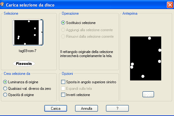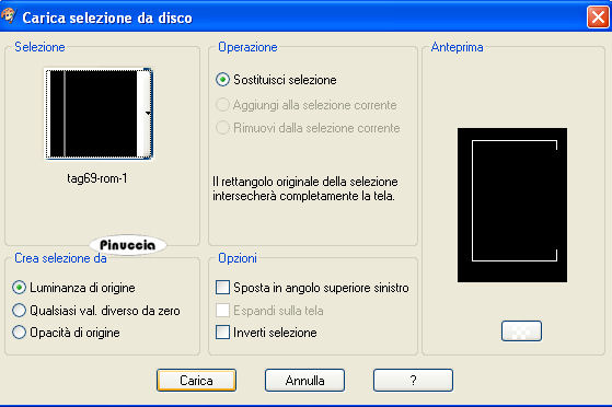 qui puoi trovare qualche risposta ai tuoi dubbi. Se l'argomento che ti interessa non è presente, ti prego di segnalarmelo. Questo tutorial è stato scritto con PSP Corel X2, ma può essere eseguito anche con le precedenti versioni. Per tradurlo, ho usato PSP X. Occorrente: Il tube di una donna. Il resto del materiale qui il titolo deriva dalla scelta dei tubes usati dall'autrice, che non fornisce i tubes e non ne indica la provenienza. Per i miei esempi ho usato tubes di Jet e Terry Metti le selezioni nella cartella Selezioni. 1. Apri una nuova immagine trasparente 500 x 700 pixels. Scegli due colori dal tuo tube. Per seguire il mio esempio, imposta il colore di primo piano con il colore scuro #5A2929, e il colore di sfondo con il bianco #ffffff. 2. Livelli>Nuovo livello raster. Selezione>Carica/Salva selezione>Carica selezione da disco. Cerca e carica la selezione "tag69-rom-1": ![]() Riempi la selezione con il colore di primo piano.Selezione>Deseleziona. 3. Effetti>Effetti 3D>Sfalsa ombra, con i seguenti settaggi. ![]() 4. Livelli>Nuovo livello raster. Selezione>Carica/Salva selezione>Carica selezione da disco. Cerca e carica la selezione "tag69-rom-2": ![]() Riempi la selezione con il colore di primo piano.Selezione>Deseleziona. Effetti>Effetti 3D>Sfalsa ombra, come al punto 3. 5. Ripeti il punto 4 con le selezioni 3-4-5-6, 6. Livelli>Nuovo livello raster. Selezione>Carica/Salva selezione>Carica selezione da disco. Cerca e carica la selezione "tag69-rom-7": ![]() Riempi la selezione con il colore di primo piano.Effetti>Effetti 3D>Smusso a incasso, con i seguenti settaggi: ![]() Selezione>Deseleziona. Effetti>Effetti 3D>Sfalsa ombra, come al punto 3. 7. Se tutto è andato bene, dovresti avere questo. ![]() 8. Attiva il livello raster 1. Selezione>Seleziona tutto. Attiva la trama Textur 12746186. Immagine>Ruota per gradi - 90 gradi a destra. ![]() Attiva lo strumento Selezione ![]() e traccia una selezione come nell'esempio: ![]() Modifica>Copia. Torna al tuo lavoro e vai a Modifica>Incolla nella selezione. Immagine>Rifletti. Immagine>Capovolgi. Effetti>Effetti di bordo>Aumenta. Modifica>Incolla come nuova IMMAGINE, la trama ti servirà più tardi: minimizzala per il momento. 8. Torna al tuo lavoro e attiva il livello superiore. Apri il tuo tube e vai a Modifica>Copia. Torna al tuo lavoro e vai a Modifica>Incolla come nuovo livello. Sposta il tube un po' più a destra o come ti sembra meglio.Effetti>Effetti 3D>Sfalsa ombra, con i seguenti settaggi: ![]() 9. Attiva lo strumento Testo e scrivi il tuo nome o un testo.Se vuoi, aggiungi il tuo watermark. 10. Immagine>Aggiungi bordatura, 1 pixel, simmetriche, con il colore #5A2929. Immagine>Aggiungi bordatura, 50 pixels, simmetriche, con il colore bianco #ffffff. Seleziona questo bordo con la bacchetta magica ![]() ![]() Attiva l'immagine della trama che hai minimizzato prima, e vai a Modifica>Copia. Torna al tuo lavoro e vai a Modifica>Incolla nella selezione. Effetti>Effetti di bordo>Aumenta. 11. Selezione>Inverti. Effetti>Effetti 3D>Sfalsa ombra, con i seguenti settaggi: ![]() Selezione>Deseleziona. Immagine>Aggiungi bordatura, 1 pixel, simmetriche, con il colore #5A2929. Hai finito. Puoi salvare in formato jpg. ![]() Se hai problemi o dubbi, o trovi un link non funzionante, o anche soltanto per un saluto, scrivimi. 28 Settembre 2008 |