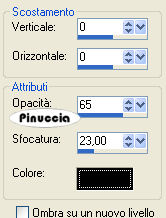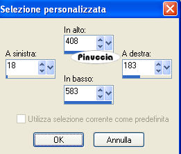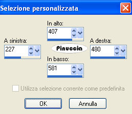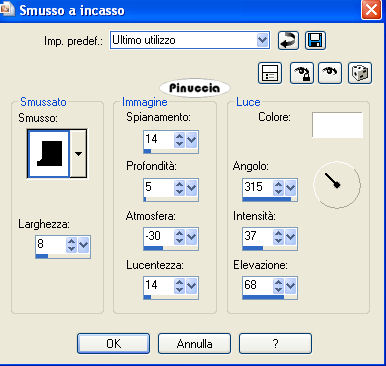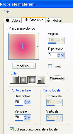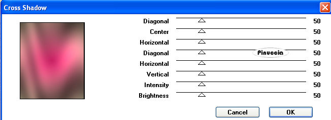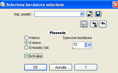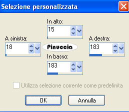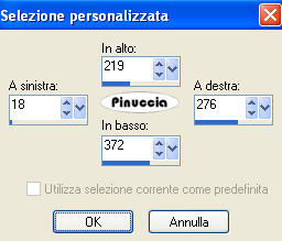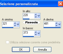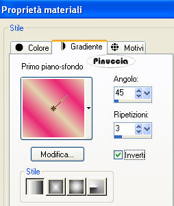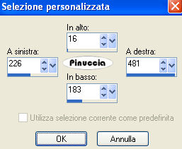 qui puoi trovare qualche risposta ai tuoi dubbi. Se l'argomento che ti interessa non è presente, ti prego di segnalarmelo. Questo tutorial è stato scritto con PSP Corel X2, ma può essere eseguito anche con le precedenti versioni. Per tradurlo, ho usato PSP X. Occorrente: A scelta, il tube di una donna e il tube di un ornamento. Il tube che ho usato è di Terry Filtri: Graphics Plus - Cross Shadow qui 1. Apri una nuova immagine trasparente 500 x 600 pixels. Scegli due colori dal tuo tube. Io ho usato come colore di primo piano il colore scuro #EA2774, e come colore di sfondo il colore chiaro #E3D2AD. 2. Livelli>Nuovo livello raster. Attiva lo strumento Selezione ,clicca sull'icona Selezione personalizzata ![]() e imposta i seguenti settaggi: ![]() Riempi la selezione con il colore di primo piano.3. Effetti>Effetti di trama>Veneziana, con i seguenti settaggi: ![]() 4. Selezione>Modifica>Seleziona bordature selezione. ![]() Riempi la selezione con il colore di sfondo.5. Effetti>Effetti 3D>Smusso a incasso, con i seguenti settaggi: ![]() Selezione>Deseleziona. 6. Effetti>Effetti 3D>Sfalsa ombra, con i seguenti settaggi: ![]() 7. Livelli>Nuovo livello raster. Selezione personalizzata ![]() ![]() Riempi la selezione con il colore di primo piano.Ripeti i passaggi da 3 a 6. 8. Livelli>Nuovo livello raster. Selezione personalizzata ![]() ![]() Riempi la selezione con il colore di primo piano.Ripeti i passaggi da 3 a 6. 9. Livelli>Nuovo livello raster. Selezione personalizzata ![]() ![]() Riempi la selezione con il colore di primo piano.Ripeti i passaggi da 3 a 6. 10. Livelli>Nuovo livello raster. Selezione personalizzata ![]() ![]() Riempi la selezione con il colore di primo piano.Ripeti i passaggi da 3 a 6. 11. Livelli>Nuovo livello raster. Selezione personalizzata ![]() ![]() Riempi la selezione con il colore di primo piano.Ripeti i passaggi da 3 a 6. 12. Passa il colore di primo piano a Gradiente, con i seguenti settaggi: ![]() 13. Attiva il livello Raster 1, e riempilo con il gradiente.Effetti>Plugins>Graphics Plus - Cross Shadow, con i seguenti settaggi: ![]() 14. Apri i tuoi tubes, copiali e incollali sul tuo lavoro. Posizionali come ti sembra meglio.Effetti>Effetti 3D>Sfalsa ombra, con i seguenti settaggi: ![]() 15. Attiva lo strumento Testo e scrivi il tuo nome o un testo.Se vuoi, aggiungi il tuo watermark. Effetti>Effetti 3D>Sfalsa ombra, con i settaggi usati al punto 6. ![]() 16. Immagine>Aggiungi bordatura, 10 pixels, simmetriche, con il colore bianco #ffffff. Seleziona il bordo con la bacchetta magica ![]() ![]() Cambia i settaggi del gradiente. ![]() Riempi la selezione con questo gradiente.17. Effetti>Effetti 3D>Smusso a incasso, con i settaggi usati al punto 5. ![]() Selezione>Deseleziona. Hai finito. Salva in formato jpg. ![]() Se hai problemi o dubbi, o trovi un link non funzionante, o anche soltanto per un saluto, scrivimi. 26 Maggio 2008 |