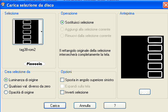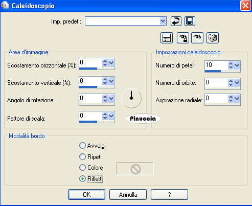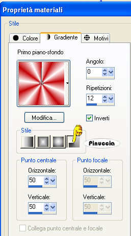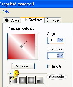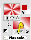 qui puoi trovare qualche risposta ai tuoi dubbi. Se l'argomento che ti interessa non è presente, ti prego di segnalarmelo. Questo tutorial è stato scritto con Corel X2, ma può essere eseguito anche con le altre versioni di PSP. Per tradurlo, ho usato PSP X. Occorrente: Materiale qui Metti le Selezioni nella cartella Selezioni. 1. Apri una nuova immagine trasparente 700 x 700 pixels. Scegli due colori dal tube. Io ho usato come colore di primo piano il colore #c20104, e come colore di sfondo il colore bianco #ffffff. Passa il colore di primo piano a Gradiente di primo piano/sfondo, con i seguenti settaggi: ![]() Passa il colore di sfondo a Gradiente di primo piano/sfondo, con i seguenti settaggi: ![]() ![]() 2. Riempi l'immagine con il colore di sfondo bianco.per passare da gradiente a colore e viceversa, senza aprire la paletta dei materiali: clicca sul triangolino indicato dalla freccetta, ![]() e, dal menu che si aprirà, seleziona il colore o il gradiente, a seconda della necessità. ![]() Livelli>Nuovo livello raster. Riempi il nuovo livello con il gradiente di primo piano.3. Regola>Sfocatura>Sfocatura gaussiana, raggio 15. ![]() 4. Effetti>Effetti di riflesso>Caleidoscopio, con i seguenti settaggi: ![]() Abbassa l'opacità di questo livello al 50%. 5. Livelli>Nuovo livello raster. Selezione>Carica/Salva selezione>Carica selezione da disco. Cerca e carica la selezione "tag38-rom1", con i seguenti settaggi: ![]() Riempi la selezione con il colore rosso di primo piano.6. Effetti>Effetti 3D>Smusso a incasso, con i seguenti settaggi: ![]() Selezione>Deseleziona. 7. Effetti>Effetti 3D>Sfalsa ombra, con i seguenti settaggi: ![]() 8. Livelli>Nuovo livello raster. Selezione>Carica/Salva selezione>Carica selezione da disco. Cerca e carica la selezione "tag38-rom2", con i settaggi precedenti: ![]() (questi settaggi saranno gli stessi delle prossime selezioni). Riempi la selezione con il colore di primo piano rosso.Effetti>Effetti 3D>Smusso a incasso, con i settaggi precedenti (punto 6). Selezione>Deseleziona. Effetti>Effetti 3D>Sfalsa ombra, con i settaggi precedenti (punto 7). 9. Livelli>Nuovo livello raster. Selezione>Carica/Salva selezione>Carica selezione da disco. Cerca e carica la selezione "tag38-rom3", con i settaggi precedenti. Riempi la selezione con il gradiente di sfondo.Effetti>Effetti 3D>Smusso a incasso, con i settaggi precedenti (punto 6). Selezione>Deseleziona. Effetti>Effetti 3D>Sfalsa ombra, con i settaggi precedenti (punto 7). 10. Livelli>Nuovo livello raster. Selezione>Carica/Salva selezione>Carica selezione da disco. Cerca e carica la selezione "tag38-rom4", con i settaggi precedenti. Riempi la selezione con il colore di primo piano rosso.Effetti>Effetti 3D>Smusso a incasso, con i settaggi precedenti (punto 6). Selezione>Deseleziona. Livelli>Duplica. Immagine>Capovolgi. Livelli>Unisci>Unisci giù. Effetti>Effetti 3D>Sfalsa ombra, con i settaggi precedenti (punto 7). 11. Attiva lo strumento Testo ![]() scrivi il tuo nome o un testo. Se vuoi, aggiungi il tuo watermark. 12. Apri il tube della donna, e vai a Modifica>Copia. Torna al tuo lavoro e vai a Modifica>Incolla come nuovo livello. Spostalo in basso sul bordo.Effetti>Effetti 3D>Sfalsa ombra, con i settaggi precedenti (punto 7). 13. Immagine>Aggiungi bordatura, 2 pixels, simmetriche, con il colore bianco #FFFFFF. Immagine>Aggiungi bordatura, 2 pixels, simmetriche, con il colore rosso #C20104. Immagine>Aggiungi bordatura, 2 pixels, simmetriche, con il colore bianco #FFFFFF. Hai finito. Salva in formato jpg. ![]() Se hai problemi o dubbi, o trovi un link non funzionante, o anche soltanto per un saluto, scrivimi. 15 Maggio 2008 |
