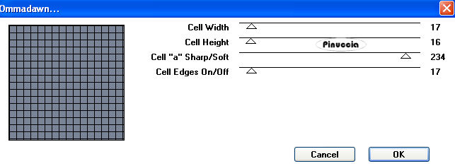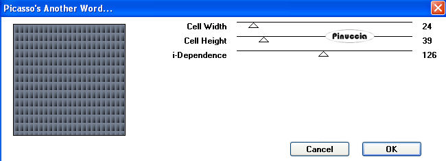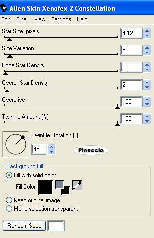 qui puoi trovare qualche risposta ai tuoi dubbi. Se l'argomento che ti interessa non è presente, ti prego di segnalarmelo. Questo tutorial è stato scritto con PSP Corel X2, ma può essere eseguito anche con le precedenti versioni. Per tradurlo, ho usato PSP X. Occorrente: Materiale qui Filtri: Alien Skin - Xenofex 2 - Constellation qui Filters Unlimited qui Toadies - Banding Suppress Noise qui Toadies si usa importato in Filters Unlimited (come importare un filtro in Unlimited vedi qui) ma funziona anche da solo 1. Apri una nuova immagine trasparente 6500x 650 pixels. Scegli due colori. Io ho scelto come colore di primo piano il colore chiaro #798496, e come colore di sfondo il colore scuro #000000. 2. Riempi con il colore di primo piano.Effetti>Plugins>Filters Unlimited - Toadies - Ommadawn, con i seguenti settaggi: ![]() 3. Attiva lo strumento Deformazione premendo sulla tastiera il tasto D, e usa il nodo superiore sinistro e il nodo inferiore destro per deformare l'immagine come nell'esempio. ![]() 4. Tenendo premuto il tasto della maiuscola deforma l'immagine come nell'esempio. ![]() 5. Effetti>Effetti 3D>Sfalsa ombra, con i seguenti settaggi: ![]() 6. Il risultato dovrebbe essere questo: ![]() 7. Livelli>Nuovo livello raster. Riempi nuovamente con il colore di primo piano.Effetti>Plugins>Filters Unlimited - Toadies - Picasso Another Word, con i seguenti settaggi. ![]() 8. Effetti>Effetti geometrici>Cerchio. ![]() Immagine>Ridimensiona, al 50%, tutti i livelli non selezionato. Effetti>Effetti 3D>Sfalsa ombra, con i settaggi precedenti (punto 5). Livelli>Duplica. Immagine>Ridimensiona, al 50%, tutti i livelli non selezionato. Posiziona le forme come nell'esempio.![]() 9. Livelli>Nuovo livello raster. Riempi con il colore di sfondo.Effetti>Plugins>Xenofex 2 - Constellation, con i seguenti settaggi: ![]() Livelli>Disponi>Porta sotto. 10. Apri il tube "HjimeSorayama-other007-ptv", e vai a Modifica>Copia. Torna al tuo lavoro e vai a Modifica>Incolla come nuovo livello. Immagine>Ridimensiona, al 40%, tutti i livelli non selezionato. Immagine>Rifletti. Immagine>Ruota per gradi - 45 gradi a sinistra. ![]() Effetti>Effetti 3D>Sfalsa ombra, con i settaggi precedenti (punto 5). Sposta il tube in basso a sinistra, come nel mio esempio.11. Apri il tube "Hajime-Sorayamma-robo06-ptv", e vai a Modifica>Copia. Torna al tuo lavoro e vai a Modifica>Incolla come nuovo livello. Sposta il tube a destra.Effetti>Effetti 3D>Sfalsa ombra, con i settaggi precedenti (punto 5). 12. Attiva lo strumento Testo ,e scrivi il tuo nome o un testo. Se vuoi, aggiungi il tuo watermark. 13. Immagine>Aggiungi bordatura, 1 pixel, simmetriche, con il colore bianco #ffffff. Immagine>Aggiungi bordatura, 50 pixels, simmetriche, con il colore nero #000000. Immagine>Aggiungi bordatura, 50 pixels, simmetriche, con il colore bianco #ffffff. Hai finito. Salva in formato jpg. ![]() Se hai problemi o dubbi, o trovi un link non funzionante, o anche soltanto per un saluto, scrivimi. 20 Maggio 2008 |