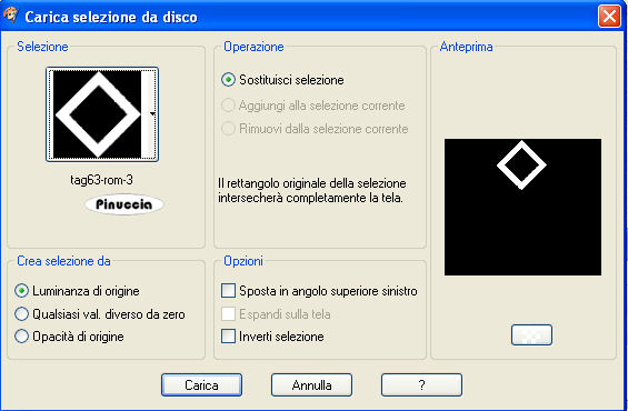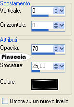 qui puoi trovare qualche risposta ai tuoi dubbi. Se l'argomento che ti interessa non è presente, ti prego di segnalarmelo. Questo tutorial è stato scritto con PSP Corel X2, ma può essere eseguito anche con le precedenti versioni. Per tradurlo, ho usato PSP X. Occorrente: A scelta il tube di una cascata e il tube di una donna. Il resto del materiale qui Per il mio esempio ho usato un tube di Caro. Metti le Selezioni nella cartella Selezioni. Filtri: Sybia - Zigzagge (nello zip). Eye Candy 4000 - Swirl qui 1. Apri una nuova immagine trasparente 800 x 700 pixels. Scegli due colori dal tuo tube. Imposta il colore di primo piano con il colore chiaro (il mio #E7EEC8), e il colore di sfondo con il colore scuro (il mio #004000). 2. Livelli>Nuovo livello raster. Selezione>Carica/Salva selezione>Carica selezione da disco. Cerca e carica la selezione "tag63-rom-1". ![]() 3. Attiva il tuo tube con la cascata e vai a Modifica>Copia. Torna al tuo lavoro e vai a Modifica>Incolla come nuovo livello. Se il tube non copre interamente la selezione, ridimensionalo nella misura necessaria. Selezione>Inverti. Premi sulla tastiera il tasto CANC ![]() Selezione>Inverti. 4. Selezione>Modifica>Espandi - 2 pixels. Livelli>Nuovo livello raster. Riempi con il colore chiaro di primo piano.Livelli>Disponi>Sposta giù. Attiva il livello superiore. Livelli>Unisci>Unisci giù. Selezione>Deseleziona. 5. Effetti>Effetti 3D>Sfalsa ombra, con i seguenti settaggi: ![]() 6. Livelli>Nuovo livello raster. Selezione>Carica/Salva selezione>Carica selezione da disco. Cerca e carica la selezione "tag63-rom-2". ![]() Riempi la selezione con il colore chiaro di primo piano.7. Selezione>Modifica>Espandi - 2 pixels. Livelli>Nuovo livello raster. Riempi con il colore scuro di sfondo.Livelli>Disponi>Sposta giù. Attiva il livello superiore. Livelli>Unisci>Unisci giù. Selezione>Deseleziona. Effetti>Effetti 3D>Sfalsa ombra, come al punto 5. 8. Livelli>Nuovo livello raster. Selezione>Carica/Salva selezione>Carica selezione da disco. Cerca e carica la selezione "tag63-rom-3". ![]() Riempi con il colore chiaro di primo piano.9. Ripeti il passo 7. 10. Livelli>Nuovo livello raster. Selezione>Carica/Salva selezione>Carica selezione da disco. Cerca e carica la selezione "tag63-rom-4". Riempi con il colore chiaro di primo piano.11. Ripeti il passo 7. 12. Livelli>Nuovo livello raster. Selezione>Carica/Salva selezione>Carica selezione da disco. Cerca e carica la selezione "tag63-rom-5". Riempi con il colore chiaro di primo piano.13. Ripeti il passo 7. 14. Livelli>Nuovo livello raster. Selezione>Carica/Salva selezione>Carica selezione da disco. Cerca e carica la selezione "tag63-rom-6". Riempi con il colore scuro di sfondo.15. Selezione>Modifica>Espandi - 2 pixels. Livelli>Nuovo livello raster. Riempi con il colore di primo piano.Livelli>Disponi>Sposta giù. Attiva il livello superiore. Livelli>Unisci>Unisci giù. Selezione>Deseleziona. Effetti>Effetti 3D>Sfalsa ombra, come al punto 5. 16. Livelli>Nuovo livello raster. Selezione>Carica/Salva selezione>Carica selezione da disco. Cerca e carica la selezione "tag63-rom-7". Riempi con il colore scuro di sfondo.17. Ripeti il passo 15. Dovresti avere questo: ![]() 18. Passa il colore di primo piano a Gradiente di primo piano/sfondo, con i seguenti settaggi: ![]() Attiva il livello Raster 1, e riempilo con il gradiente.Regola>Sfocatura>Sfocatuta gaussiana - raggio 50. ![]() 19. Effetti>Plugins>Eye Candy 4000 - Swirl: ![]() 20. Effetti>Plugins>Sybia - Zigzagge: ![]() 21. Attiva il livello superiore. Apri il tuo tube e vai a Modifica>Copia. Torna al tuo lavoro e vai a Modifica>Incolla come nuovo livello. Posizionalo come ti sembra meglio.Effetti>Effetti 3D>Sfalsa ombra: ![]() 22. Attiva lo strumento Testo e scrivi il tuo nome o un testo.Se vuoi, aggiungi il tuo watermark. 23. Immagine>Aggiungi bordatura, 2 pixels, simmetriche, con il colore #E7EEC8. Immagine>Aggiungi bordatura, 5 pixels, simmetriche, con il colore #004000. Immagine>Aggiungi bordatura, 2 pixels, simmetriche, con il colore #E7EEC8. Hai finito. Puoi salvare in formato jpg. ![]() Se hai problemi o dubbi, o trovi un link non funzionante, o anche soltanto per un saluto, scrivimi. 19 Ottobre 2008 |