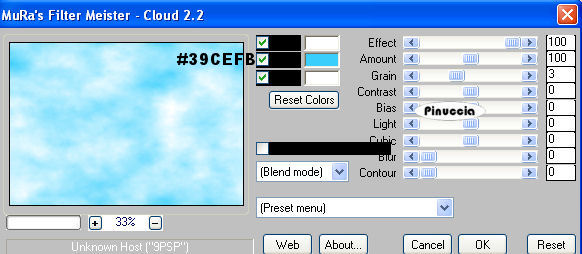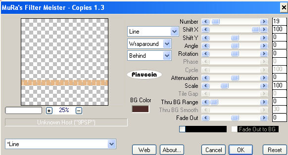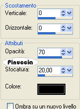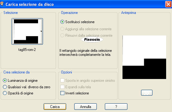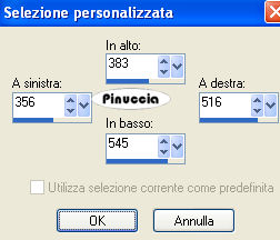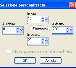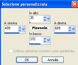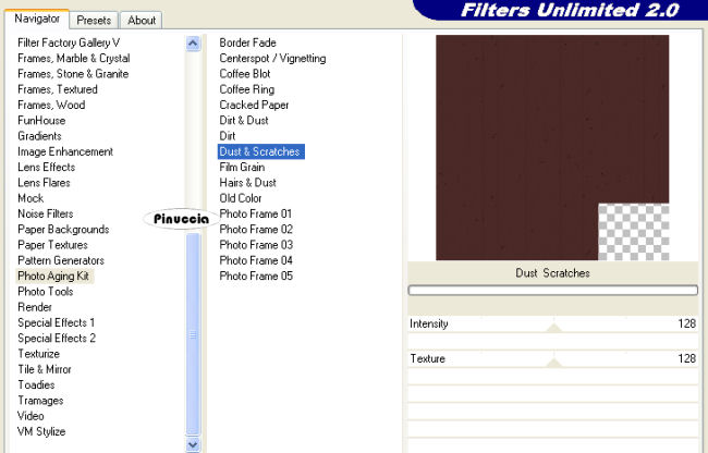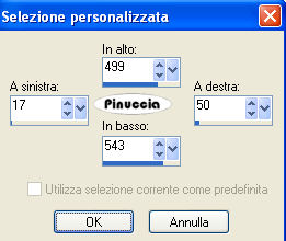 qui puoi trovare qualche risposta ai tuoi dubbi. Se l'argomento che ti interessa non è presente, ti prego di segnalarmelo. Questo tutorial è stato scritto con PSP Corel X2, ma può essere eseguito anche con le precedenti versioni. Per tradurlo, ho usato PSP X. Occorrente: Un tube a scelta. Il resto del materiale qui I tubes che ho usato sono di Suzi Sgai e Terry. Filtri: Filters Unlimited 2.0 qui Photo Aging Kit qui Mura's Meister - Copies qui Mura's Meister Clouds qui Photo Aging Kit si usa importato in Filters Unlimited. Come fare vedi qui Metti le Selezioni nella cartella Selezioni. 1. Apri una nuova immagine trasparente 700 x 700 pixels. Scegli due colori dal tuo tube. Imposta il colore chiaro come colore di primo piano (il mio #D8B0A8), e il colore scuro come colore di sfondo (il mio #4D2B28). 2. Livelli>Nuovo livello raster. Selezione>Carica/Salva selezione>Carica selezione da disco. Cerca e carica la selezione "tag85-rom-1": ![]() Riempi la selezione con il colore scuro di sfondo.3. Effetti>Plugins>Filters Unlimited 2.0 - Photo Aging Kit - Dust & Scratches, 2 volte: ![]() Selezione>Deseleziona. 4. Effetti>Effetti 3D>Sfalsa ombra: ![]() 5. Livelli>Nuovo livello raster. Attiva lo strumento Selezione ![]() clicca sull'icona Selezione personalizzata ![]() e imposta i seguenti settaggi: ![]() Riempi la selezione con il colore chiaro di primo piano.Effetti>Plugins>Filters Unlimited 2.0 - Photo Aging Kit - Dust & Scratches, come al punto 3, 2 volte. Selezione>Deseleziona. Effetti>Effetti 3D>Sfalsa ombra, come al punto 4. 6. Livelli>Nuovo livello raster. Selezione personalizzata :![]() Riempi la selezione con il colore #2E101D.Effetti>Plugins>Filters Unlimited 2.0 - Photo Aging Kit - Dust & Scratches, come al punto 3, 2 volte. Selezione>Deseleziona. Effetti>Effetti 3D>Sfalsa ombra, come al punto 4. Livelli>Duplica. Sposta il duplicato in basso a destra.![]() 7. Livelli>Nuovo livello raster. Selezione personalizzata :![]() Riempi la selezione con il colore scuro di sfondo.Effetti>Effetti 3D>Sfalsa ombra, come al punto 4. Livelli>Duplica. Immagine>Capovolgi. 8. Livelli>Nuovo livello raster. Selezione personalizzata ![]() ![]() Riempi la selezione con il colore #f7c590.Effetti>Plugins>Filters Unlimited 2.0 - Photo Aging Kit - Dust & Scratches, come al punto 3, 2 volte. Selezione>Deseleziona. 9. Effetti>Plugins>Mura's Meister - Copies, con i seguenti settaggi: ![]() Attiva lo strumento Selezione , rettangolo,e seleziona i piccoli quadretti sopra i quadri scuri. ![]() Premi sulla tastiera il tasto CANC ![]() Effetti>Effetti 3D>Sfalsa ombra, come al punto 4. 10. Livelli>Nuovo livello raster. Selezione>Carica/Salva selezione>Carica selezione da disco. Cerca e carica la selezione "tag85-rom-2": ![]() 11. Effetti>Plugins>Mura's Meister - Clouds, con i seguenti settaggi: ![]() Selezione>Deseleziona. Nella paletta dei livelli porta questo livello sopra il livello di sfondo. ![]() 12. Attiva il livello superiore. Apri il tube con i cavalli "wildhorses", e vai a Modifica>Copia. Torna al tuo lavoro e vai a Modifica>Incolla come nuovo livello. Immagine>Rifletti. Immagine>Ridimensiona, al 120%, tutti i livelli non selezionato. 13. Attiva lo strumento Gomma con i seguenti settaggi:![]() Cancella la parte del tube sopra il quadro a destra. ![]() 14. Attiva il tube del paesaggio "GraffixLover-Misted..", e vai a Modifica>Copia. Torna al tuo lavoro e vai a Modifica>Incolla come nuovo livello. Immagine>Ridimensiona, al 120%, tutti i livelli non selezionato. Spostalo in basso a destra.Livelli>Duplica. Immagine>Rifletti. Livelli>Unisci>Unisci giù. Nella paletta dei livelli trascina questo livello sopra il livello delle nuvole. ![]() 15. Attiva il livello superiore. Apri il tube CigarGunslinger, e vai a Modifica>Copia. Torna al tuo lavoro e vai a Modifica>Incolla come nuovo livello. Immagine>Ridimensiona, all'80%, tutti i livelli non selezionato. Spostalo a sinistra come nel mio esempio.Effetti>Effetti 3D>Sfalsa ombra, con i seguenti settaggi. ![]() 16. Apri il tube della donna e vai a Modifica>Copia. Torna al tuo lavoro e vai a Modifica>Incolla come nuovo livello. Immagine>Ridimensiona, se e quanto necessario, tutti i livelli non selezionato. Spostalo a destra, come nel mio esempio.Effetti>Effetti 3D>Sfalsa ombra: ![]() 17. Attiva lo strumento Testo scegli un font e scrivi il tuo nome o un testo.Se vuoi, aggiungi il tuo watermark. 18. Immagine>Aggiungi bordatura, 2 pixels, simmetriche, con il colore #4D2B28. Immagine>Aggiungi bordatura, 2 pixels, simmetriche, con il colore #D8B0A8. Immagine>Aggiungi bordatura, 2 pixels, simmetriche, con il colore #4D2B28. 19. Immagine>Aggiungi bordatura, 35 pixels, simmetriche, con il colore #D8B0A8. Seleziona questo bordo con la bacchetta magica ![]() ![]() Effetti>Plugins>Filters Unlimited 2.0 - Photo Aging Kit - Dust & Scratches, come al punto 3, 2 volte. Effetti>Plugins>Graphics Plus - Cross Shadow, con i settaggi standard. ![]() Selezione>Deseleziona. 19. Immagine>Aggiungi bordatura, 2 pixels, simmetriche, con il colore #4D2B28. Immagine>Aggiungi bordatura, 2 pixels, simmetriche, con il colore #D8B0A8. Immagine>Aggiungi bordatura, 2 pixels, simmetriche, con il colore #4D2B28. Hai finito. Puoi salvare in formato jpg. ![]() Se hai problemi o dubbi, o trovi un link non funzionante, o anche soltanto per un saluto, scrivimi. 9 Novembre 2008 |