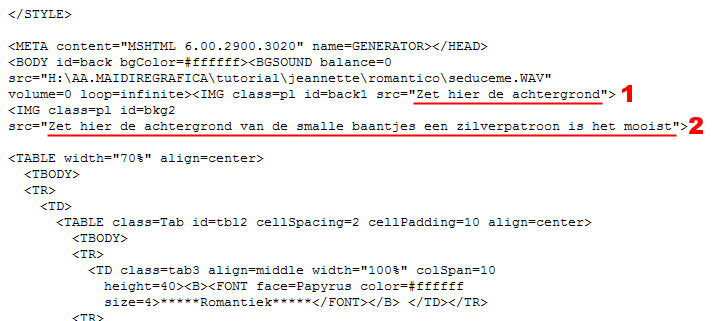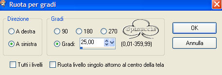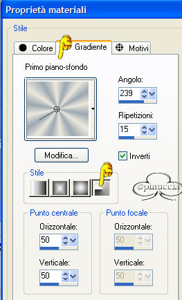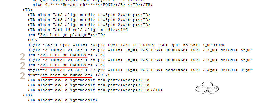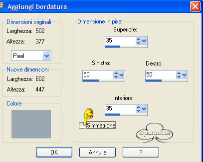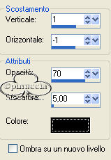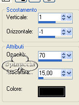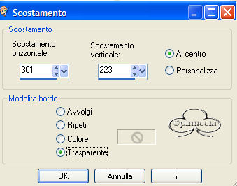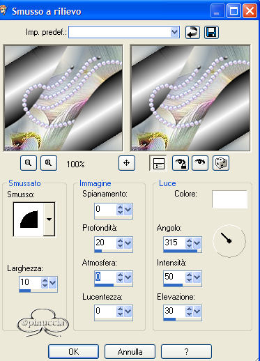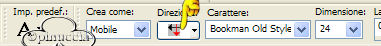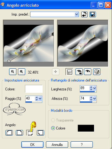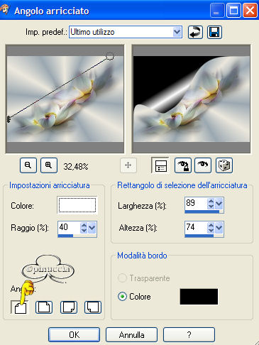 qui puoi trovare qualche risposta ai tuoi dubbi. Se l'argomento che ti interessa non è presente, ti prego di segnalarmelo. Materiale qui Il bel tube del fiore è di Nightangel, il resto è di Jeannette. Non aprire la gif "bubbles" in PSP: è una animazione che ti servirà, se vorrai usarlo, per lo script. Imposta il colore di primo piano con #ECE8DD, e il colore di sfondo con #9BA8B1. Crea un gradiente di primo piano/sfondo con i seguenti settaggi: ![]() 1. Apri il tube del fiore, duplicalo (shift+D) e chiudi l'originale. Continuerai a lavorare sulla copia. 2. Cancella i livelli del watermark e dello sfondo. un sistema più veloce per duplicare un tube senza i livelli del watermark e dello sfondo e quello di trascinare con il mouse il livello del tube sullo spazio vuoto. Avrai così il tube immediatamente "pulito". ![]() 3. Livelli>Nuovo livello raster. Riempi il nuovo livello con il gradiente.4. Nella paletta dei livelli sposta questo livello sotto quello del tube. 5. Posizionati sul livello del tube. Effetti>Effetti 3D>Sfalsa ombra: ![]() 6. Livelli>Unisci>Unisci tutto. 7. Effetti>Effetti di immagine, angolo arricciato: ![]() 8. Ripeti l'Effetto selezionando l'angolo opposto: ![]() 9. Clicca con la bacchetta magica sulle parti nere,e premi sulla tastiera il tasto CANC. Selezione>Nessuna selezione. 10. Clicca con la bacchetta magica sulle parti che adesso sono diventate grigie.11. Selezione>Inverti. Selezione>Modifica>Contrai di 1 pixel. Modifica>Copia. 12. Apri una nuova immagine trasparente 600 x 450 pixels, e riempila con il gradiente.13. Modifica>Incolla>Incolla come nuovo livello (hai incollato l'immagine precedente che avevi in memoria). 14. Effetti>Effetti 3D>Sfalsa ombra: ![]() 15. Apri nuovamente il tube del fiore. Posizionati sul livello del tube e vai a Modifica>Copia. Torna al tuo lavoro e vai a Modifica>Incolla>Incolla come nuovo livello. Spostalo in basso a destra.16. Livelli>Duplica. Immagine>Rifletti. 17. Nella paletta dei livelli sposta questo livello sotto il livello del fiore dentro la pagina con l'angolo arricciato: ![]() 18. Sposta il fiore nell'angolo a sinistra.19. Chiudi il livello del fiore dentro la pagina con l'angolo arricciato. 20. Apri il tube della coppia e vai a Modifica>copia. Torna al tuo lavoro e vai a Modifica>Incolla>Incolla come nuovo livello. Spostalo nell'angolo in alto a sinistra.Nella paletta dei livelli abbassa l'opacità di questo livello al 50%. 21. Riapri il livello con il fiore nella pagina con l'angolo arricciato. 22. Apri il tube con il bicchiere (martini.sdh). Immagine>Rifletti. Modifica>Copia. Torna al tuo lavoro e vai a Modifica>Incolla>Incolla come nuovo livello. 23. Cancella la parte di cannuccia che esce dal bordo del bicchiere.![]() 24. Attiva nuovamente il tube del bicchiere. Modifica>Annulla azione Rifletti. Modifica>Copia. Torna al tuo lavoro e vai a Modifica>Incolla>Incolla come nuovo livello. Spostalo a fianco del primo bicchiere.![]() 25. Apri il tube del gioiello (misc47) e vai a Modifica>Copia. Torna al tuo lavoro e vai a Modifica>Incolla>Incolla come nuovo livello. Spostalo in basso a sinistra.Effetti>Effetti 3D>Sfalsa ombra: ![]() 26. Controlla che tutto sia al posto giusto. Se necessario, sei ancora in tempo a spostare i tubes per sistemarli meglio. Quando sei soddisfatto: Livelli>Unisci>Unisci visibile. 27. Apri il tube delle perle e vai a Modifica>copia. Torna al tuo lavoro e vai a Modifica>Incolla>Incolla come nuovo livello. 28. Immagine>Ruota>Ruota per gradi, 25 gradi a sinistra, tutti i livelli non selezionato: ![]() 29. Attiva lo strumento Gomma cancella le parli della collana,che devono sembrare nascoste nell'angolo arricciato. ![]() ![]() 30. Livelli>Unisci>Unisci tutto. 31. Immagine>Ridimensiona, 500 x 375 pixels. 32. Regola>Messa a fuoco>Metti a fuoco. 33. Imagine>Aggiungi bordatura, 1 pixel, simmetriche, con il colore di primo piano. 34. Immagine>Aggiungi bordatura, simmetriche, non selezionato: ![]() Seleziona il bordo con la bacchetta magica ![]() 35. Effetti>Effetti di immagine>Scostamento: ![]() 36. Effetti>Effetti 3D>Smusso a rilievo: Attenzione!!!! Non distrarti, è smusso a rilievo, non smusso a incasso ![]() 37. Selezione>Nessuna selezione. 38. Clicca con la bacchetta magica sulle parti nere del bordo,e riempi con il gradiente.49. Selezione>Nessuna selezione. 40. Immagine>Aggiungi bordatura, 1 pixel, simmetriche, con il colore di primo piano. 41. Imposta il gradiente come colore di sfondo e chiudi il colore di primo piano. 42. Attiva lo strumento Testo , seleziona il font (standard di Window):Bookman Old Style, con i seguenti settaggi, direzione verticale,: ![]() e scrivi il tuo testo. 43. Effetti>Effetti 3D>sfalsa ombra: ![]() Ripeti l'Effetto Sfalsa ombra. Selezione>Nessuna selezione. La tag è finita. ![]() Se vuoi utilizzare lo script, ti servono anche due immagini di sfondo, e la gif "Bubble" (nello zip) che dovrai inserire nello script tre volte. ![]() Apri lo script di Jeannette che trovi qui (ho tolto il link, perchè il sito è chiuso, ma mantengo le istruzioni che possono servire per casi simili) e segui i preliminari descritti alla fine di questo tutorial, fino all'inserimento dello sfondo-suono. Clicca su Origine e identifica i punti di inserimenti dei vari elementi dello script. Dopo aver inserito lo sfondo-suono, dovrai indicare allo script dove trovare le immagini. Nella schermata sotto, sono indicati i punti di inserimento dei files dello script. Devi cancellare la scritta tra le virgolette e inserire il tuo percorso: 1=qui inserisci lo sfondo.