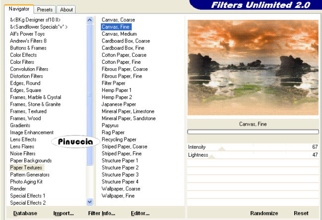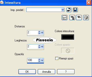qui puoi trovare qualche risposta ai tuoi dubbi. Se l'argomento che ti interessa non è presente, ti prego di segnalarmelo. Questo tutorial è stato scritto con Corel X2. Per tradurlo, ho usato PSP X. Occorrente: Materiale qui Filtri: Filters Unlimited qui Penta.com - Jeans qui Eye Candy 4000 - Glass qui Apri una nuova immagine trasparente 750 x 550 pixels. Selezione>Seleziona tutto. Apri il tube paisaje, e vai a Modifica>Copia. Torna al tuo lavoro e vai a Modifica>Incolla nella selezione. Selezione>Deseleziona. Sposta l'immagine a sinistra.Livelli>Duplica. Sposta il duplicato a destra, pressappoco come nell'esempio.![]() Livelli>Unisci>Unisci visibile. Livelli>Nuovo livello raster. Riempi il livello con il colore #fcd3a6.Livelli>Disponi>Porta sotto. Livelli>Unisci>Unisci visibile. Effetti>Plugins>Filters Unlimited - Paper Textures - Canvas Fine: ![]() Livelli>Nuovo livello raster. Selezione>Seleziona tutto. Selezione>modifica>Contrai - 20 pixels. Riempi con un gradiente dorato.Selezione>Modifica>Contrai - 3 pixels. Premi sulla tastiera il tasto CANC ![]() Selezione>Deseleziona. Effetti>Plugins>Penta.com - Jeans, con i settaggi standard. ![]() Livelli>Unisci>Unisci visibile. Selezione>Seleziona tutto. Selezione>Modifica>Contrai - 20 pixels. Selezione>inverti. Effetti>Effetti di trama>Intessitura: ![]() Regola>Messa a fuoco>Accentua messa a fuoco. Selezione>Deseleziona. Immagine>Aggiungi bordatura, 3 pixels, simmetriche, con un colore qualsiasi, purchè in contrasto con quelli presente nell'immagine. Seleziona questo bordo con la bacchetta magica ![]() ![]() e riempilo con il gradiente dorato.Effetti>Plugins>Penta.com - Jeans, con i settaggi precedenti. Selezione>Deseleziona. Apri il tube della donna e vai a Modifica>Copia. Torna al tuo lavoro e vai a Modifica>Incolla come nuovo livello. Posiziona il tube come preferisci, o come nel mio esempio.Attiva lo strumento Testo e, con un font a scelta, scrivi il tuo testo.Effetti>Plugins>Eye Candy 4 - Glass, con il settaggio che preferisci. Effetti>Effetti 3D>sfalsa ombra, con i seguenti settaggi: ![]() Aggiungi il tuo nome e/o il tuo watermark e salva in formato jpg. ![]() Se hai problemi o dubbi, o trovi un link non funzionante, o anche soltanto per un saluto, scrivimi. 24 Giugno 2008 |