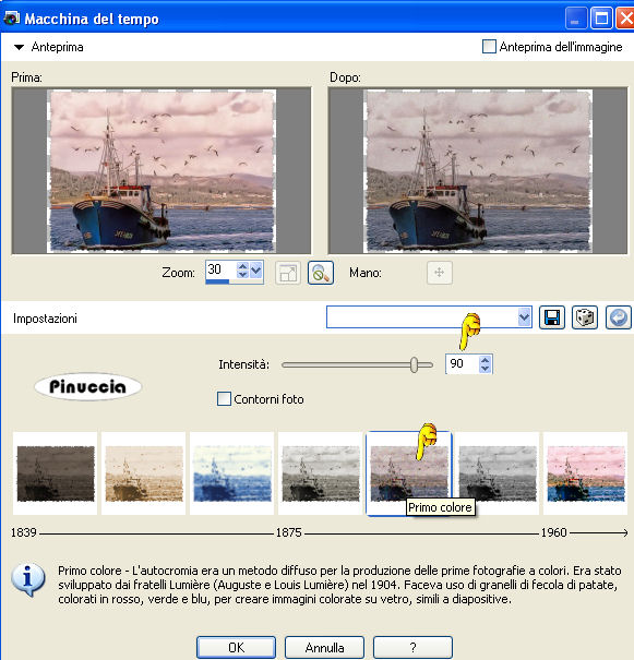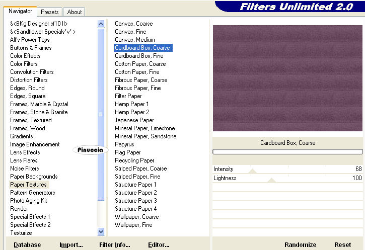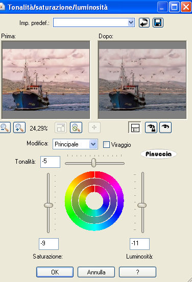 qui puoi trovare qualche risposta ai tuoi dubbi. Se l'argomento che ti interessa non è presente, ti prego di segnalarmelo. Questo tutorial è stato scritto con Corel X2. Per tradurlo, l'ho eseguito con PSP X. Occorrente: Materiale qui Filtri: Filters Unlimited 2.0 qui Apri una nuova immagine trasparente 700 x 500 pixels. Selezione>Seleziona tutto. Apri l'immagine del paesaggio e vai a Modifica>Copia. Torna al tuo lavoro e vai a Modifica>Incolla nella selezione. Selezione>Deseleziona. Effetti>Plugins>Filters Unlimited - Edges Square - Square edge 17. Effetti>Effetti di foto>Macchina del tempo: Clicca su Primo colore e poi imposta l'intensità a 90: ![]() Questo effetto si trova soltanto in Corel X2. Se stai usando, come nel mio esempio, PSP X, come alternativa puoi seguire il mio esempio. Regola>Tonalità e Saturazione>Tonalità/Saturazione/Luminosità: ![]() In fondo al tutorial l'esempio con l'applicazione di questo effetto. Regola>Rimozione disturbo in un passaggio. Livelli>Nuovo livello raster. Imposta il colore di primo piano con #725267, e riempi il livello con il colore di primo piano.Effetti>Plugins>Filters Unlimited 2.0 - Paper Textures - Cardboard Box, Coarse: ![]() Livelli>Disponi>Porta sotto. Attiva il livello del paesaggio. Effetti>Effetti 3D>Sfalsa ombra: ![]() Ripeti l'Effetto Sfalsa ombra, ma cambiando verticale e orizzontale con -3. Apri il tube del pescatore e vai a Modifica>Copia. Torna al tuo lavoro e vai a Modifica>Incolla come nuovo livello. Attiva lo strumento Selezione a mano libera sfumatura 10, tolleranza 20,e seleziona una piccola parte del bordo del tube, come nell'esempio. ![]() Modifica>Taglia. Selezione>Deseleziona. Effetti>Effetti 3D>Sfalsa ombra, con i settaggi precedenti. Attiva lo strumento Testo , crea come vettore,imposta il colore di sfondo con il nero, scrivi il tuo testo. Livelli>Converti in livello raster. Effetti>Effetti 3D>Sfalsa ombra, con i settaggi precedenti. nel mio esempio ho applicato l'Effetto con 3, senza la ripetizione con il segno meno. Abbassa l'opacità di questo livello al 50%. Immagine>Aggiungi bordatura, 2 pixels, simmetriche, con il colore #0d0a14. Aggiungi il tuo nome e/o il tuo watermark e salva in formato jpg. ![]() ![]() Se hai problemi o dubbi, o trovi un link non funzionante, o anche soltanto per un saluto, scrivimi. 2 Giugno 2008 |