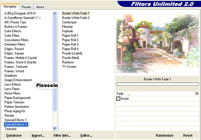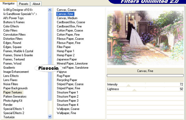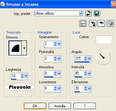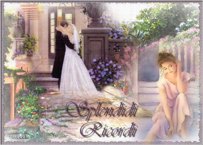 qui puoi trovare qualche risposta ai tuoi dubbi. Se l'argomento che ti interessa non è presente, ti prego di segnalarmelo. Questo tutorial è stato scritto con Corel X2. Per tradurlo, l'ho eseguito con PSP X. Occorrente: Materiale qui Filtri: Filters Unlimited 2.0 qui Penta.com - dot and cross qui Apri una nuova immagine trasparente 700 x 500 pixels. Selezione>Seleziona tutto. Apri l'immagine del paesaggio e vai a Modifica>Copia. Torna al tuo lavoro e vai a Modifica>Incolla nella selezione. Selezione>Deseleziona. Effetti>Plugins>Special Effects 2 - Border White Fade 1: ![]() Apri il tube Misted_Girl_On_Steps_RM, e vai a Modifica>Copia. Torna al tuo lavoro e vai a Modifica>Incolla come nuovo livello. Livelli>Duplica, 2 volte, in modo da avere tre livelli del tube. Chiudi il livello di sfondo e vai a Livelli>Unisci>Unisci visibile. Regola>Rimozione disturbo in un passaggio. Apri il tube KaraT4002, e vai a Modifica>Copia. Torna al tuo lavoro e vai a Modifica>Incolla come nuovo livello. Attiva lo strumento Selezione a mano libera , sfumatura 10, spianamento 20,e seleziona la parte sotto il tube in modo che non si noti la differenza dell'immagine. ![]() Modifica>Taglia. Selezione>Deseleziona. Regola>Rimozione disturbo in un passaggio. Chiudi il livello con la ragazza e posizionati sul livello di sfondo. Livelli>Unisci>Unisci visibile. Effetti>Plugins>Filters Unlimited - Paper Textures - Canvas fine: ![]() Effetti>Plugins>Filters Unlimited 2.0 - Edges,square - Square Edge 17. Livelli>Nuovo livello raster. Imposta il colore di primo piano con #ac949e. Riempi il livello con il colore di primo piano.Livelli>Disponi>Porta sotto. Effetti>Plugins>Penta.com - dot and cross, con i settaggi standard. ![]() Regola>Messa a fuoco>Metti a fuoco. Immagine>Aggiungi bordatura, 2 pixels, simmetriche, con il colore bianco. Seleziona il bordo con la bacchetta magica ![]() Effetti>Effetti 3D>Smusso a incasso: ![]() Imposta il colore di sfondo con #725267. Attiva lo strumento Testo , crea come vettore,e scrivi il tuo testo. Livelli>Converti in livello raster. Effetti>Effetti 3D>Smusso a incasso, con i settaggi precedenti. Effetti>Effetti 3D>Sfalsa ombra: ![]() Aggiungi il tuo nome e/o il tuo watermark e salva in formato jpg. ![]() Se hai problemi o dubbi, o trovi un link non funzionante, o anche soltanto per un saluto, scrivimi. 2 Giugno 2008 |