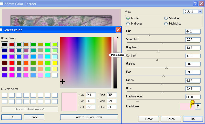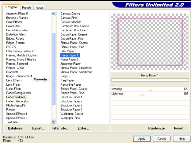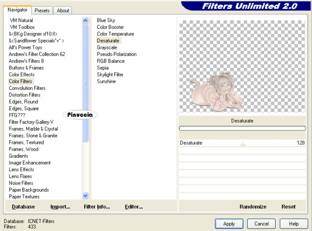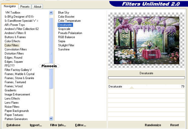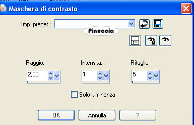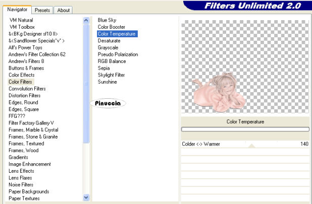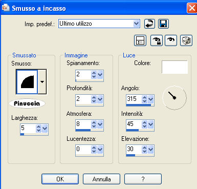 qui puoi trovare qualche risposta ai tuoi dubbi. Se l'argomento che ti interessa non è presente, ti prego di segnalarmelo. Questo tutorial è stato scritto con Corel X2. Per tradurlo, ho usato PSP X. Occorrente: Materiale qui Filtri: Filters Unlimited qui Digital Film Tools 55mm qui Apri una nuova immagine trasparente 750 x 550 pixels. Selezione>Seleziona tutto. Apri l'immagine Restored Suzan M, e vai a Modifica>Copia. Torna al tuo lavoro e vai a Modifica>Incolla nella selezione. Selezione>Deseleziona. Regola>Messa a fuoco>Maschera di contrasto: ![]() Regola>Rimozione disturbo in un passaggio. Immagine>Ridimensiona, all'85%, tutti i livelli non selezionato. ![]() Selezione>Seleziona tutto. Selezione>Mobile. Livelli>Nuovo livello raster. Imposta il colore di primo piano con #d7c7a5, e riempi il livello con questo colore.Selezione>Modifica>Contrai - 15 pixels. Attiva il livello superiore. Modifica>Taglia o premi sulla tastiera il tasto CANC ![]() Selezione>Deseleziona. Effetti>Plugins>Filters Unlimited - Paper Textures - Hemp Paper 1: ![]() Su entrambi i livelli: Effetti>Effetti 3D>Sfalsa ombra: ![]() Ripeti l'Effetto Sfalsa ombra, cambiando verticale e orizzontale a -3. Attiva il livello superiore. Effetti>Effetti 3D>Smusso a incasso: ![]() Attiva il livello inferiore dello sfondo. Effetti>Plugins>Filters Unlimited - Color Filters - Desaturate 79. ![]() Attiva il livello superiore. Apri il tube BarbaraJensen_Float. Attiva lo strumento selezione a mano libera e seleziona la bambina.![]() Modifica>Copia. Torna al tuo lavoro e vai a Modifica>Incolla come nuovo livello. Attiva lo strumento Puntatore e deforma leggermente il tube posizionandolo in basso a sinistra:![]() Attiva lo strumento Selezione a mano libera e seleziona la parte del vestito al di fuori della cornice.![]() Premi sulla tastiera il tasto CANC. Selezione>Deseleziona. Effetti>Effetti 3D>Sfalsa ombra: ![]() Effetti>Plugins>Filters Unlimited - Color Filters, con i settaggi standard. ![]() Effetti>Plugins>Filters Unlimited - color Filters - Color Temperature. ![]() Attiva il livello inferiore dello sfondo. Apri il tube della ragazza e vai a Modifica>Copia. Torna al tuo lavoro e vai a Modifica>Incolla come nuovo livello. Posiziona la ragazza in basso a destra.Attiva lo strumento Selezione a mano libera , da punto a punto,e seleziona la parte del tube esterna alla cornice. ![]() Premi sulla tastiera il tasto CANC. Selezione>Deseleziona. ![]() Attiva il livello inferiore dello sfondo. Effetti>Plugins>DFT 55mm v6 Color Correct>Color Correct: ![]() Livelli>Unisci>Unisci visibile. Salva in formato png o gif. Esempio salvato in formato gif. ![]() ![]() Se hai problemi o dubbi, o trovi un link non funzionante, o anche soltanto per un saluto, scrivimi. 19 Settembre 2008 |