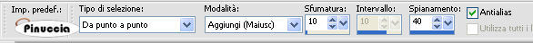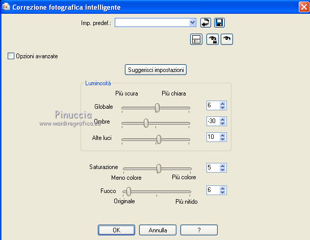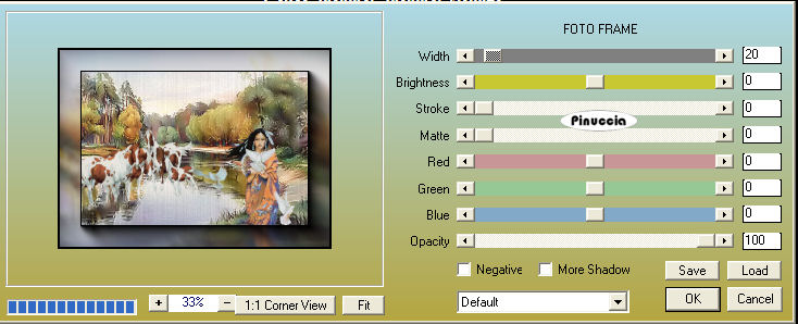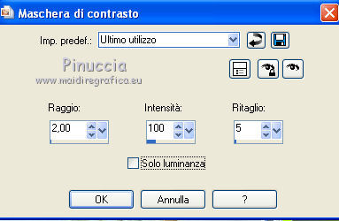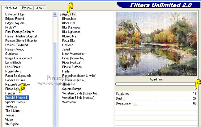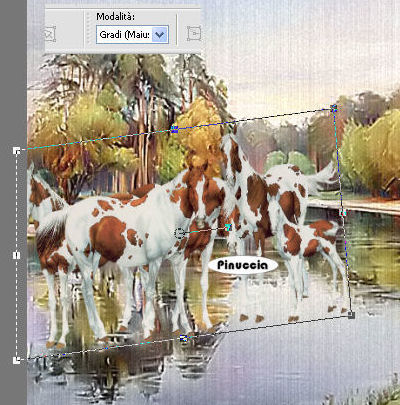 qui puoi trovare qualche risposta ai tuoi dubbi. Se l'argomento che ti interessa non è presente, ti prego di segnalarmelo. Questo tutorial è stato scritto con Corel X2. Per tradurlo, ho usato PSP X. Occorrente: Materiale qui Filtri: Filters Unlimited 2.0 qui AAA Multifilter qui Apri una nuova immagine trasparente 750 x 550 pixels. Selezione>Seleziona tutto. Apri l'immagine "paisaje" e vai a Modifica>Copia. Torna al tuo lavoro e vai a Modifica>Incolla nella selezione. Selezione>Deseleziona. Regola>Messa a fuoco>Maschera di contrasto: ![]() Regola>Eliminazione disturbo in un passaggio. Effetti>Plugins>Filters Unlimited - Special Effects 1 - Aged Film. ![]() Apri il tube BD_Pintos~demi, e vai a Modifica>Copia. Torna al tuo lavoro e vai a Modifica>Incolla come nuovo livello. Attiva lo strumento Puntatore ![]() prima ridimensiona l'immagine usando i nodi centrali della griglia. ![]() Quindi, impostando il puntatore a Gradi, tira gli angoli a destra per dare all'immagine un senso di prospettiva. ![]() Pressappoco come nell'esempio sotto. ![]() Quando hai finito, clicca sulla manina per liberarti della griglia.Attiva lo strumento Selezione a mano libera , sfumatura 10, spianamento 40,![]() e seleziona la parte dei piedi dei cavalli. ![]() Modifica>Taglia (oppure premi sulla tastiera il tasto CANC). Selezione>Deseleziona. Sistema il tube in basso a sinistra.![]() Regola>Messa a fuoco>Maschera di contrasto: ![]() Regola>Rimozione disturbo in un passaggio. Apri il tube !!~~!!NALADY, e vai a Modifica>Copia. Torna al tuo lavoro e vai a Modifica>Incolla come nuovolivello. Regola>Correzione fotografica intelligente: ![]() Livelli>Unisci>Unisci visibile. Effetti>Plugins>AAA Frame - Foto Frame: ![]() Selezione>Seleziona tutto. Selezione>Modifica>Contrai - 20 pixels. Selezione>inverti. Regola>Sfocatura>Sfocatura gaussiana - raggio 10. ![]() Selezione>Inverti. Effetti>Effetti 3D>sfalsa ombra: ![]() Ripeti l'Effetto Sfalsa ombra, cambiando verticale e orizzontale con -3. ![]() Selezione>Seleziona tutto. Selezione>Modifica>Contrai - 2 pixels. Selezione>Inverti. Livelli>Nuovo livello raster. Riempi la selezione con il nero.Selezione>Deseleziona. Aggiungi il tuo nome e/o il tuo watermark. Livelli>Unisci>Unisci tutto e salva in formato jpg. ![]() Se hai problemi o dubbi, o trovi un link non funzionante, o anche soltanto per un saluto, scrivimi. 30 Agosto 2008 |