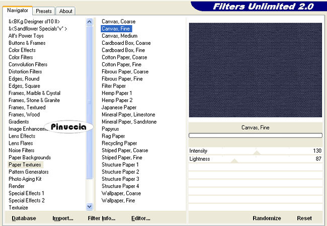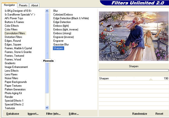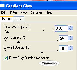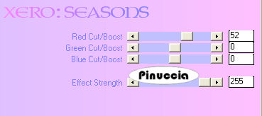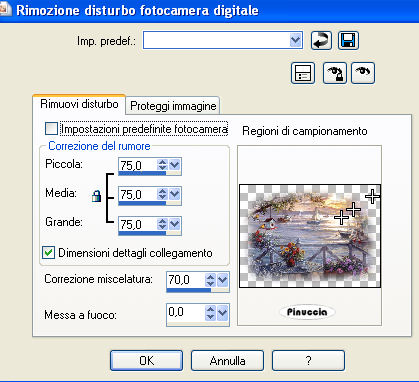 qui puoi trovare qualche risposta ai tuoi dubbi. Se l'argomento che ti interessa non è presente, ti prego di segnalarmelo. Questo tutorial è stato scritto con Corel X2. Per tradurlo, ho usato PSP X. Occorrente: Materiale qui Filtri: Digital 55mm Tools qui Filters Unlimited 2.0 qui Eye Candy 4000 qui Xero qui in alternativa al filtro 55mm ho usato, oltre a un effetto del filtro xero: Adjust Variation qui Apri una nuova immagine trasparente 700 x 500 pixels. Selezione>Seleziona tutto. Apri il tube Sea Treasures_Misted by Kathy_Kms, e vai a Modifica>Copia. Torna al tuo lavoro e vai a Modifica>Incolla nella selezione. Selezione>Deseleziona. Attiva lo strumento Puntatore ![]() Deformazione se stai usando PSP 9.e ingrandisci l'immagine. ![]() Regola>Rimozione disturbo fotocamera digitale. ![]() Livelli>Nuovo livello raster. Imposta il colore di primo piano con #aaa0b1. Riempi il livello con il colore di primo piano.Livelli>Disponi>Porta sotto. Apri il tube della bambina e vai a Modifica>Copia. Torna al tuo lavoro e vai a Modifica>Incolla come nuovo livello. Immagine>Ridimensiona, al 70%, tutti i livelli non selezionato: ![]() Attiva lo strumento Pennello Clonazione ![]() e cancella il cestino appeso al braccio della bambina. per fare questo devi scegliere un colore sul vestito della bambina e cliccare con il tasto destro del mouse su un punto di questo colore, quindi clicca con il tasto sinistro del mouse sul cestino: questo prenderà il colore che hai scelto. Ricorda che se sbagli o non sei soddisfatto del risultato puoi sempre annullare con Modifica>Annulla... e ripetere. Pressappoco questo dovrebbe essere il risultato: ![]() Quando hai finito, se necessario, puoi ritoccare un po' la clonazione con lo strumento Sfumino ![]() Apri il tube farandaway~mistye, e vai a Modifica>Copia. Torna al tuo lavoro e vai a Modifica>Incolla come nuovo livello. Immagine>Rifletti. Regola>Rimozione disturbo in un passaggio. Sposta il tube vicino alla bambina.![]() Livelli>Unisci>Unisci visibile. Effetti>Plugins>Filters Unlimited - Convolution Filters - Sharpen 190. ![]() Effetti>Plugins>Digital Film Tools 6, 55mm, Gamcolor Cinefilters: questo è il settaggio usato dall'autrice del tutorial: ![]() Nel mio esempio non ho usato questo filtro perchè non ce l'ho e non intendo comprarlo. In alternativa, ho continuato così: Effetti>Plugins>Adjust>Variation, 1 clic su Cyan, 2 clic su Red, 1 clic su Lighter. Effetti>Plugins>Xero - Seasons: ![]() Effetti>Plugins>Filters Unlimited - Color Filters - Desaturate - 30. ![]() Regola>Messa a fuoco>Metti a fuoco. Livelli>Nuovo livello maschera>Da immagine. ![]() Apri il menu sotto la finestra di origine e seleziona la maschera "mascara". ![]() Livelli>Unisci>Unisci gruppo. Livelli>Nuovo livello raster. Imposta il colore di primo piano con #35384f, e riempi il livello con questo colore.Effetti>Plugins>Filters Unlimited - Paper Textures, Canvas Fine: ![]() Livelli>Disponi>Porta sotto. Attiva il livello superiore. Effetti>Plugins>Eye Candy 4 - Gradient Glow: ![]() Immagine>Aggiungi bordatura, 2 pixels, simmetriche, con il colore #252735. Effetti>Plugins>Xero - Porcelain, con i settaggi standard. ![]() Firma il tuo lavoro e salva in formato jpg. ![]() Se hai problemi o dubbi, o trovi un link non funzionante, o anche soltanto per un saluto, scrivimi. 8 Giugno 2008 |