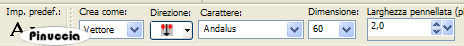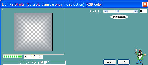 qui puoi trovare qualche risposta ai tuoi dubbi. Se l'argomento che ti interessa non è presente, ti prego di segnalarmelo. Occorrente: Materiale qui Per questo tutorial sono stati usati tubes di Isharimal, Patry, Sandi e Gini. Filtri: Xero qui Filters Unlimited 2.0 qui FM Tile Tools qui L & K's Dimitri qui Apri tutto il materiale in PSP. 1. Apri una nuova immagine trasparente 600 x 450 pixels. 2. Selezione>Seleziona tutto. Apri il file di sfondo "Achtergrond" e vai a Modifica>copia. Torna al tuo lavoro e vai a Modifica>Incolla>Incolla nella selezione. 3. Abbassa l'opacità del livello al 22%. Selezione>Nessuna selezione. 5. Apri il tube Restfulplace-Sandi e vai a Modifica>Copia. Torna al tuo lavoro e vai a Modifica>Incolla>Incolla come nuovo livello. Spostalo in basso a sinistra.6. Apri il tube RingwoodManor e vai a Modifica>Copia. Torna al tuo lavoro e vai a Modifica>Incolla>Incolla come nuovo livello. Sposta il tube in alto a destra.Dovresti avere questo: ![]() non preoccuparti per la trasparenza. Quando unirai i livelli, appiattendoli, il colore si uniformerà. 7. Apri il tube dell'angelo "Isharimal sad fairy" e vai a Modifica>Copia. Torna al tuo lavoro e vai a Modifica>Incolla>Incolla come nuovo livello. Immagine>Ridimensiona, all'85%, tutti i livelli non selezionato. Sposta il tube in basso a destra.8. Livelli>Unisci>Unisci tutto (appiattisci). ![]() 9. Effetti>Plugins>FM Tile Tools - Blend Emboss, con i settaggi standard. ![]() 10. Effetti>Plugins>Xero - Porcelain, con i settaggi standard. ![]() 11. Regola>Correzione fotografica>Rimozione disturbo fotocamera digitale. se stai usando PSP X: Regola>Rimozione disturbo fotocamera digitale. ![]() non potrai inserire i settaggi, se prima non togli la spunta a "Dimensioni dettagli collegamento". Dopo aver inserito i valori, rimetti la spunta. 12. Immagine>Aggiungi bordatura, 2 pixels, simmetriche, con il colore nero. 13. Immagine>Aggiungi bordatura, 10 pixels, simmetriche, con il colore #9299a0. 14. Immagine>Aggiungi bordatura, 2 pixels, simmetriche, con il colore nero. 15. Apri il tube dell'uccello "PatryMists The Fly" e vai a Modifica>Copia. Torna al tuo lavoro e vai a Modifica>Incolla>Incolla come nuovo livello. Posiziona il tube in alto a sinistra e abbassa l'opacità del livello al 40%.16. Livelli>Unisci>Unisci tutto. ![]() Livelli>Innalza livello di sfondo. Abbassa l'opacità all'80%. 17. Immagine>Ridimensiona, all'85%, tutti i livelli selezionato. Livelli>Unisci>Unisci tutto. 18. Effetti>Plugins>Xero - Ultraviolet. ![]() 19. Copia l'immagine (Modifica>Copia), e minimizzala nella tua area di lavoro. 20. Apri una nuova immagine trasparente 600 x 600 pixels, e riempila con il colore #9299a0.21. Effetti>Plugins>L & K - Dimitri, con i settaggi standard: ![]() 22. Modifica>Incolla>Incolla come nuovo livello (hai in memoria l'immagine copiata al punto 19), la trasparenza sparirà quando appiattirai i livelli. Sposta l'immagine un po' più in alto, vedi il mio esempio.23. Effetti>Effetti 3D>Sfalsa ombra: ![]() Ripeti l'Effetto Sfalsa ombra, ma cambiando verticale e orizzontale a 4. 24. Livelli>Unisci>Unisci tutto. ![]() 25. Scrivi un testo nella parte inferiore. Io ho usato il font Andalus, con i seguenti settaggi colore di sfondo #9299a0, colore di primo piano nero: ![]() Livelli>Converti in livello raster. Effetti>Effetti 3D>Sfalsa ombra, con i seguenti settaggi: ![]() 26. Effetti>Plugins>Filters Unlimited - Photo Aging kit - Photo Frame 1. 27. Immagine>Ridimensiona, all'85%, tutti i livelli selezionato. Firma il tuo lavoro e salvalo in jpg. ![]() Se hai problemi o dubbi, o trovi un link non funzionante, o anche soltanto per un saluto, scrivimi. 20 Settembre 2007 |
