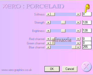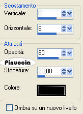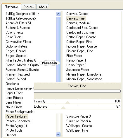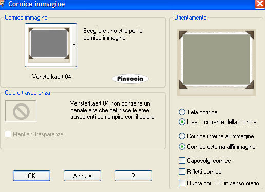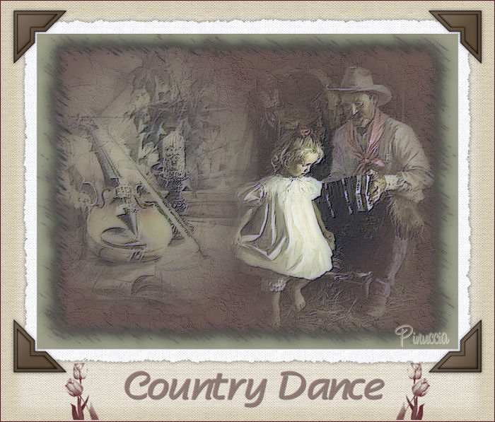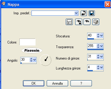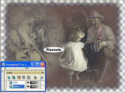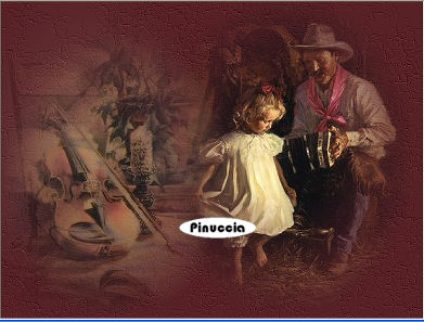 qui puoi trovare qualche risposta ai tuoi dubbi. Se l'argomento che ti interessa non è presente, ti prego di segnalarmelo. Filtri: Flaming Pear - Kyoto qui Filters Unlimited 2.0 qui Xero qui Fm Tile Tools qui Apri il materiale in PSP. Importa i pennelli in PSP: come fare vedi qui Metti la cornice-immagine "Vensteerkaart04" nella cartella Cornici-immagine di PSP. 1. Apri una nuova immagine 600 x 450 pixels, e riempila con il colore #572126.2. Effetti>Effetti di trama>Nappa: ![]() 3. Apri il tube "kind en opa" e vai a Modifica>Copia. Torna al tuo lavoro e vai a Modifica>Incolla>Incolla come nuovo ivello. Sposta il tube a destra, ma rimani distante almeno un centimetro dal bordo.![]() 4. Apri il tube con la sedia "Stoel", e vai a Modifica>Copia. Torna al tuo lavoro e vai a Modifica>Incolla>Incolla come nuovo livello. Sposta l'immagine a sinistra.Abbassa l'opacità del livello al 45%. 5. Apri il tube con il violino "Viool" e vai a Modifica>Copia. Torna al tuo lavoro e vai a Modifica>Incolla>Incolla come nuovo livello. Sposta il tube a sinistra, come nell'esempio.![]() 6. Chiudi il livello inferiore e posizionati su uno degli altri livelli. Livelli>Unisci>Unisci visibile. 7. Effetti>Plugins>FM Tile Tools - Blend Emboss, con i settaggi standard. ![]() 8. Rendi nuovamente visibile il livello inferiore. Livelli>Unisci>Unisci visibile. 9. Effetti>Plugins>Filters Unlimited - Edges square - Square edge 2. 10. Effetti>Effetti 3D>Sfalsa ombra, con i seguenti settaggi, colore nero: ![]() Ripeti l'Effetto Sfalsa ombra, ma cambiando verticale e orizzontale a 6, ![]() 11. Livelli>Nuovo livello raster. Livelli>Disponi>Sposta giù. 12. Assicurati che sia attivo il livello superiore. 13. Effetti>Plugins>Flaming Pear - Kyoto color. ![]() 14. Effetti>Plugins>Xero - Porcelain, con i settaggi standard. ![]() 15. Assicurati che sia attivo il livello sottostante (Raster 1). ![]() Riempi il livello con un colore scelto dall'immagine,io ho scelto il colore #9d9f8a. 16. Livelli>Unisci>Unisci tutto. 17. Immagine>Cornice-immagine, cerca e seleziona la cornice immagine Vensterkaart 04, con i seguenti settaggi: ![]() 18. Attiva lo strumento Bacchetta magica ![]() ![]() Clicca sullo sfondo esterno alla cornice. ![]() Effetti>Plugins>Filters Unlimited - Paper Textures - Canvas fine, con i seguenti settaggi. ![]() 20. Livelli>Unisci>Unisci tutto. 21. Immagine>Aggiungi bordatura, 1 pixel, simmetriche, con il colore #572126. 22. Livelli>Nuovo livello raster. Imposta il colore di primo piano con #572126. 23. Attiva lo strumento Pennello ![]() cerca e seleziona il pennello Sarah33, e applicalo una volta al centro dell'immagine, in basso. Abbassa l'opacità di questo livello al 70%. 24. Effetti>Effetti 3D>Sfalsa ombra, con i seguenti settaggi, colore nero. ![]() 25. Livelli>Nuovo livello raster. 26. Cerca e seleziona il pennello Mbastin-Kkat 47, imposta la dimensione a 82, e applicalo cliccando due-tre volte a destra del testo. 27. Livelli>Duplica. Immagine>Rifletti. Sistema il secondo pennello a sinistra del testo.28. Livelli>Unisci>Unisci tutto. 29. Immagine>Ridimensiona, al 75%, tutti i livelli selezionato. 30. Effetti>Plugins>Xero - Porcelain: ![]() ![]() Se hai problemi o dubbi, o trovi un link non funzionante, o anche soltanto per un saluto, scrivimi. 20 Settembre 2007 |