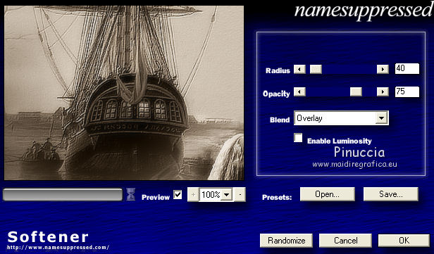 qui puoi trovare qualche risposta ai tuoi dubbi. Se l'argomento che ti interessa non è presente, ti prego di segnalarmelo. Questo tutorial è stato tradotto con PSP X, ma può essere eseguito anche con le altre versioni di PSP. Occorrente: Materiale qui Filtri: FM Tile Tools qui Texture qui Name suppressed - Softener qui 1. Apri una nuova immagine trasparente 550 x 550 pixels, e riempila con il colore #cdc0b0.2. Effetti>Plugins>Texture - Texturizer, seleziona la trama Sandstone, con i seguenti settaggi: ![]() 3. Apri il tube Monique965 e vai a Modifica>copia. Torna al tuo lavoro e vai a Modifica>Incolla come nuovo livello. Cambia la modalità di miscelatura di questo livello in Luminanza (esistente), Sposta il tube in basso a sinistra.4. Apri il tube della nave, e vai a Modifica>copia. Torna al tuo lavoro e vai a Modifica>Incolla come nuovo livello. Cambia la modalità di miscelatura di questo livello in Luminanza (esistente), Sposta il tube al centro, con gli alberi della nave contro il bordo superiore.![]() 5. Apri il tube con la cascata, e vai a Modifica>copia. Torna al tuo lavoro e vai a Modifica>Incolla come nuovo livello. Cambia la modalità di miscelatura di questo livello in Luminanza (esistente), Sposta il tube nell'angolo in basso a destra.![]() 6. Livelli>Unisci>Unisci tutto. 7. Effetti>Plugins>FM Tile Tools - Blend Emboss, con i settaggi standard. ![]() 8. Se vuoi, Immagine>Ridimensiona, all'85%, tutti i livelli selezionato. 9. Immagine>Aggiungi bordatura, 5 pixels, simmetriche, con il colore #4e4233. 10. Apri il tube con l'uccello e vai a Modifica>copia. Torna al tuo lavoro e vai a Modifica>Incolla come nuovo livello. se hai ridimensionato al punto 8, dovrai ridimensionare anche questo tube. Cambia la modalità di miscelatura di questo livello in Luminanza (esistente), Sposta il tube in alto a sinistra o a destra, come preferisci.Cambia la modalità di miscelatura di questo livello in Luminanza (esistente), e abbassa l'opacità al 70%. 11. Aggiungi il tuo nome e/o il tuo watermark. Livelli>Unisci>Unisci tutto. 12. Effetti>Plugins>Namesuppressed- Softener, con i seguenti settaggi: ![]() Regola>Rimozione disturbo in un passaggio. Hai finito. Salva in formato jpg. ![]() Se hai problemi o dubbi, o trovi un link non funzionante, o anche soltanto per un saluto, scrivimi. 11 Agosto 2008 |