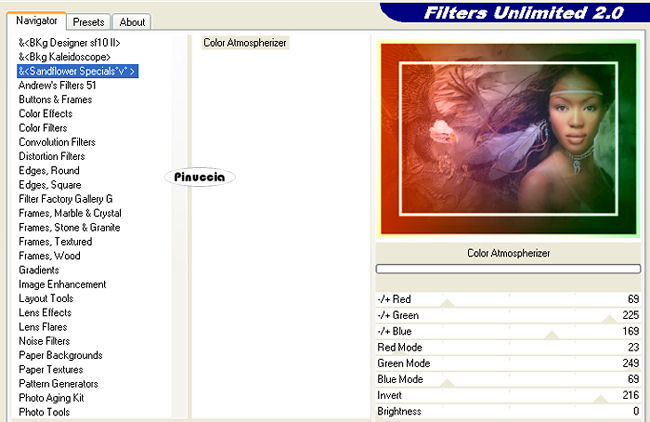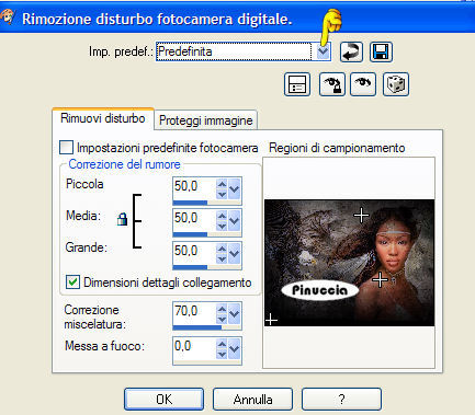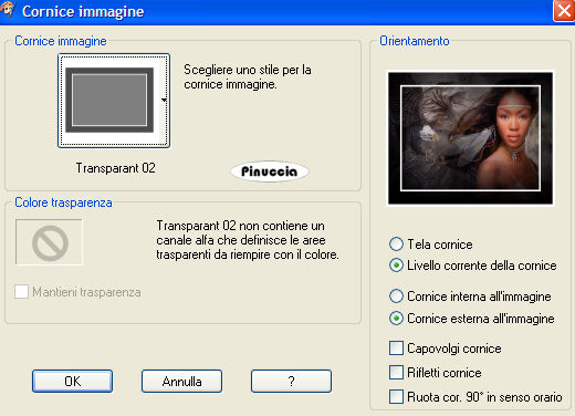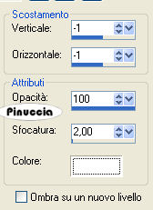 qui puoi trovare qualche risposta ai tuoi dubbi. Se l'argomento che ti interessa non è presente, ti prego di segnalarmelo. Occorrente: Materiale qui Rispetta il lavoro degli autori e mantieni i tubes al loro stato originale. Filtri: Penta.com qui Xero qui Fm Tile Tools qui Filters Unlimited 2.0 qui Sandflower qui Sandflower si usa importato in Filters Unlimited. Come fare vedi qui Apri le immaginin PSP. Importa i pennelli in PSP. Come fare vedi qui Metti la cornice-immagine Trasparent02 nella cartella Cornici-immagine. se stai usando PSP X, questa cornice è standard e la trovi sotto "Trasparente02". 1. Apri una nuova immagine NERA 600 x 450 pixels. 2. Apri il tube degli uccelli "Arend", e vai a Modifica>Copia. Torna al tuo lavoro e vai a Modifica>Incolla>Incolla come nuovo livello. Sposta il tube nell'angolo in alto a sinistra.![]() fai attenzione a non tenerlo troppo vicino al bordo, usa il righello (Visualizza>Righelli), e segui il mio esempio. 3. Effetti>Plugins>FM Tile Tools - Blend Emboss, con i settaggi standard. ![]() 4. Apri il tube della donna e vai a Modifica>Copia. Torna al tuo lavoro e vai a Modifica>Incolla>Incolla come nuovo livello. Sposta il tube in basso a destra (valgono le stesse cautele del tube precedente).![]() 5. Effetti>Plugins>FM Tile Tools - Blend Emboss, con i settaggi standard. 6. Livelli>Unisci>Unisci tutto. 7. Effetti>Plugins>Xero - Porcelain, con i settaggi standard. ![]() Ricorda che se hai usato in precedenza questo filtro con altri settaggi, il programma tiene in memoria l'ultimo settaggio usato. Se in un tutorial non trovi la schermata di esempio, per essere certo di usare i settaggi standard, clicca sul tasto "Reset" 8. Regola>Correzione fotografica>Rimozione disturbo fotocamera digitale, con i settaggi standard. se stai usando PSP X: Regola>Rimozione disturbo fotocamera digitale. ![]() Questo effetto memorizza sempre gli ultimi settaggi usati. Se in un tutorial non trovi la schermata di esempio, per essere certo di usare i settaggi standard, apri il menu delle impostazioni e seleziona Predefinita. 9. Immagine>Cornice-immagine, cerca e seleziona la cornice Transparant 02 (se stai usando PSP X, è standard e la trovi come Trasparente 02), con i seguenti settaggi: ![]() 10. Rimani posizionato su questo livello (Sfondo cornice immagine). 11. Effetti>Plugins>Penta.com - Jeans, con i settaggi standard. ![]() 12. Livelli>Unisci>Unisci visibile. 13. Effetti>Plugins>Filters Unlimited - Sandflower - Color Atmospherizer, con i settaggi standard. ![]() 14. Attiva lo strumento Bacchetta magica ![]() ![]() e seleziona i due bordi. 15. Effetti>Plugins>Penta.com - Jeans. 16. Effetti>Effetti 3D>Smusso a rilievo: ![]() Selezione>Nessuna selezione. 17. Livelli>Nuovo livello raster. 18. Imposta il colore di primo piano con il nero, e il colore di sfondo con il bianco. 19. Attiva lo strumento Pennello ![]() cerca e seleziona il pennello Agi wb fragilehart. Imposta la rotazione del pennello a 334. ![]() 20. Livelli>Nuovo livello raster. 21. Applica il pennello in basso a sinistra, prima con il colore di sfondo (quindi cliccando con il tasto destro del mouse), poi sposta leggermente il mouse e clicca con il tasto sinistro per applicare nuovamente il pennello con il colore di primo piano. Dovresti avere qualcosa di simile a questo (se il risultato non ti piace, vai a Modifica>Annulla azione pennello, e ripeti). ![]() 22. Effetti>Effetti 3D>Sfalsa ombra, con i seguenti settaggi, colore bianco: ![]() 23. Livelli>Nuovo livello raster. 24. Seleziona il pennello Agi textuur1 e applicalo con il colore bianco di primo piano sulla cornice a destra, cliccando due-tre volte. fai attenzione che il pennello non tocchi il viso della donna. 25. Aggiungi il tuo watermark. 26. Livelli>Unisci>Unisci tutto. Immagine>Ridimensiona, all'80% (o come preferisci), tutti i livelli selezionato. Salva in formato jpg. ![]() Se hai problemi o dubbi, o trovi un link non funzionante, o anche soltanto per un saluto, scrivimi. 22 Settembre 2007 |