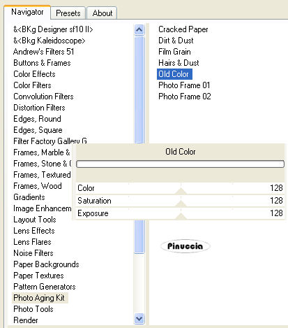 qui puoi trovare qualche risposta ai tuoi dubbi. Se l'argomento che ti interessa non è presente, ti prego di segnalarmelo. Occorrente: Materiale qui I tubes usati sono di Patry e Raz. Filtri: Penta.com qui L&K Dimitri qui Filters Unlimited qui Photo Aging Kit qui per usare Photo Aging Kit, bisogna importarlo in Filters Unlimited, come fare vedi qui Apri tutto il materiale in PSP. Metti i pennelli nella cartella dei pennelli. se hai problemi con i pennelli vedi qui 1. Apri una nuova immagine trasparente 600 x 450 pixels. 2. Livelli>Nuovo livello raster. 3. Selezione>Seleziona tutto. 4. Apri il tube "Raz2005 Misted NewYork City", e vai a Modifica>Copia. Torna al tuo lavoro e vai a Modifica>Incolla>Incolla nella selezione. 5. Selezione>Nessuna selezione. 6. Apri il tube della donna "PatryMists Nicole Kidman 004", e vai a Modifica>Copia. Torna al tuo lavoro e vai a Modifica>Incolla>Incolla come nuovo livello. Sposta il tube a sinistra.7. Rimani posizionato su questo livello della donna. Selezione>Seleziona tutto. Seleziona>Mobile. Selezione>Immobizza. Livelli>Nuovo livello raster. 10. Apri il file di sfondo "background" e vai a Modifica>Copia. Torna al tuo lavoro e vai a Modifica>Incolla>Incolla nella selezione. ti sembrerà strano, non preoccuparti. Continua tranquillo Selezione>Nessuna selezione. Abbassa l'opacità di questo livello al 55%. Dovresti avere questo: ![]() la trasparenza sparirà dopo, quando unirai i livelli, appiattendoli. 11. Attiva ora il livello di sfondo. Scegli un colora dall'immagine (io ho scelto #d0d0c3) e impostalo come colore di primo piano. Riempi il livello con il colore di primo piano.12. Rimani posizionato su questo livello. 13. Effetti>Plugins>Xero - Fritillary, con i settaggi standard. ![]() 14. Effetti>Plugins>Penta.com - Jeans, con i settaggi standard. ![]() 15. Livelli>Unisci>Unisci tutto (appiattisci). ![]() 16. Immagine>Aggiungi bordatura, 2 pixels, simmetriche, con il colore nero. 17. Immagine>Ridimensiona, all'85%, tutti i livelli selezionato. 18. Immagine>Aggiungi bordatura, 20 pixels, simmetriche, con il colore che hai usato per lo sfondo. 19. Seleziona questo bordo con la bacchetta magica ![]() ![]() Effetti>Plugins>Penta.com - Jeans, con i settaggi standard. ![]() 20. Mantieni selezionato. 21- Effetti>Effetti 3D>sfalsa ombra: ![]() Ripeti l'Effetto Sfalsa ombra, ma cambiando verticale e orizzontale a -6. 22. Selezione>Nessuna selezione. Immagine>Aggiungi bordatura, 2 pixels, simmetriche, con il colore nero. 23. Livelli>Nuovo livello raster. Imposta il colore di primo piano con il nero. 24. Attiva lo strumento Pennello ![]() Cerca e seleziona il pennello rtekst 13, e applicalo in basso. 25. Rimani su questo livello. Cerca e seleziona il pennello "cb newsprint5", e applicalo nell'angolo in alto a destra. fai attenzione; a volte è questo il motivo per cui ti sembra di non trovare un pennello; bisogna fare attenzione alla lettera con cui inizia il nome del pennello; in questo caso il pennello inizia con una "@", per cui lo troverai prima dell'alfabeto e non tra i pennelli della lettera "C". 26. Effetti>Effetti 3D>Sfalsa ombra, con i settaggi usati al punto 21, ma con il colore bianco. ![]() 27. Livelli>Unisci>Unisci tutto. 28. Livelli>Duplica. 29. Effetti>Plugins>Filters Unlimited - Photo Aging kit - Old Color: ![]() 30. Abbassa l'opacità di questo livello al 46%. 31. Livelli>Unisci>Unisci tutto. Immagine>Ridimensiona (se vuoi), all'85%, tutti i livelli selezionato. ![]() Se hai problemi o dubbi, o trovi un link non funzionante, o anche soltanto per un saluto, scrivimi. 20 Settembre 2007 |