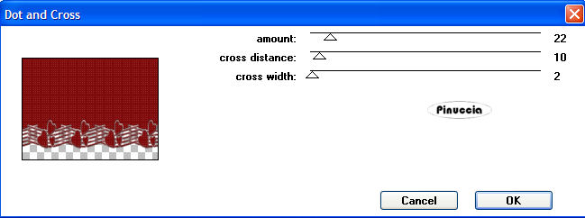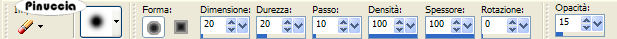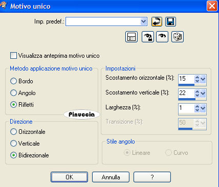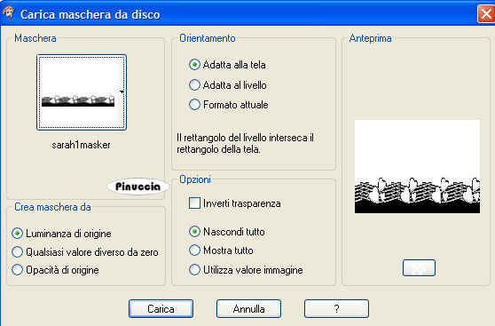 qui puoi trovare qualche risposta ai tuoi dubbi. Se l'argomento che ti interessa non è presente, ti prego di segnalarmelo. Occorrente: Materiale qui I tubes usati sono di Patry. Filtri: Penta.com qui Filters Unlimited qui FM Tile Tools qui per questo tutorial Jette ha creato uno script. Puoi vedere l'esempio qui Apri i tubes in PSP. Metti la maschera nella cartella maschere e il pennello nella cartella Pennelli. se hai problemi con i pennelli, vedi alcuni appunti qui. Per usare il pennello di questo tutorial ho uato l'importazione. 1. Apri una nuova immagine trasparente 600 x 450 pixels, e riempila con il colore bianco.2. Effetti>Plugins>Filters Unlimited - Paper Texture - Canvas fine, con i settaggi standard. 3. Livelli>Nuovo livello raster. Riempi il nuovo livello con il colore #7e0c0c.4. Livelli>Carica/Salva maschera>Carica maschera da disco: cerca e carica la maschera Sarah1 masker. ![]() 5. Livelli>Unisci>Unisci gruppo. 6. Effetti>effetti 3D>sfalsa ombra, con i seguenti settaggi ![]() 7. Effetti>Plugins>Penta.com - Dot and Cross: ![]() 8. Effetti>Effetti di bordo>Aumenta. 9. Abbassa l'opacità di questo livello (il livello della maschera) al 50%. 10. Livelli>Unisci>Unisci tutto. 11. Effetti>Effetti di immagine>Motivo unico: ![]() 12. Apri il tube PatryMists_06_ValentineD_03", e vai a Modifica>Copia. Torna al tuo lavoro e vai a Modifica>Incolla>Incolla come nuovo livello. Posiziona il tube al centro.Abbassa l'opacità del livello al 40%. 13. Apri il tube della donna "PatryMists PrincessSolitude", e vai a Modifica>Copia. Torna al tuo lavoro e vai a Modifica>Incolla>Incolla come nuovo livello. Sposta il tube a sinistra.Abbassa l'opacità del livello al 60%. 14. Attiva lo strumento Gomma ,e cancella la parte del tube che copre i cuori. ![]() questi sono i settaggi che ho usato, ma sei libero di decidere il settaggio che preferisci. ![]() 15. Apri il tube dell'uomo "Patry_Mists saddeyezz Sad", e vai a Modifica>Copia. Torna al tuo lavoroe vai a Modifica>Incolla>Incolla come nuovo livello. 16. Attiva nuovamente lo strumento Gomma ,e cancella la parte del tube che copre il bordo. ![]() 17. Livelli>Nuovo livello raster. 18. Attiva lo strumento Pennello ![]() cerca e seleziona il pennello Agi-confucius beauty, e applicalo con il colore #7e0c0c in basso, al centro. 19. Effetti>Effetti 3D>Sfalsa ombra: ![]() 20. Chiudi il livello inferiore. Livelli>Unisci>Unisci visibile. 21. Effetti>Plugins>FM Tile Tools - Blend Emboss, con i settaggi standard: ![]() 22. Effetti>Plugins>Xero - Porcelain, con i seguenti settaggi: ![]() 23. Aggiungi il tuo nome e/o il tuo watermark. 24. Livelli>Unisci>Unisci tutto. 25. Ripeti il passo 11: Effetti>Effetti di immagine>Motivo unico: ![]() se non intendi realizzare lo script, questo passaggio non è necessario. ![]() Se hai problemi o dubbi, o trovi un link non funzionante, o anche soltanto per un saluto, scrivimi. 20 Settembre 2007 |