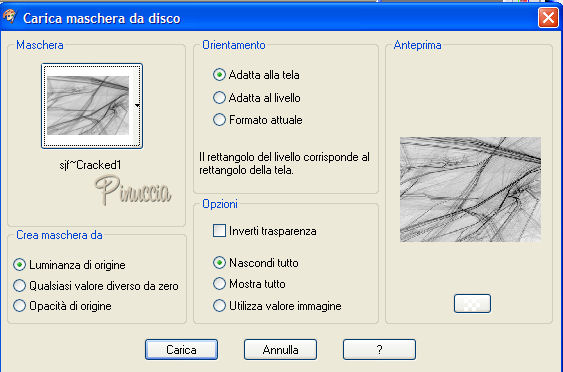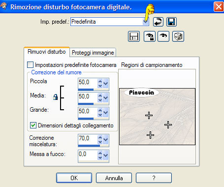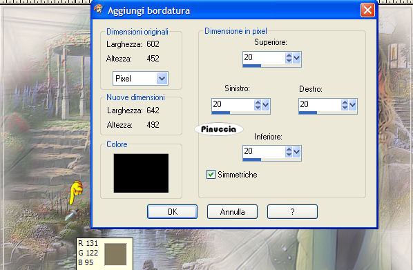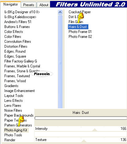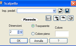 qui puoi trovare qualche risposta ai tuoi dubbi. Se l'argomento che ti interessa non è presente, ti prego di segnalarmelo. Questo tutorial è stato scritto in PSP 9, ma può essere eseguito con qualsiasi versione del programma. Occorrente: Materiale qui Filtri: Xero qui FM Tile Tools qui Bordermania qui Filters Unlimited qui Photo Aging Kit qui Photo Aging Kit si usa importato nel Filters Unlimited. Come fare vedi qui Apri i tubes in PSP e metti la maschera nella cartella Maschere. I tubes sono di Sandy e Kat, che ringrazio. 1. Apri una nuova immagine trasparente 600 x 450 pixels, e riempila con il colore #faebd7.2. Livelli>Carica/salva maschera>Carica maschera da disco. Cerca e carica la maschera maskerSjf-cracked1: ![]() 3. Livelli>Unisci>Unisci gruppo. 4. Effetti>Effetti 3D>Sfalsa ombra: ![]() 5. Abbassa l'opacità di questo livello al 55%. 6. Livelli>Unisci>Unisci tutto. 7. Regola>Correzione fotografica>Rimozione disturbo fotocamera digitale, con i settaggi standard. ![]() questo effetto tiene in memoria l'ultima impostazione utilizzata, anche dopo la chiusura del programma. Per questo è meglio aprire il menu delle impostazioni e selezionare Predefinita. Se stai usando PSP X: Regola>Rimozione disturbo fotocamera digitale. 8. Apri il tube sweetheart, e vai a Modifica>Copia. Torna al tuo lavoro e vai a Modifica>Incolla>Incolla come nuovo livello. Sposta il tube a sinistra, contro il bordo,in modo che la punta del gazebo non sia visibile. Abbassa l'opacità al 60%. 9. Apri il tube specialplace, e vai a Modifica>Copia. Torna al tuo lavoro e vai a Modifica>Incolla>Incolla come nuovo livello. Sposta il tube a destra, contro il bordo, come nel mio esempio.![]() Abbassa l'opacità di questo livello al 60%. 10. Apri il tube dei cigni "Swans" e vai a Modifica>Copia. Torna al tuo lavoro e vai a Modifica>Incolla>Incolla come nuovo livello. Abbassa l'opacità di questo livello al 60%. Sposta il tube in basso a sinistra, in mezzo ai due tubes, in modo che sembri un unico paesaggio.![]() 11. Apri il tube della donna e vai a Modifica>Copia. Torna al tuo lavoro e vai a Modifica>Incolla>Incolla come nuovo livello. Immagine>Ridimensiona, al 125%, tutti i livelli non selezionato. Sposta il tube in basso a destra.12. Chiudi il livello inferiore e vai a Livelli>Unisci>Unisci visibile. 13. Effetti>Plugins>FM Tile Tools - Blend Emboss, con i settaggi standard. ![]() 14. Effetti>Plugins>Xero - Porcelain, con i settaggi standard. ![]() 15. Rendi nuovamente visibile il livello inferiore e vai a Livelli>Unisci>Unisci tutto. 16. Regola>Correzione fotografica>Rimozione disturbo fotocamera digitale. 17. Selezione>Seleziona tutto. Selezione>Modifica>Contrai, di 4 pixels. 18. Selezione>Inverti. 19. Effetti>Plugins>Bordermania #Frame 2: ![]() 20. Effetti>Effetti 3D>Scalpello. ![]() 21. Selezione>nessuna selezione. 22. Immagine>Aggiungi bordatura, 1 pixel, simmetriche, con il colore nero. 23. Scegli un colore dal tube e impostalo come colore di primo piano. Immagine>Aggiungi bordatura, 20 pixels, simmetriche, con un colore scelto dall'immagine. Per scegliere il colore, appoggia il mouse sull'immagine, e vedrai la paletta dei colori con il contagocce: quando vedi il colore che ti piace clicca con il tasto sinistro del mouse e il colore sarà automaticamente impostato: ![]() 24. Seleziona il bordo con la bacchetta magica ![]() ![]() 25. Effetti>Plugins>Photo Aging Kit - Hairs and Dust: ![]() 26. Immagine>Aggiungi bordatura, 1 pixels, simmetriche, con il colore nero. 27. Immagine>Ridimensiona, all'80%, tutti i livelli selezionato. 28. Aggiungi il tuo nome e/o watermark e salva in formato jpg. ![]() Se hai problemi o dubbi, o trovi un link non funzionante, o anche soltanto per un saluto, scrivimi. 20 Settembre 2007 |