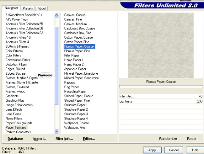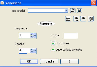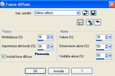 qui puoi trovare qualche risposta ai tuoi dubbi. Se l'argomento che ti interessa non è presente, ti prego di segnalarmelo. Occorrente: Materiale qui Filtri: Filters Unlimited 2.0 qui FM Tile Tools qui Fotomatic - Skygrad qui 1. Apri una nuova immagine trasparente 550 x 550 pixels, Imposta il colore di primo piano con #c5c4b7, e riempi l'immagine trasparente con il colore di primo piano.2. Effetti>Effetti di trama>Veneziana, con i seguenti settaggi: ![]() 3. Selezione>Seleziona tutto. Selezione>Modifica>Contrai - 30 pixels. 4. Livelli>Nuovo livello raster. Riempi nuovamente con il colore di primo piano #c5c4b7.5. Effetti>Plugins>Filters Unlimited 2.0 - Paper Textures - Fibrous Paper Coarse, settaggi 40-238: ![]() Selezione>Deseleziona. 7. Apri il tube del castello e vai a Modifica>copia. Torna al tuo lavoro e vai a Modifica>Incolla come nuovo livello. Spostalo , in alto,in modo che tocchi il bordo del secondo livello. Cambia la modalità di miscelatura di questo livello in Luminanza (esistente), e abbassa l'opacità al 70%. 8. Effetti>Plugins>FM Tile Tools - Blend Emboss, con i settaggi standard. ![]() 9. Apri il tube della scala, e vai a Modifica>copia. Torna al tuo lavoro e vai a Modifica>Incolla come nuovo livello. Sposta la scala in modo che si vedano le finestre del castello.Cambia la modalità di miscelatura di questo livello in Luminanza (esistente), e abbassa l'opacità al 40%. 10. Effetti>Plugins>FM Tile Tools - Blend Emboss, con i settaggi standard. 11. Apri il tube dell'angelo e vai a Modifica>Copia. Torna al tuo lavoro e vai a Modifica>Incolla come nuovo livello. Posizionalo in mezzo alla scala, vedi il mio esempio.12. Aggiungi il tuo nome e/o il tuo watermark. 13. Livelli>Unisci>Unisci tutto. 14. Selezione>Seleziona tutto. Selezione>Modifica>Contrai - 15 pixels. Selezione>Inverti. 15. Effetti>Effetti di riflesso>Caleidoscopio: ![]() 16. Effetti>Effetti 3D>Smusso a rilievo, con i seguenti settaggi: ![]() Selezione>Deseleziona. 17. Regola>Morbidezza>Fuoco diffuso: ![]() 18. Effetti>Plugins>Fotomatic - Skygrad, con i seguenti settaggi: ![]() 19. Se vuoi: Immagine>Ridimensiona, al 75%, e salva in formato jpg. ![]() Se hai problemi o dubbi, o trovi un link non funzionante, o anche soltanto per un saluto, scrivimi. 13 Maggio 2008 |