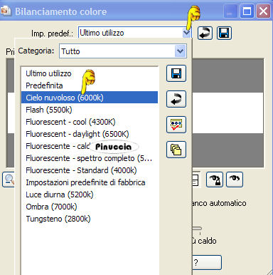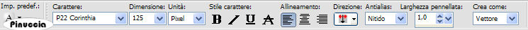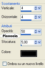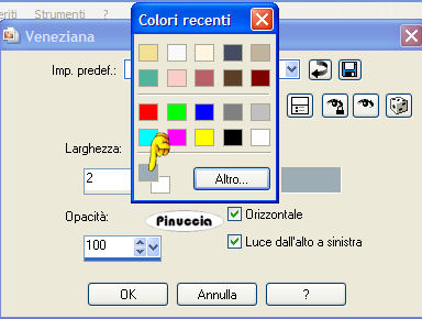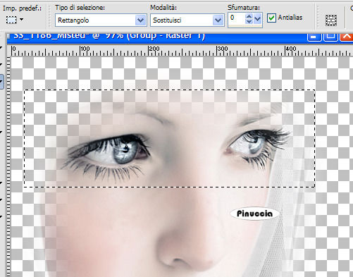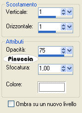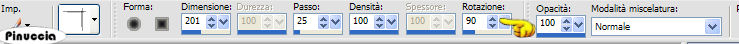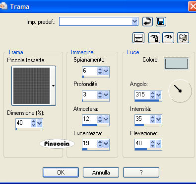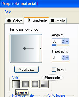 qui puoi trovare qualche risposta ai tuoi dubbi. Se l'argomento che ti interessa non è presente, ti prego di segnalarmelo. Occorrente: Materiale qui Diversi tubes, pennelli, font P22 Corinthia. Apri il font e minimizzalo nella tua area di lavoro. Lo troverai nella lista dei font disponibili, quando ti servirà. Se hai problemi con i pennelli vedi qui Imposta il colore di primo piano con #9cadb5, e il colore di sfondo con il bianco. 1. Apri una nuova immagine trasparente 700 x 500 pixels. 2. Passa il colore di primo piano a Gradiente di primo piano/sfondo, stile lineare, con i seguenti settaggi: ![]() Riempi l'immagine trasparente con questo gradiente.3. Apri il tube SS_1186_Misted, e vai a Modifica>Copia. (non chiuderlo perchè ti servirà ancora). Torna al tuo lavoro e vai a Modifica>Incolla>Incolla come nuovo livello. Effetti>Effetti di distorsione>Mulinello, 720 gradi: ![]() Effetti>Effetti di trama>Veneziana: cliccando con il tasto destro del mouse sulla paletta del colore, potrai selezionare velocemente i colori che hai impostato come primo piano e sfondo, in questo caso, clicca sulla paletta del colore di primo piano. ![]() Cambia la modalità di miscelatura di questo livello in Rafforza. 4. Attiva nuovamente il tube della donna e vai a Modifica>Copia. (non lo chiudere, ti servirà ancora). Torna al tuo lavoro e vai a Modifica>Incolla>Incolla come nuovo livello. Sposta il tube a sinistra.5. Attiva di nuovo il tube della donna. Con lo strumento Selezione , rettangolo,traccia una selezione intorno agli occhi: ![]() Modifica>Copia. Modifica>Incolla>Incolla come nuova IMMAGINE. Immagine>Rifletti. Livelli>Nuovo livello raster. Riempi il livello con il bianco.Livelli>Disponi>Sposta giù. Livelli>Unisci>Unisci tutto. Regola>Bilanciamento colore: apri il menu delle impostazioni predefinite cliccando sulla freccia indicata dalla manina, e nella lista delle impostazioni seleziona "cielo nuvoloso": ![]() Se stai usando PSP 9, non troverai questo preset che è standard in PSP X. Se ti serve, prendilo qui Immagine>Aggiungi bordatura, 1 pixel, simmetriche, con il colore di primo piano. Modifica>Copia. Torna al tuo lavoro e vai a Modifica>Incolla>Incolla come nuovo livello. Sposta l'immagine a destra.Livelli>Disponi>Sposta giù. 6. Nella paletta dei livelli attiva il livello Raster 2. 7. Livelli>Nuovo livello raster. 8. Attiva lo strumento Pennello ![]() Cerca e seleziona il pennello geo4, e applicalo sopra gli occhi, con il colore di primo piano, tre volte, facendo attenzione che tra i tre pennelli ci sia la stessa distanza. ![]() Sposta l'immagine degli occhi,in modo che il suo bordo combaci con la linea del pennello. ![]() 9. Nella paletta dei livelli attiva il livello Raster 5 (il livello del pennello). 10. Cerca e seleziona il pennello lynd04-042 002, e applicalo con il colore bianco (quindi cliccando con il tasto destro del mouse), sulle strisce. 11. Livelli>Nuovo livello raster. 12. Imposta il colore di sfondo con #3d4b5c. Cerca e seleziona il pennello white-lelie-Vika, e applicalo con il tasto destro del mouse, per usare il colore di sfondo, nell'angolo in basso a destra. 13. Livelli>Unisci>Unisci tutto. ![]() 14. Livelli>nuovo livello raster. 15. Cerca e seleziona il pennello wlj093004corner, imposta la rotazione a 90 gradi: ![]() e applicalo sopra gli occhi cliccando con il tasto destro del mouse, per usare il colore di sfondo. ![]() 16. Livelli>Unisci>Unisci tutto. 17. Immagine>Aggiungi bordatura, 1 pixel, simmetriche, con il colore bianco. Immagine>Aggiungi bordatura, 1 pixel, simmetriche, con il colore di primo piano. Immagine>Aggiungi bordatura, 1 pixel, simmetriche, con il colore bianco. 18. Apri una nuova immagine 820 x 560 pixels, e riempila con il colore di sfondo.19. Effetti>Effetti di trama>Trama, seleziona la trama Piccole fossette, con i seguenti settaggi: ![]() 20. Torna al primo lavoro e vai a Modifica>Copia. Attiva l'immagine 820x560 e vai a Modifica>Incolla>Incolla come nuovo livello. 21. Effetti>Effetti 3D>Sfalsa ombra: ![]() Ripeti l'Effetto Sfalsa ombra, ma cambiando verticale e orizzontale a -4. 22. Apri Scraptube 22 e vai a Modifica>Copia. Torna al tuo lavoro e vai a Modifica>Incolla>Incolla come nuovo livello. Immagine>Ruota>Ruota per gradi, 45 gradi a destra. ![]() Sposta questo tube nell'angolo in basso a destra.23. Livelli>Disponi>Sposta giù. 24. Livelli>Unisci>Unisci tutto. 25. Apri il tube Button e vai a Modifica>Copia. Torna al tuo lavoro e vai a Modifica>Incolla>Incolla come nuovo livello. Spostalo nell'angolo in alto a sinistra.Ripeti per gli altri tre angoli. 26. Attiva lo strumento Testo ,chiudi il colore di primo piano, seleziona il font P22 Corinthia, con i seguenti settaggi: ![]() Scrivi "Shining Eyes". Livelli>Converti in livello raster. Effetti>Effetti 3D>Sfalsa ombra: ![]() 27. Livelli>Unisci>Unisci tutto. 28. Immagine>Aggiungi bordatura, 1 pixel, simmetriche, con il colore bianco. 29. Aggiungi il tuo nome e/o il tuo watermark e salva in formato jpg. ![]() Se hai problemi o dubbi, o trovi un link non funzionante, o anche soltanto per un saluto, scrivimi 25 Agosto 2007 |