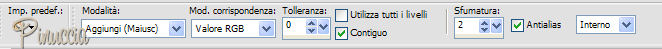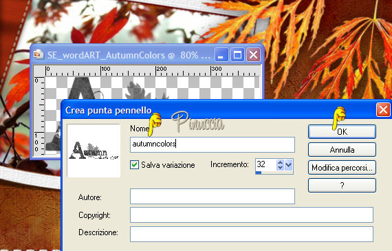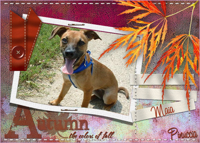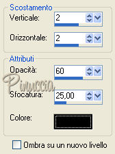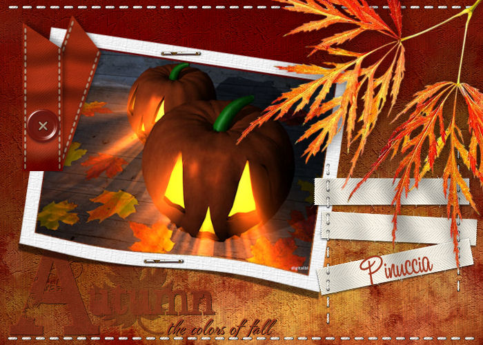 qui puoi trovare qualche risposta ai tuoi dubbi. Se l'argomento che ti interessa non è presente, ti prego di segnalarmelo. Occorrente: Materiale qui Il materiale scrap è di Scrappy Expressions Il tube delle foglie è di Jet Per questo tutorial puoi usare delle foto a tua scelta. Vedi altri esempi in fondo al tutorial. Apri tutto il materiale in PSP. Apri una nuova immagine trasparente 700 x 500 pixels. Selezione>Seleziona tutto. Attiva "SE_Intensity_Paper_2", e vai a Modifica>Copia. Torna al tuo lavoro e vai a Modifica>Incolla>Incolla nella seleizone. Selezione>Nessuna selezione. Attiva BentPhoto_1, e vai a Modifica>Copia. Torna al tuo lavoro e vai a Modifica>Incolla>Incolla come nuovo livello. Sposta l'immagine a sinistra.Attiva lo strumento bacchetta magica , sfumatura 2.![]() Clicca all'interno della cornice per selezionarla. Apri l'immagine o la foto che hai deciso di usare, (con il materiale trovi l'immagine "Twopunpkinsjack1600"), e vai a Modifica>Copia. Torna al tuo lavoro e vai a Modifica>Incolla>Incolla nella selezione. Selezione>Nessuna selezione. ![]() Attiva il tube del nastro "SE_Intensity_Ribbon" e vai a Modifica>Copia. Torna al tuo lavoro e vai a Modifica>Incolla>Incolla come nuovo livello. Sposta il nastro a sinistra.![]() Attiva il tube "SE_Perfection_Stitchedlabels", e vai a Modifica>Copia. Torna al tuo lavoro e vai a Modifica>Incolla>Incolla come nuovo livello. Sposta l'etichetta a destra.![]() Attiva il tube "SE_Perfection_Stitches_set1". Posizionati sul livello inferiore e vai a Modifica>Copia. Torna al tuo lavoro e vai a Modifica>Incolla>Incolla come nuovo livello. Sposta la cucitura in alto.Livelli>Duplica. Immagine>Capovolgi. Attiva il tube "fall_leaves", e vai a Modifica>Copia. Torna al tuo lavoro e vai a Modifica>Incolla>Incolla come nuovo livello. Sposta il tube in alto a destra.![]() Effetti>Effetti 3D>Sfalsa ombra, con i seguenti settaggi, colore nero. ![]() Attiva il livello di sfondo (Raster 1). ![]() Apri wordart_Autumncolors, e vai a Modifica>Copia. File>Esporta>come pennello personalizzato, assegna un nome al pennello e clicca ok. ![]() Attiva lo strumento Pennello ,cerca e seleziona il pennello Autumncolors, e applicalo con un bel colore scuro preso dall'immagine in basso a sinistra. Aggiungi un testo o il tuo nome nell'etichetta. Livelli>Unisci>Unisci tutto, e salva in formato jpg. ![]() ![]() ![]() ![]() Se hai problemi o dubbi, o trovi un link non funzionante, o anche soltanto per un saluto, scrivimi. 22 Settembre 2007 |