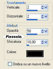qui puoi trovare qualche risposta ai tuoi dubbi. Se l'argomento che ti interessa non è presente, ti prego di segnalarmelo. Occorrente: Materiale qui Filtri Filters Unlimited 2.0 qui Lo scrapset è di Scrappy Expressions Il tube è di Marif Apri il materiale in PSP e metti il pennello nella cartella dei Pennelli. Apri una nuova immagine BIANCA 700 x 500 pixels. Livelli>nuovo livello raster. Selezione>Seleziona tutto. Attiva paper2 e vai a Modifica>Copia. Torna alla tua immagine trasparente e vai a Modifica>Incolla>Incolla nella selezione. Selezione>Nessuna selezione. Effetti>Plugins>Filters Unlimited 2.0 - Edges Square - Square edge 13. Effetti>Effetti 3D>Sfalsa ombra, con i seguenti settaggi, colore nero. ![]() Livelli>Nuovo livello raster. Selezione>Seleziona tutto. Attiva Paper3 e vai a Modifica>Copia. Torna al tuo lavoro e vai a Modifica>Incolla>Incolla nella selezione. Selezione>Nessuna selezione. Effetti>Plugins>Filters Unlimited - Edges Square - Square edge 04. Immagine>Ridimensiona, all'85%, bicubica, tutti i livelli non selezionato. ![]() Ripeti Immagine>Ridimensiona, ma questa volta al 95%. Immagine>Ruota>Ruota per gradi, 10 gradi a sinistra: ![]() Effetti>Effetti 3D>Sfalsa ombra, con i settaggi precedenti. Ripeti l'Effetto Sfalsa ombra, ma cambiando verticale e orizzontale a -2. Livelli>Nuovo livello raster. Selezione>Seleziona tutto. Attiva Paper1 e vai a Modifica>Copia. Torna al tuo lavoro e vai a Modifica>Incolla>Incolla nella selezione. Selezione>Nessuna selezione. Effetti>Plugins>Filters Unlimited 2.0 - Edges Square - Square edge 17. Immagine>Ridimensiona, all'85%, tutti i livelli non selezionato, 2 volte. Immagine>Ruota>Ruota per gradi, 10 gradi a destra. ![]() Effetti>Effetti 3D>Sfalsa ombra, con i seguenti settaggi, colore nero: ![]() Ripeti l'Effetto Sfalsa ombra, ma cambiando verticale e orizzontale a -2. ![]() Attiva il tube "SE_WeekendFreebie_AutumnFavorites_doodleart" e vai a Modifica>copia. Torna al tuo lavoro e vai a Modifica>Incolla>Incolla come nuovo livello. Spostalo a sinistra.Attiva il tube "Marif_2007_08Aout_lady0373" e vai a Modifica>copia. Torna al tuo lavoro e vai a Modifica>Incolla>Incolla come nuovo livello. Attiva il tube della cornice "SE_WeekendFreebie_AutumnFavorites Frame" e vai a Modifica>copia. Torna al tuo lavoro e vai a Modifica>Incolla>Incolla come nuovo livello. Sposta correttamente la cornice sopra il tube.Eventualmente, collega i due livelli - cliccando dove indica la manina e facendo apparire lo stesso numero per entrambi i livelli. Questo farà sì, che spostando uno dei due livelli, contemporaneamente si sposti anche l'altro. ![]() Attiva il tube "SE_WeekendFreebie_AutumnFavorites_Journaling", e vai a Modifica>copia. Torna al tuo lavoro e vai a Modifica>Incolla>Incolla come nuovo livello. Immagine>Ruota>Ruota per gradi, 10 gradi a sinistra. Sposta la targhetta come nel mio esempio.Livelli>Disponi>Sposta giù. Effetti>Effetti 3D>Sfalsa ombra, con i seguenti settaggi, colore nero: ![]() Attiva il livello Raster 1 (il livello bianco). ![]() Attiva lo strumento Pennello ![]() Cerca e seleziona il pennello agi_mapleleaves. Imposta un bel colore, per esempio beige, e applicalo sullo sfondo bianco. Ho verificato che il pennello non funziona con PSP 9. Se stai usando questa versione del programma, puoi esportare il file che ho convertito per PSP 9 e che trovi qui Vedi qui come esportare un pennello. Aggiungi il tuo nome e/o il tuo watermark e salva in formato jpg. ![]() ![]() Se hai problemi o dubbi, o trovi un link non funzionante, o anche soltanto per un saluto, scrivimi. 9 settembre 2007 |